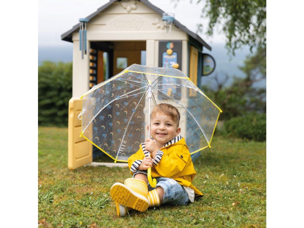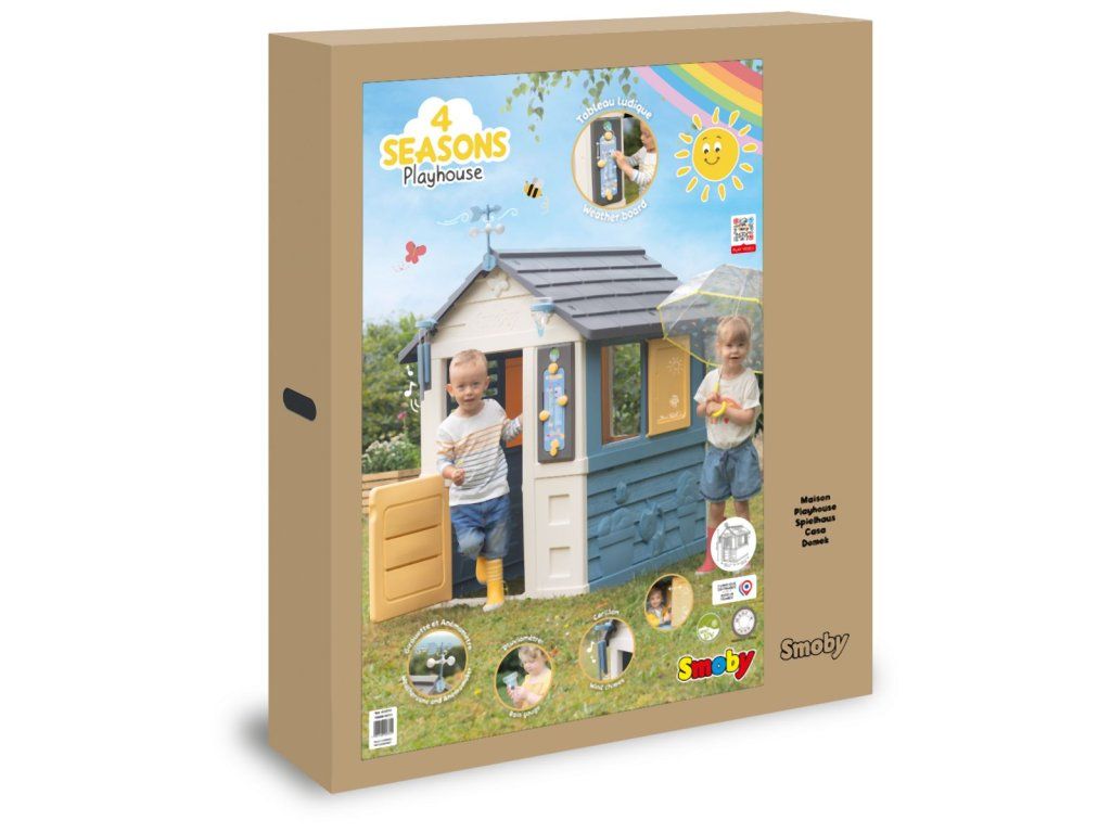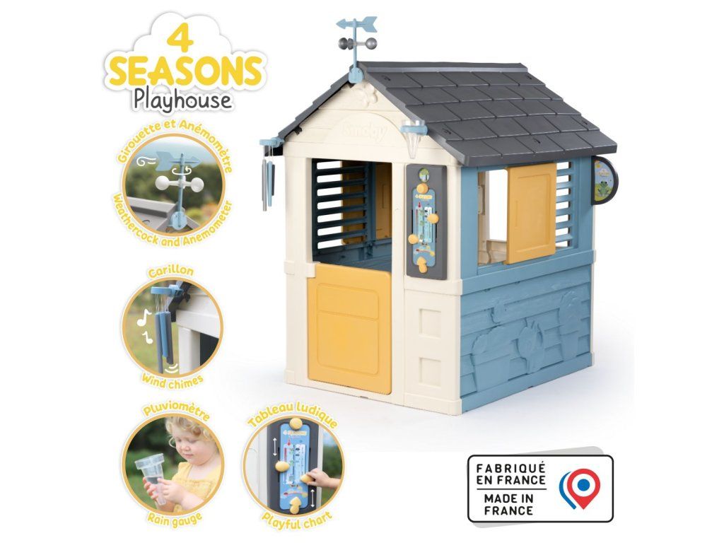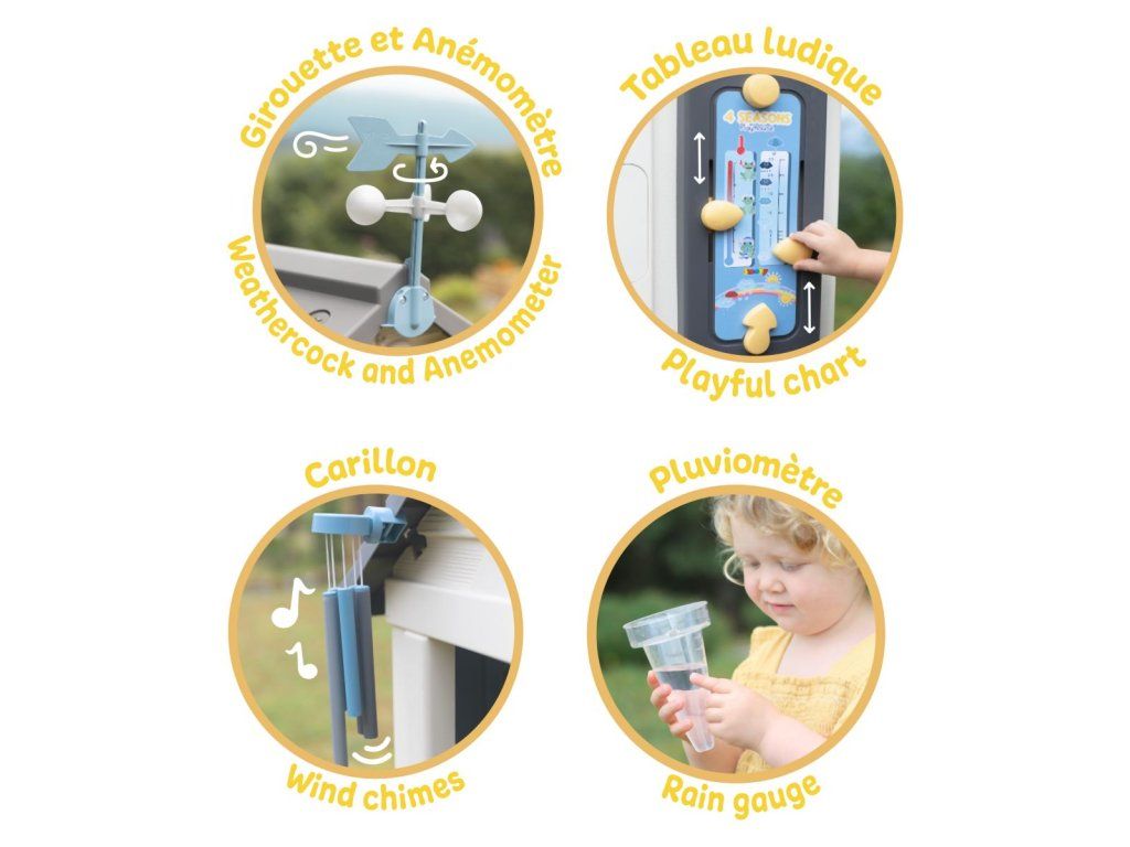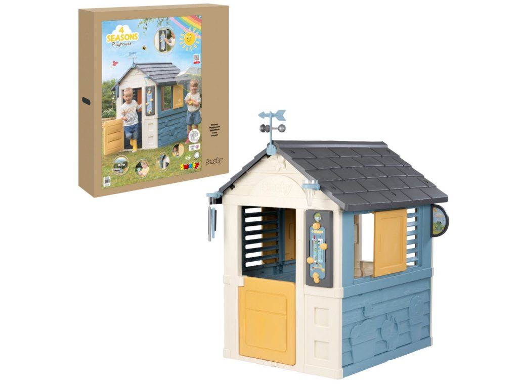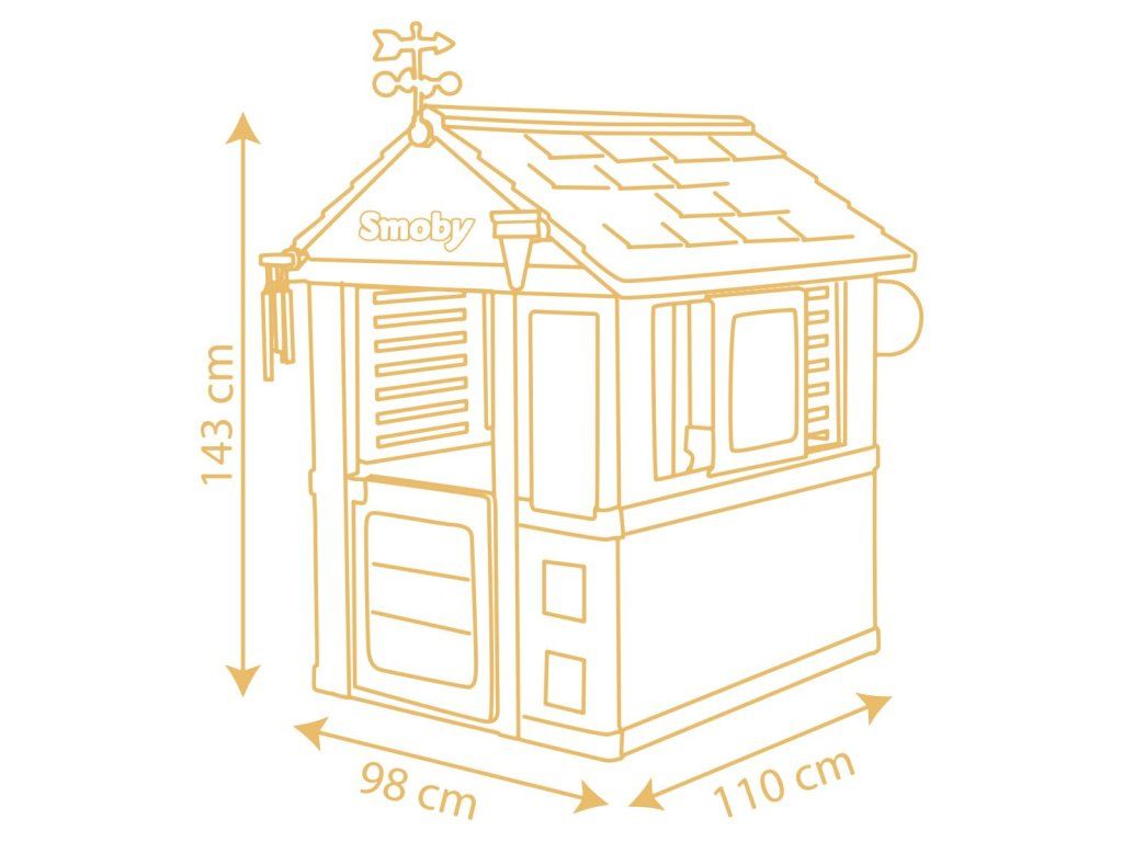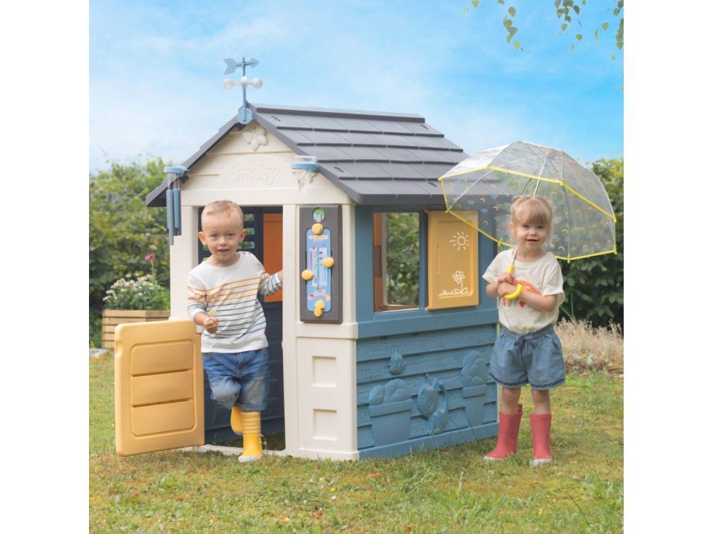 Stabilný, priestranný domček Smoby Meteostanica. Súčasťou vybavenia domčeka je zrážkomer, strešný veterný smerovník/anemometer, zvonkohra a hravá tabuľka, ktoré deťom zaistia množstvo zábavy, kreativity i učenia. Domček má malé vstupné dvere, 2 okná s lamelami a 2 posuvné okenice, ktoré je možné otvárať a zatvárať. Jednoduchá montáž. Módne farebné prevedenie v modrej a žltej dodáva herni svieži a moderný vzhľad. Štyri robustné bočné steny sú navrhnuté veľmi detailne, fasádu domu zdobia kvety v kvetináčoch, zvieratká a motýliky, ktorí vytvárajú zábavný dizajn. Domček je vyrobený z vysoko kvalitného plastu odolného voči UV žiareniu a je obzvlášť odolný voči poveternostným vplyvom a vyblednutiu. Rozmery produktu (DxŠxV): 102,7 x 121,8 x 143,4 cm. Výška samotného domčeka je 127 cm, výška so strešným veterným smerovníkom je 147,5 cm.Dodatočné parametre
