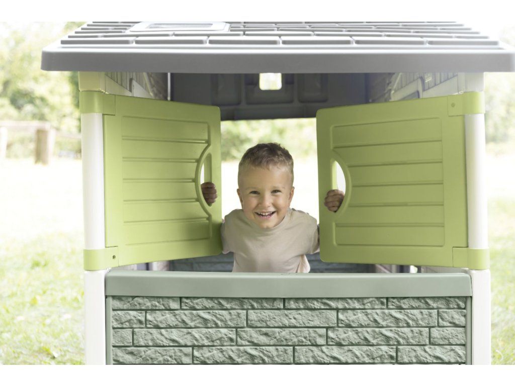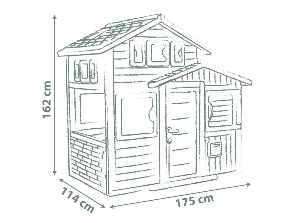 Priestranný záhradný domček s výškou 1,6 m má predné plné dvere s kukátkom a zadné polovičné (slúžiace ako tajný priechod), 6 okien, 2 okenice otočné o 360 ° a funkčnú poštovú schránku. Domček je možné rozšíriť o ďalšie príslušenstvo. Tento výrobok obsahuje minimálne 61 % recyklovaného materiálu a je 100 % recyklovateľný. Plastové diely sú ošetrené proti UV žiareniu pre dobrú odolnosť a dlhšiu trvanlivosť farieb v priebehu času. Tento dom bol navrhnutý tak, aby vyhovoval všetkým doplnkom Smoby, ako je letná kuchyňa, piknikový stôl, odkvap s nádržou na vodu, solárna lampa alebo zvonček. Rozmery domčeka (DXŠXV): 175 x 115 x 162 cm.Dodatočné parametre