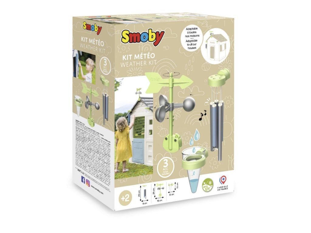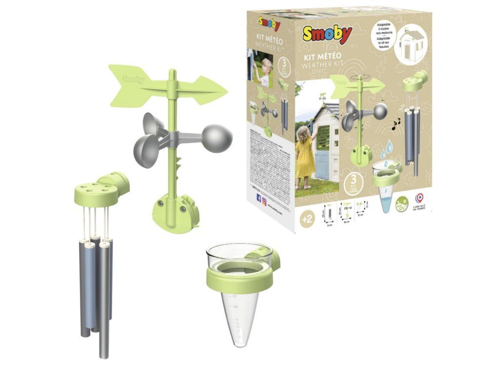 Hracia sada meteorologická stanica na skúmanie počasia: zvonkohra, veterná korouhvička/anemometer a zrážkomer. Sada je kompatibilná so všetkými domčekmi Smoby. S touto sadou môžu deti objavovať a pozorovať javy počasia. Možno ľahko pripevniť. Súprava je vyrobená z vysoko kvalitného plastu odolnému voči UV žiareniu a je obzvlášť odolná voči poveternostným vplyvom a vyblednutiu.Dodatočné parametre