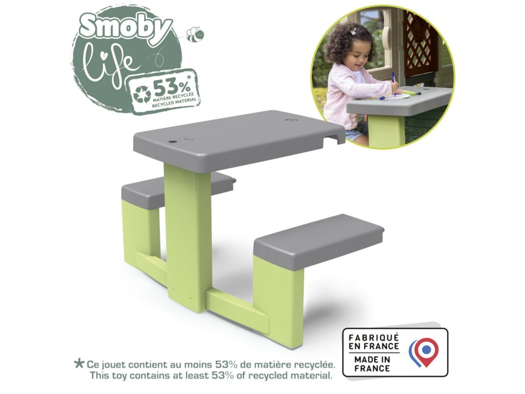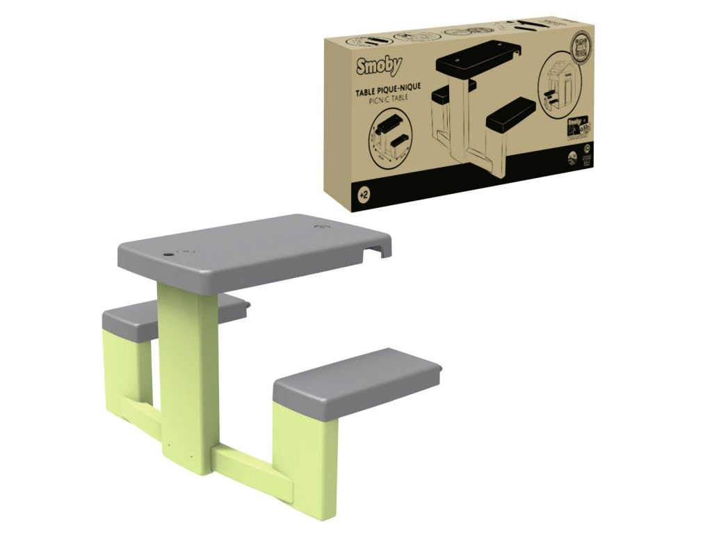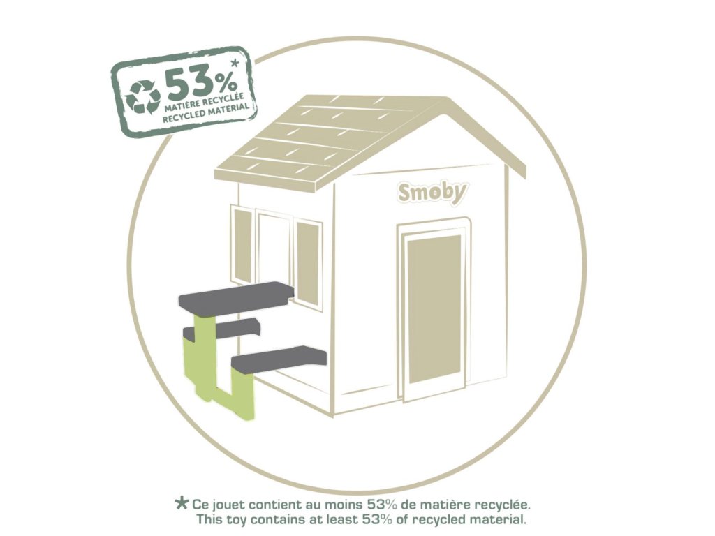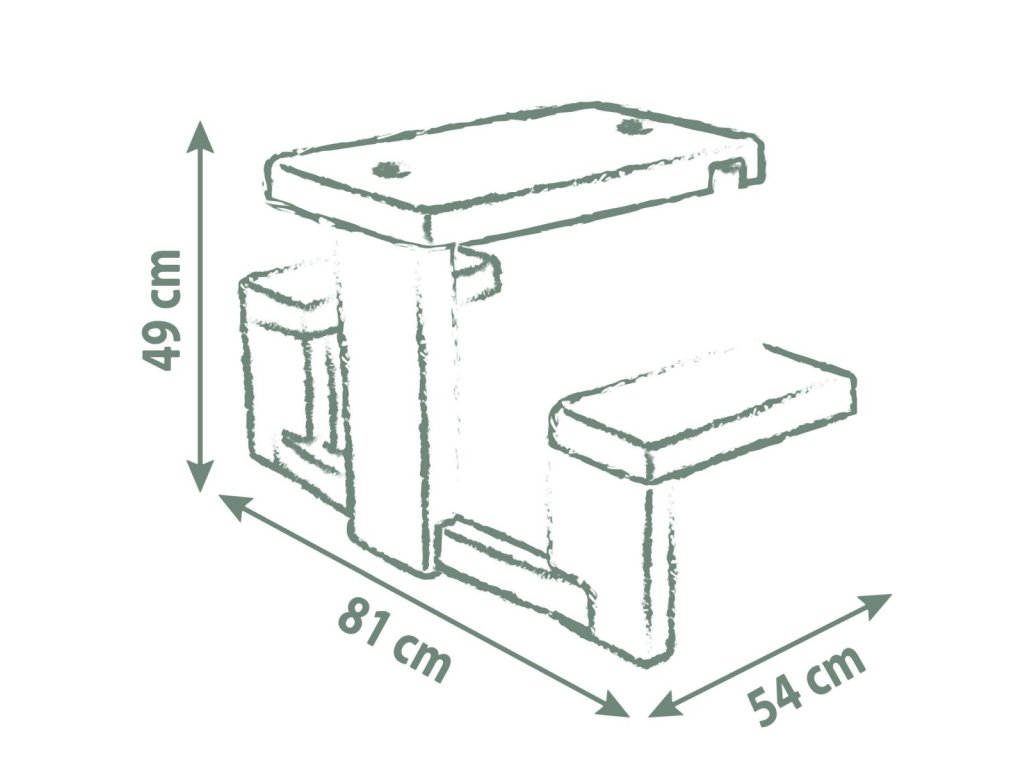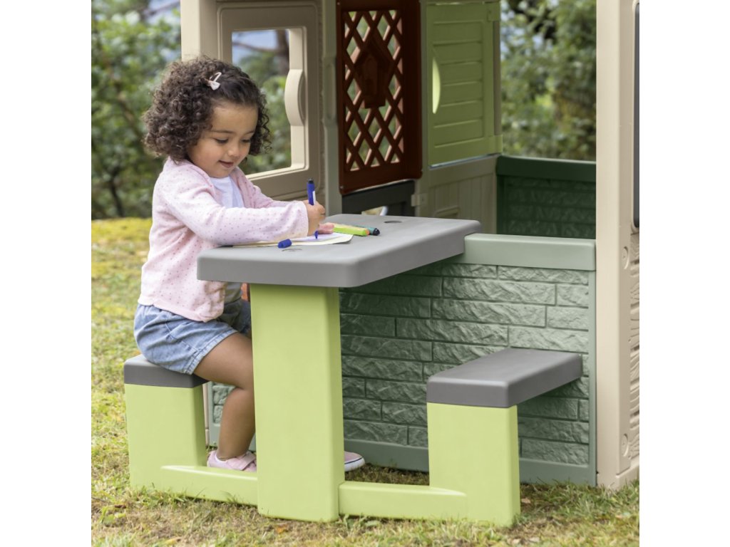 Piknikový stolček s 2 lavicami pre deti ako doplnok pre domček Neo Jura Lodge, My New House, Chef House a Evo Friends House. Anti-UV ošetrenie zaručuje dobrú odolnosť a trvanlivosť farieb. Výška stolčeka 49 cm. Dĺžka lavice 81 cm. Max. nosnosť každej lavice 50 kg. Rozmery (DxŠxV): 81 x 54 x 49 cm. Farba zelená a šedá. Tento výrobok obsahuje minimálne 53 % recyklovaného materiálu.Dodatočné parametre