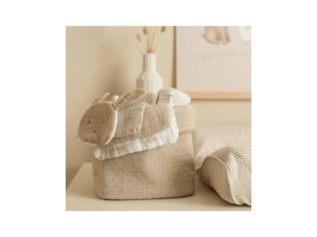 Košík v krásnom pletenom prevedení je vyrobený z pevného bavlneného materiálu. Využijete ho na prehľadné uloženie všetkého, čo potrebujete mať po ruke pri každodennej starostlivosti o vaše bábätko. Okraj umožňuje prispôsobiť výšku košíka vašim potrebám.