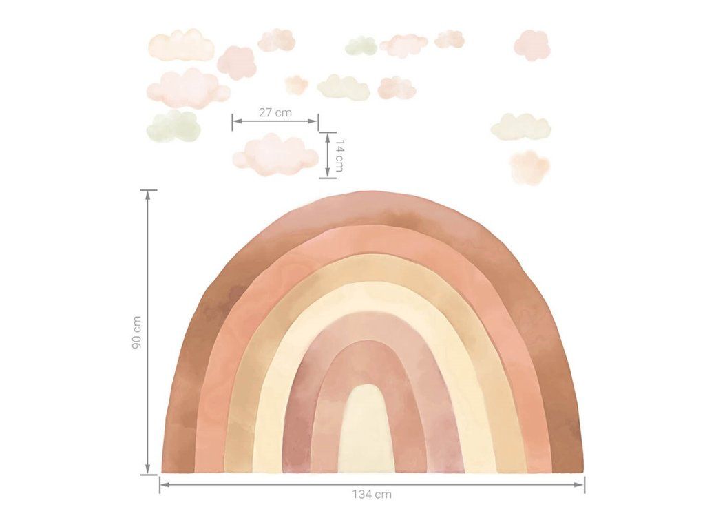 Krásna nálepka na stenu Dúha. Akvarel dúha bude vyzerať skvele v každej detskej izbičke. Jemné, skutočne svetlé farby dodávajú stene osobitý charakter. Dúhové samolepky sú vďaka svojej veľkej ploche ideálne na nalepenie za posteľ, alebo do detského kútika. Sú krásnou dekoráciou, zároveň chránia stenu pred nečistotami alebo poškodením. Samolepka je zaistená špeciálnym matným laminátom, ktorý ju chráni pred poškriabaním pri každodennom používaní a zároveň uľahčuje lepenie – fólia je silnejšia a ľahšie sa prenáša na stenu. Rozmiestnenie jednotlivých častí na stenu je možné podľa vašej fantázie. Ak hľadáte dokonalý spôsob, ako oživiť detskú izbičku, naše samolepky na stenu sú tou správnou voľbou. Objednajte si ich ešte dnes a urobte radosť svojmu dieťaťu. Táto sada obsahuje: dúhu a mraky. Presné rozmery každej časti nálepky sú uvedené na poslednej fotografii.Dodatočné parametre