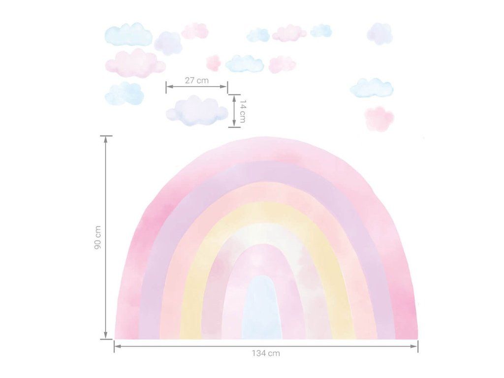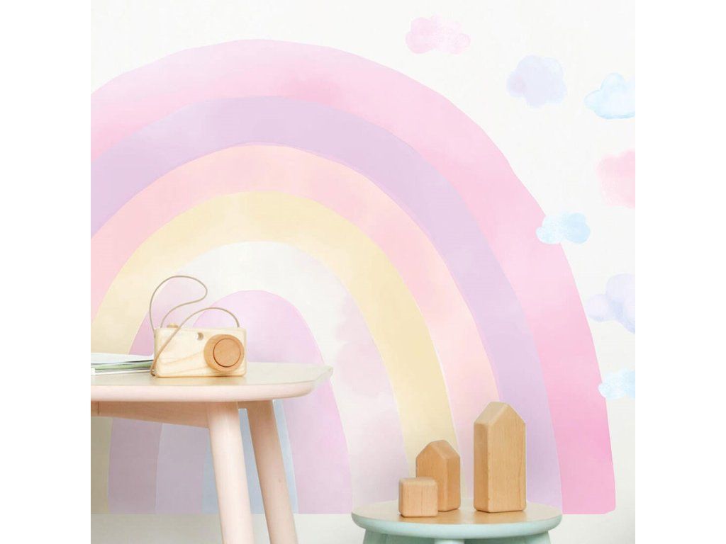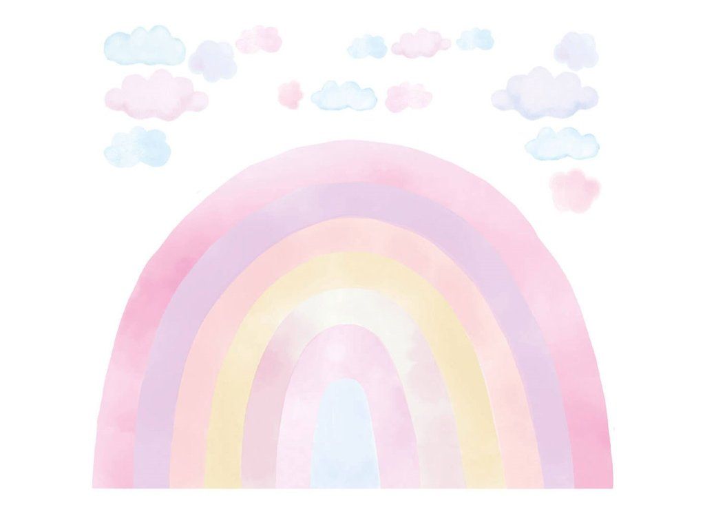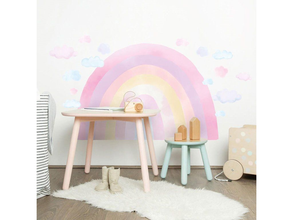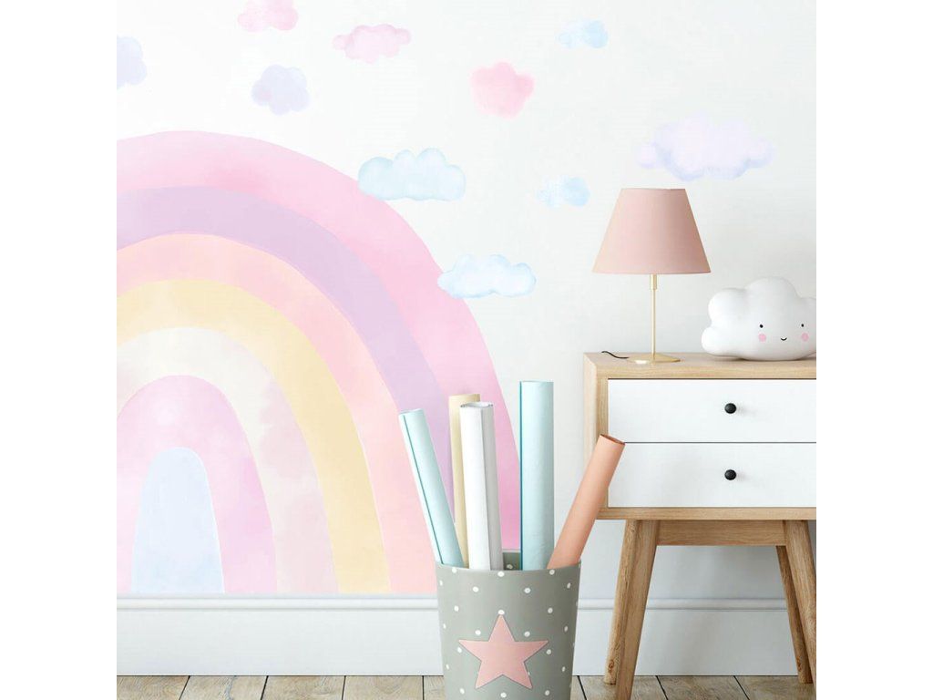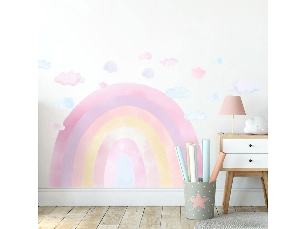 Krásna nálepka na stenu Dúha. Akvarel dúha bude vyzerať skvele v každej detskej izbičke. Jemné, skutočne svetlé farby dodávajú stene osobitý charakter. Dúhové samolepky sú vďaka svojej veľkej ploche ideálne na nalepenie za posteľ, alebo do detského kútika. Sú krásnou dekoráciou, zároveň chránia stenu pred nečistotami alebo poškodením. Samolepka je zaistená špeciálnym matným laminátom, ktorý ju chráni pred poškriabaním pri každodennom používaní a zároveň uľahčuje lepenie – fólia je silnejšia a ľahšie sa prenáša na stenu. Rozmiestnenie jednotlivých častí na stenu je možné podľa vašej fantázie. Ak hľadáte dokonalý spôsob, ako oživiť detskú izbičku, naše samolepky na stenu sú tou správnou voľbou. Objednajte si ich ešte dnes a urobte radosť svojmu dieťaťu. Táto sada obsahuje: dúhu a mraky. Presné rozmery každej časti nálepky sú uvedené na poslednej fotografii.Dodatočné parametre