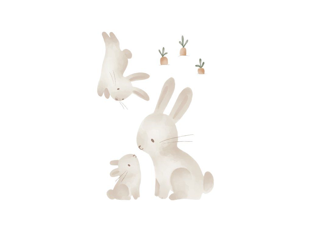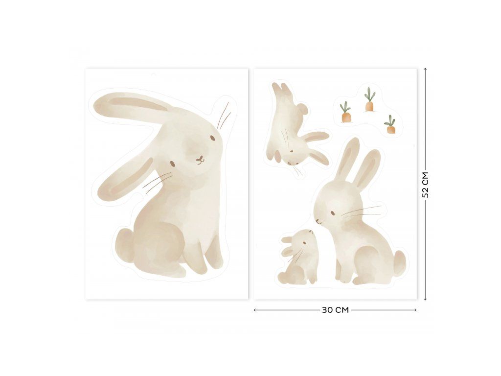 Krásne samolepky v podobe králičej rodinky a mrkvičiek sú určené na použitie na stene, okne či akomkoľvek hladkom a rovnom povrchu. Stanú sa krásnou dekoráciou v detskej izbe a budú pomáhať rozvíjať fantáziu vášho dieťaťa. Samolepky z vinylového materiálu s matným povrchom a priehľadnými okrajmi sa ľahko aplikujú a ľahko ich aj odstránite.