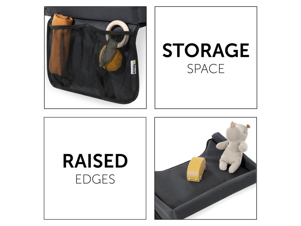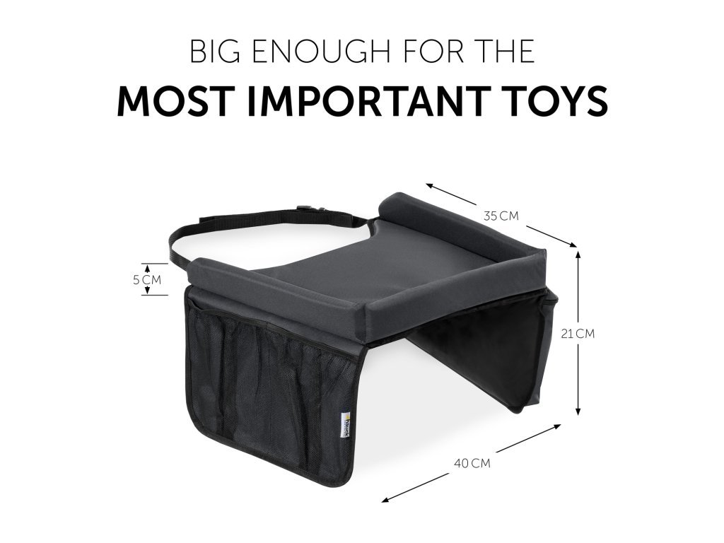 Na dlhé cesty // Tento mäkko polstrovaný hrací stôl má otvory na bruško as plochou ca. 40 x 35 cm ponúkne dostatok miesta na tie najobľúbenejšie hračky. Vyvýšený okraj zabráni vykĺznutiu hračiek zo stolíka. Play On Me je umývateľný, je možné zložiť av nutných prípadoch zaručí prístup k dieťaťu.