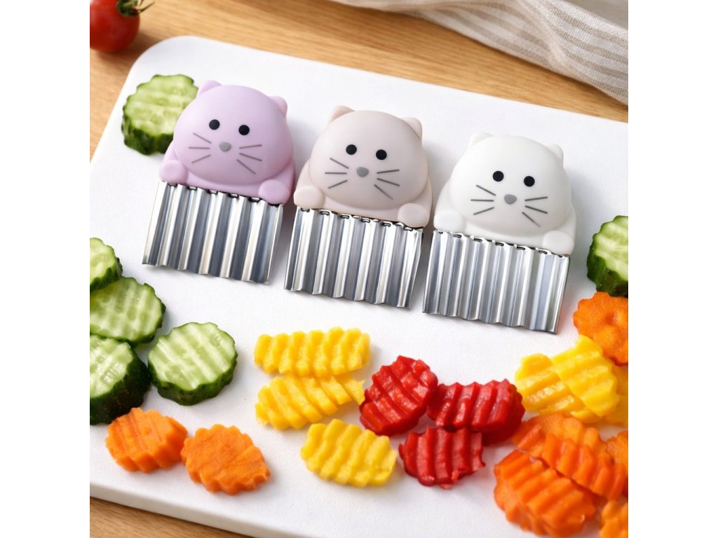 Odolné nože z nerezovej ocele s rukoväťami v dizajne roztomilej mačičky umožňujú ľahké krájanie a kosenie zeleniny, ovocia a ďalších potravín! Ľahko a hravo s nimi vytvoríte domáce vlnité hranolky, šaláty, sendviče, syry, sušienky a mnoho ďalšieho! Vyberte si z 3 rôznych designov čepele - vlnkovaná, cik-cak alebo hranatá. Rôzna textúra krájania podporí záujem detí o jedlo a najmenším deťom uľahčí samostatnosť pri stravovaní a servírovaní klzkých potravín.