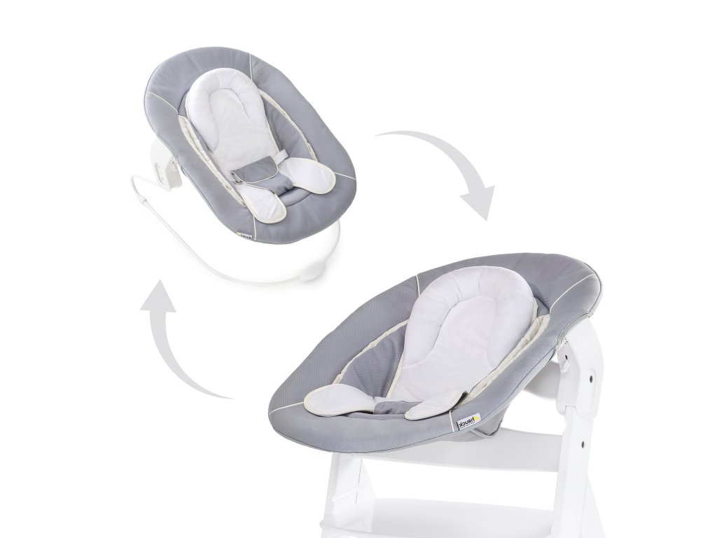 Prechod z nástavca na vysokú stoličku na kresielko pre bábätko je veľmi ľahký. Jedným pohybom rúk odpojíte nástavec od vysokej stoličky, rýchlo a bezpečne ho nasadíte na dodaný rám a už môžete nástavec Alpha používať ako kresielko. Pohyb dieťaťa spôsobuje, že sa kresielko jemne hojdá tam a späť a má upokojujúci účinok.