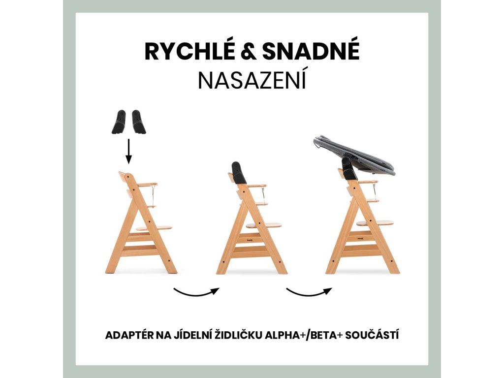 Chcete mať svoje dieťatko neustále pri sebe? Kresielko BOUNCER 3v1 je dodávané spolu s adaptérom, ktorý ho umožňuje nasadiť na konštrukciu vašej drevenej stoličky hauck Alpha+ alebo Beta+. Vďaka tomu môžete svoju stoličku používať už od narodenia a vaše dieťatko môže „sedieť“ s vami pri stole.