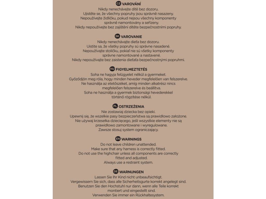UPOZORNENIE! Nikdy nenechávajte dieťa bez dozoru. Uistite sa, že všetky popruhy sú správne nasadené. Nepoužívajte stoličku, pokiaľ nie sú všetky komponenty správne namontované a nastavené. Nikdy nepoužívajte bez zaistenia dieťaťa bezpečnostnými popruhmi.