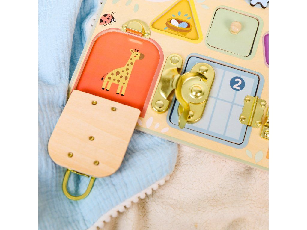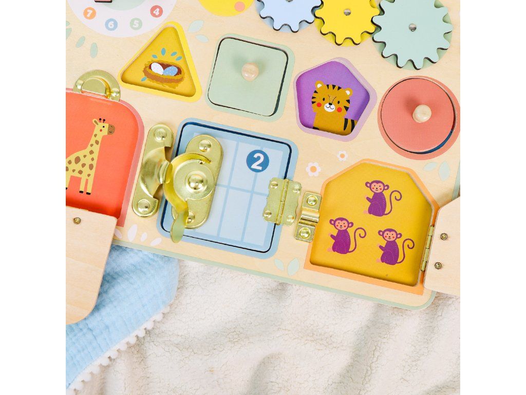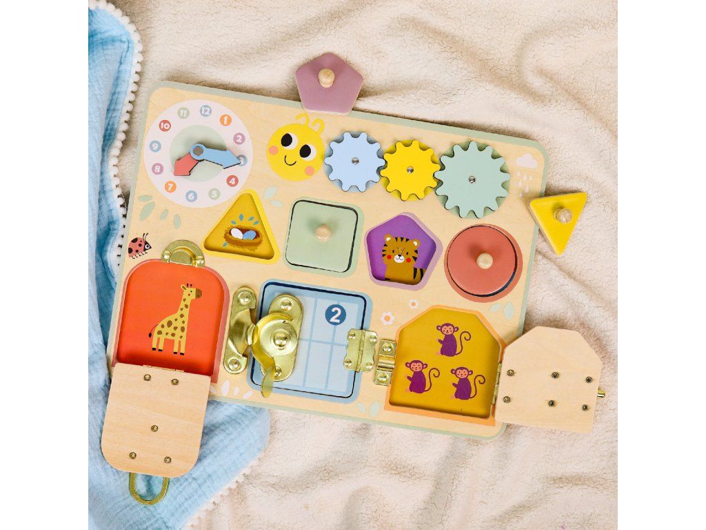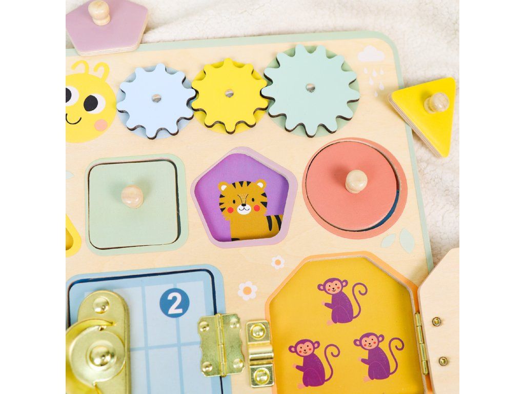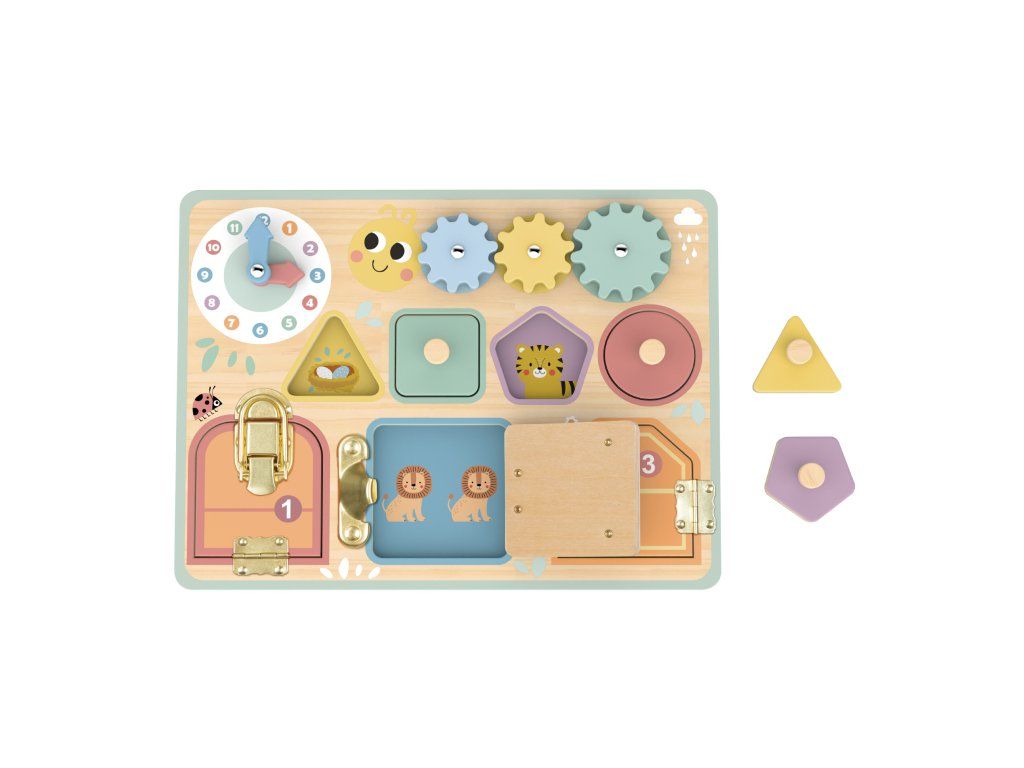 Activity Board PastelMini mechanizmy pre zvedavé ručičky – interaktívna hračka, ktorá učí hrouVstúpte do sveta drobných zámkov, ozubených kolies a vkladacích tvarov – tento panel s aktivitami od značky Tooky Toy kombinuje viacero aktivít v jednom elegantnom pastelovom prevedení.Aktivity, ktoré deti vtiahnu do hryObsahuje 4 rôzne aktivity – hodiny s pohyblivými ručičkami, ozubené kolieska, vkladacie puzzle a zámkové mechanizmy.Učia deti rozpoznávať tvary, farby, čísla a sledovať príčinu a následok – ideálne pre motorický a kognitívny rozvoj.Vyrobené z kvalitného dreva z udržateľného lesníctva, natreté netoxickými farbami – rodičia môžu byť pokojní.Jemné pastelové farby v kombinácii s kompaktným prevedením dopĺňajú detskú izbu a zároveň podporujú sústredenie.Vhodné ako darček pre deti od približne 18 mesiacov – na prvé veľké „samostatné“ hranie.Dodatočné parametre