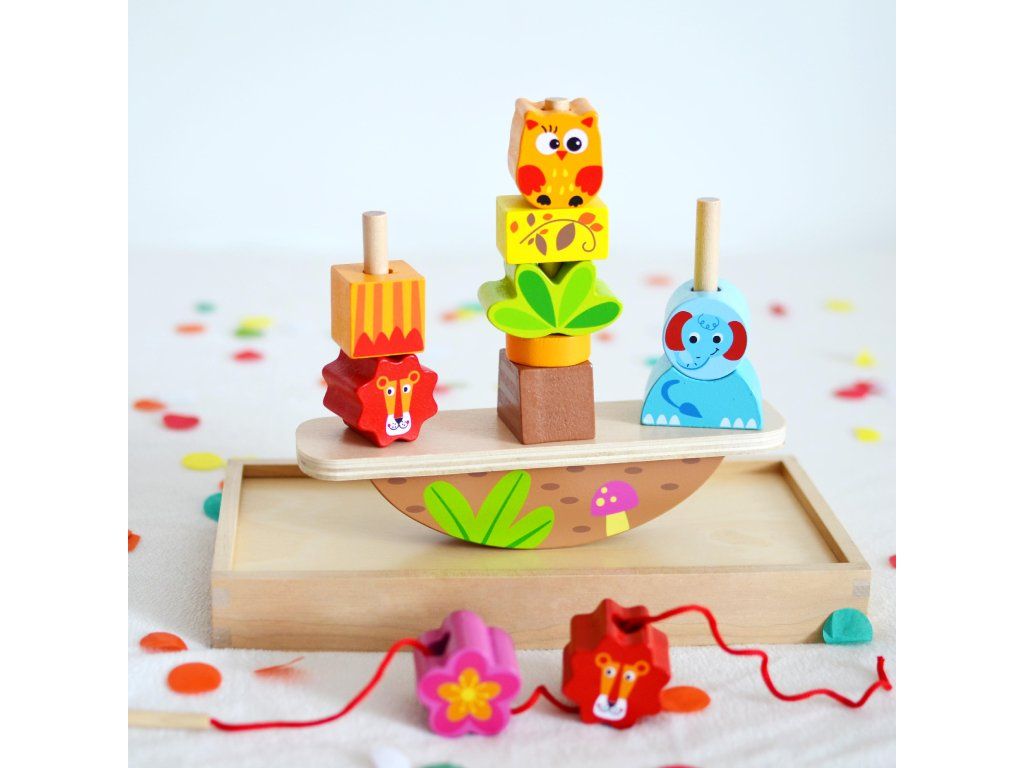 Balančné nasadzovanie Zvieratká Podarí sa ti vyrovnať hojdačku? Detičky musia nasadiť kocky s dierkami na hojdaciu základňu tak, aby bola v rovnováhe. Hra obsahuje 3 nasadzovacie zvieracie hlavičky a ďalšie pestrofarebné a rôzne tvarované dieliky. Deti tak môžu na hojdačke tvoriť rôznorodé kreácie. Hra je ale multifunkčná a kocky je možné navliekať aj na priložený povrázok s bezpečnou drevenou ihlou.Deti si cvičia koordináciu oko-ruka. Zlepšujú si jemnú motoriku a učia sa chápať rovnováhu. Ide o klasickú drevenú hračku pre samostatnú hru, ktorá je vyrobená z kvalitného, dobre opracovaného dreva a nezávadných farieb.Dodatočné parametre