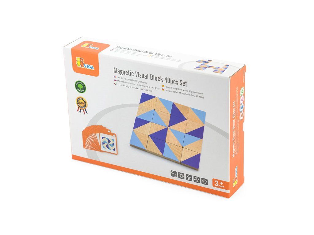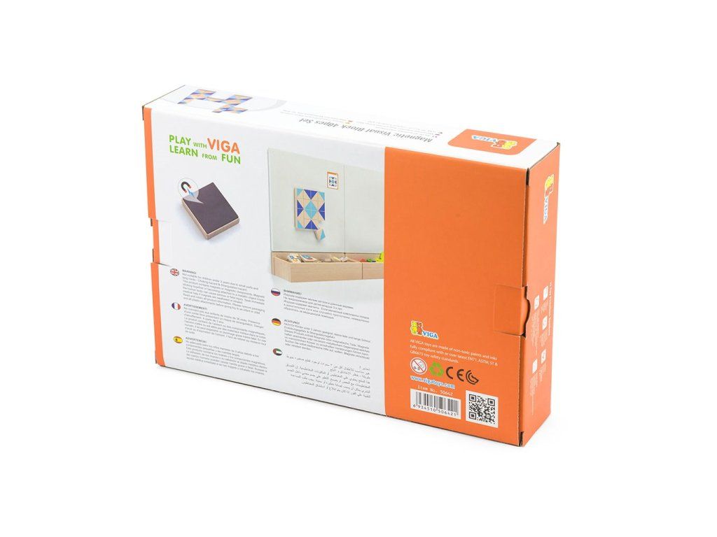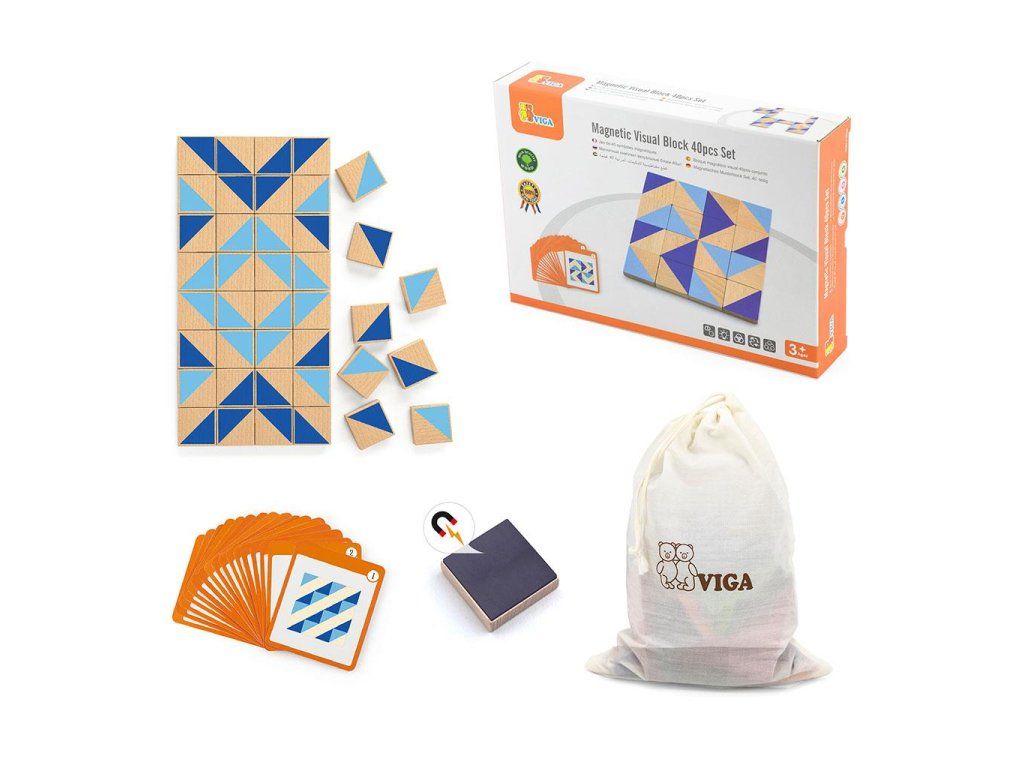 Firma Viga oferuje magnetyczną mozaikę do układania. Ten piękny produkt składa się z 40 drewnianych kolorowych klocków o różnych kształtach i kolorach oraz 20 paneli/arkuszy z wzorami, które dostarczą inspiracji i pomogą w tworzeniu obrazków.