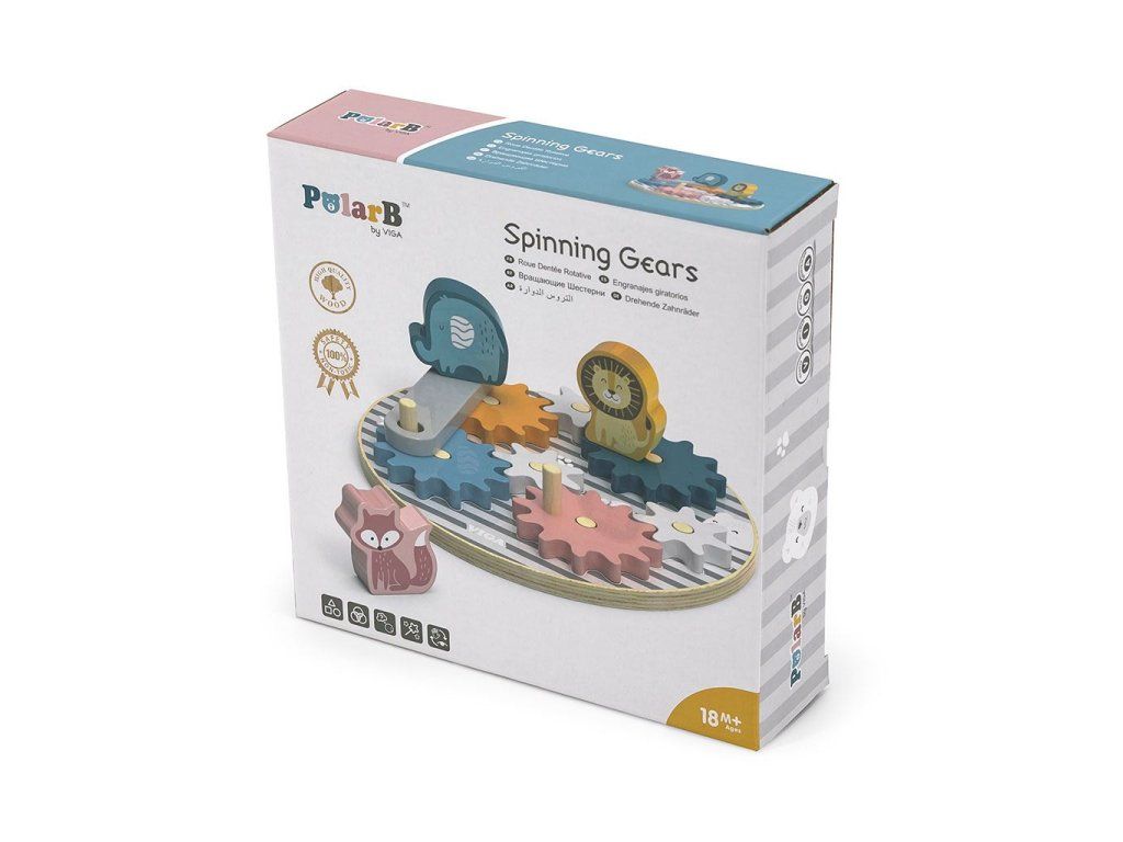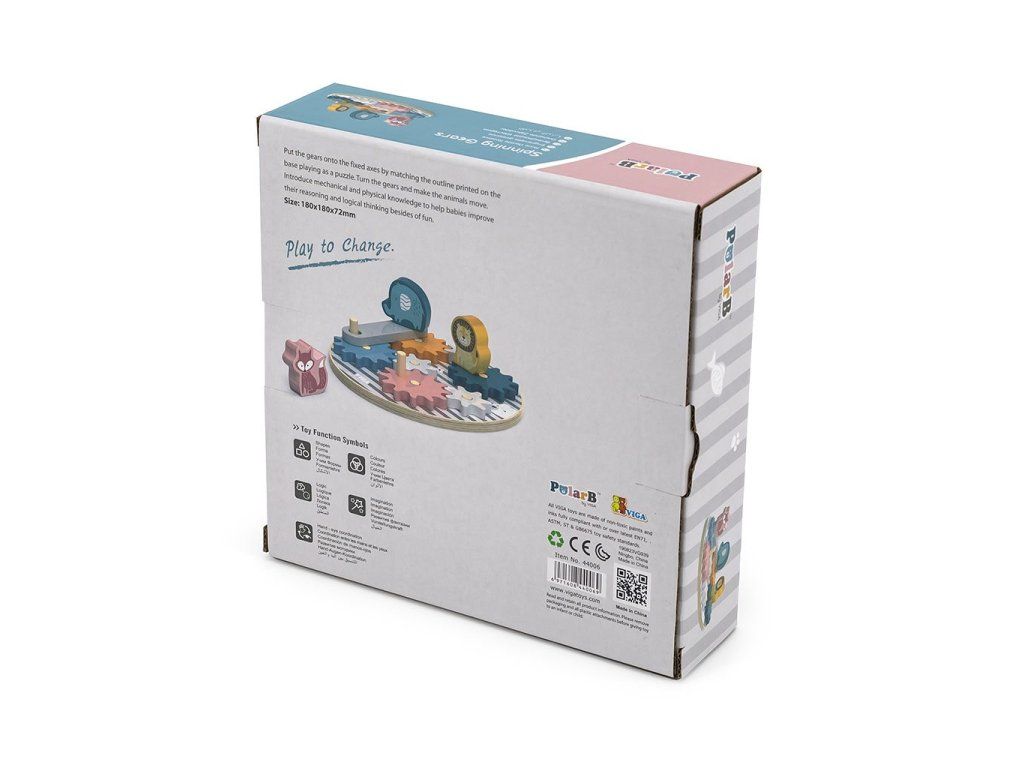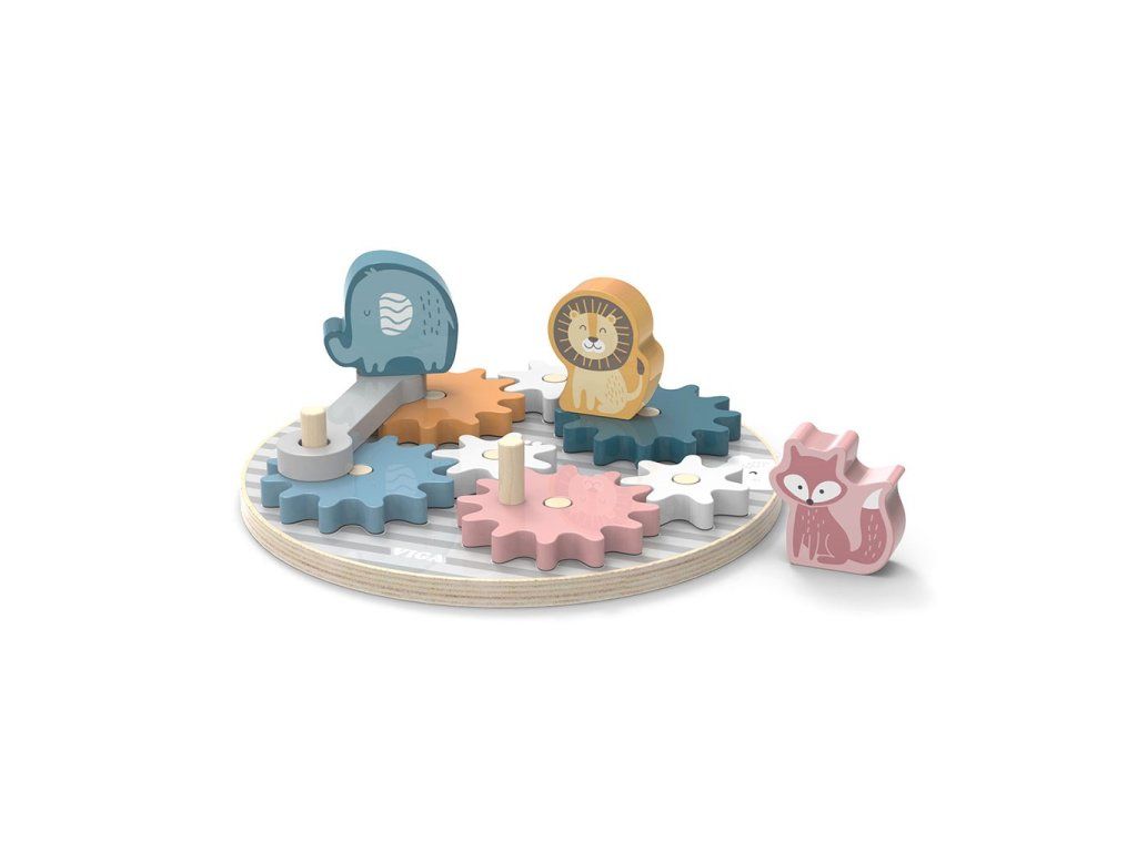 Detská skladačka VIGA s ozubenými kolieskami a zvieratkami je ideálnym darčekom pre každé dieťa. Vzdelávacia skladačka sa osvedčí ako pomôcka pri rozvoji motoriky a koordinácie ruka-oko u batoliat. Okrem toho učí rozpoznávaniu farieb a tvarov. 7 farebných drevených ozubených koliesok, ktoré sú umiestnené na okrúhlej doske s kolíčkami. Pri správnom zostavení kolieska uvedú celú konštrukciu do pohybu. Doplnok v podobe zapínania a 3 farebných zvieratiek (líška, lev a slon), ktoré možno umiestniť na ozubené kolieska.