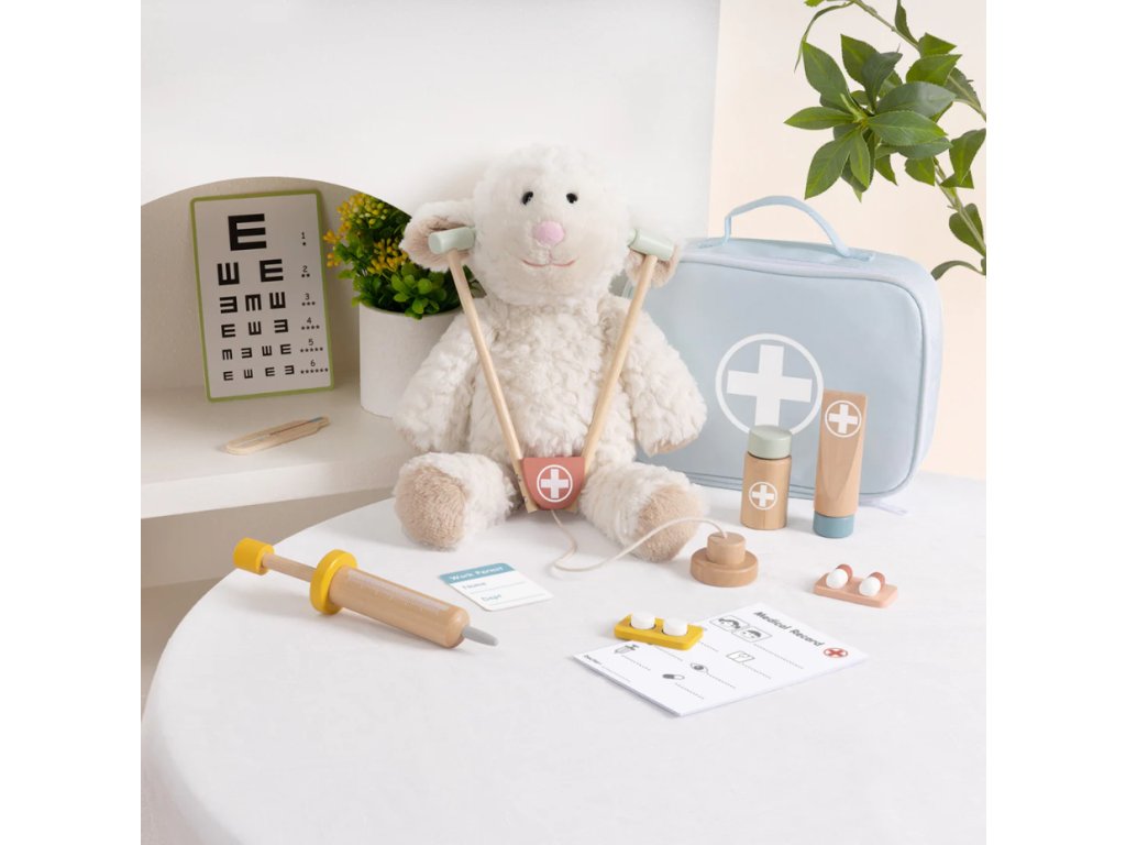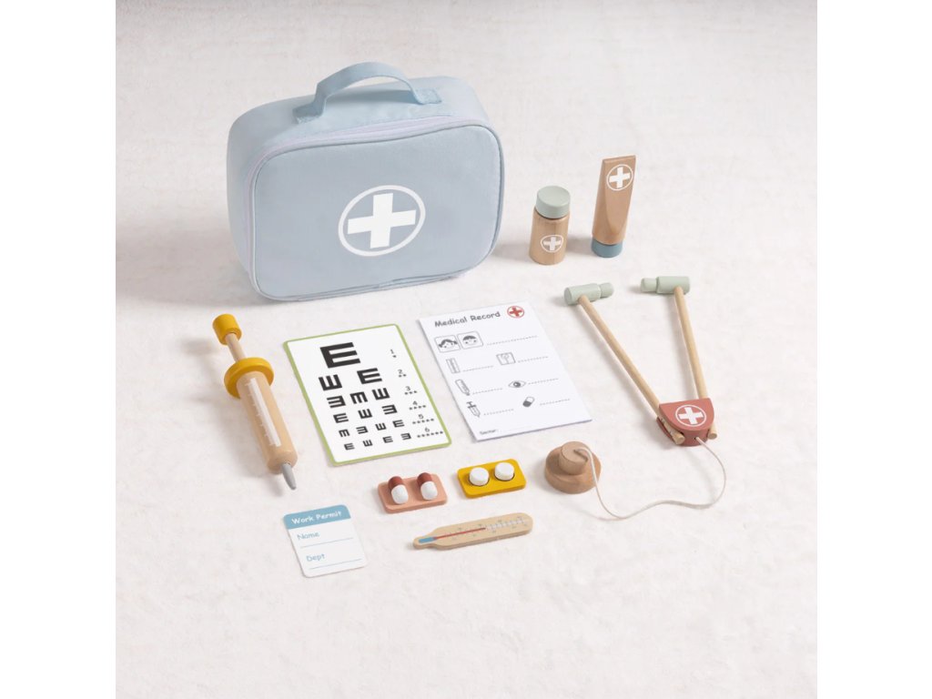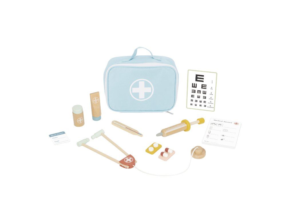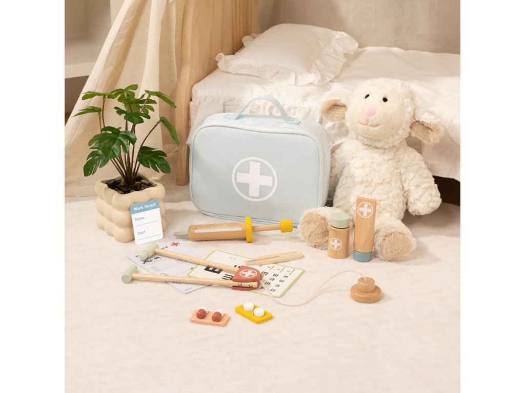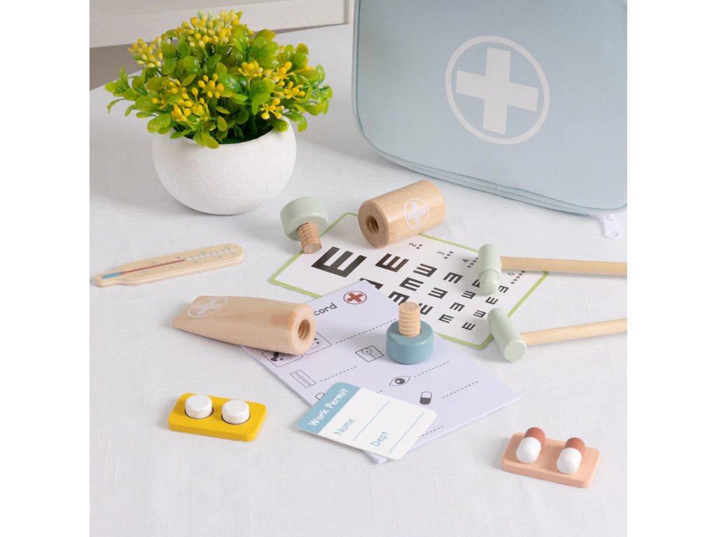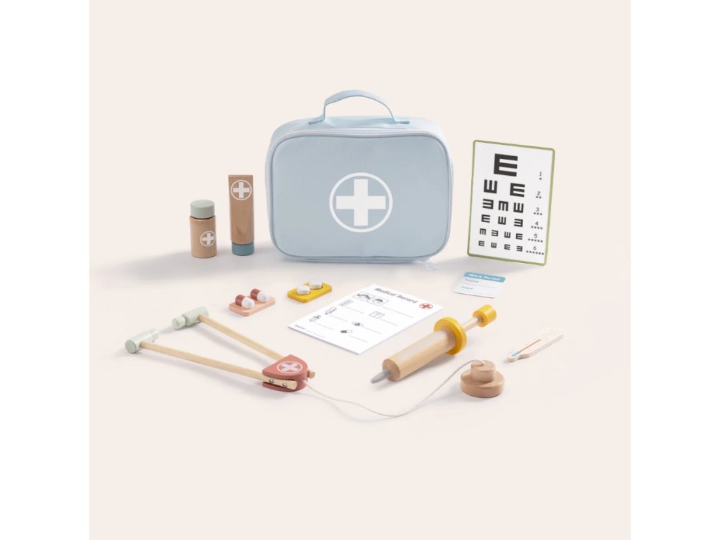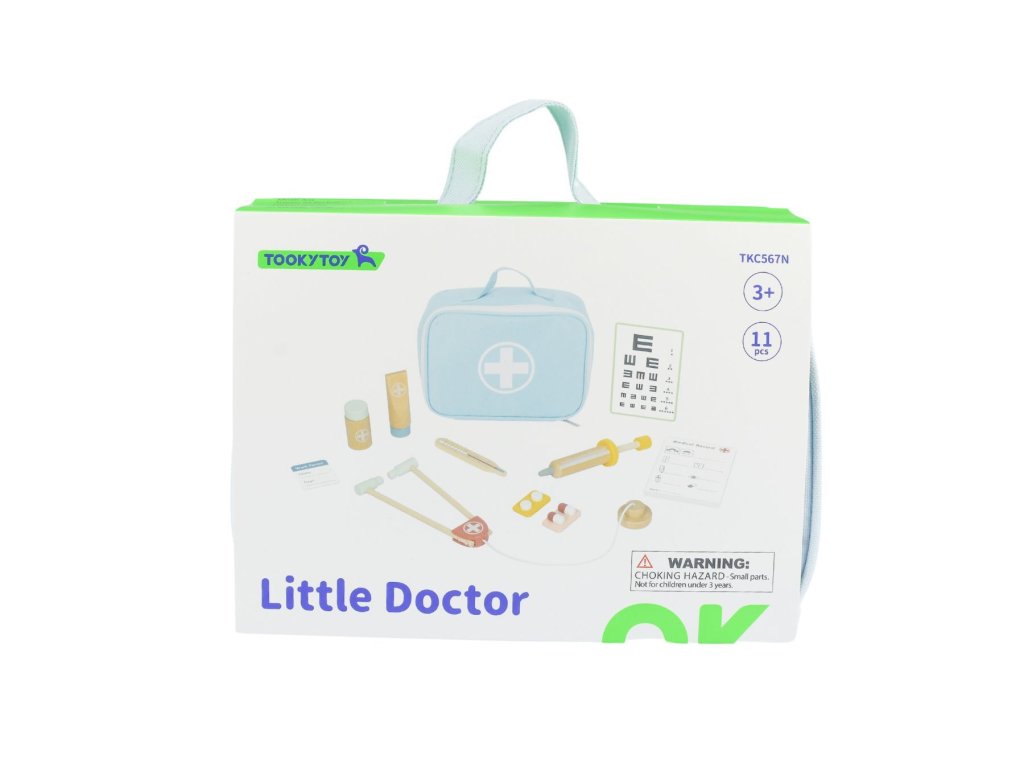 Doktorská sada v kufríku Pastel Poďme sa hrať na doktora! Drevená doktorská sada pre deti v textilnom kufríku značky Tooky Toy umožní deťom hrať sa na doktora doma aj vonku! Vďaka bohatej výbave, ako je fonendoskop, injekcia, teplomer, rôzne mastičky, lieky a ďalšie, sa deti budú cítiť ako skutoční profesionáli. Akékoľvek lekárske vybavenie po úspešne zvládnutom dni v ambulancii zase upratá do látkového kufríka. Sada je skvelá vďaka svojej skladnosti a menšej veľkosti! Celú doktorskú sadu pre deti ľahko vezmete so sebou na cesty.Lekárska sada s vybavením podporí rozvoj detí Hra na doktora, rovnako ako ostatné rolové hry, pomáha deťom v rozvoji ich zručností, ako sú sociálne zručnosti, komunikácia, rozprávanie, fantázie a ďalšie. Drevené hračky pre deti značky Tooky Toy sú vyrobené z kvalitných materiálov s ohľadom na životné prostredie. Celý set je tak veľmi bezpečný a netoxický.Dodatočné parametre