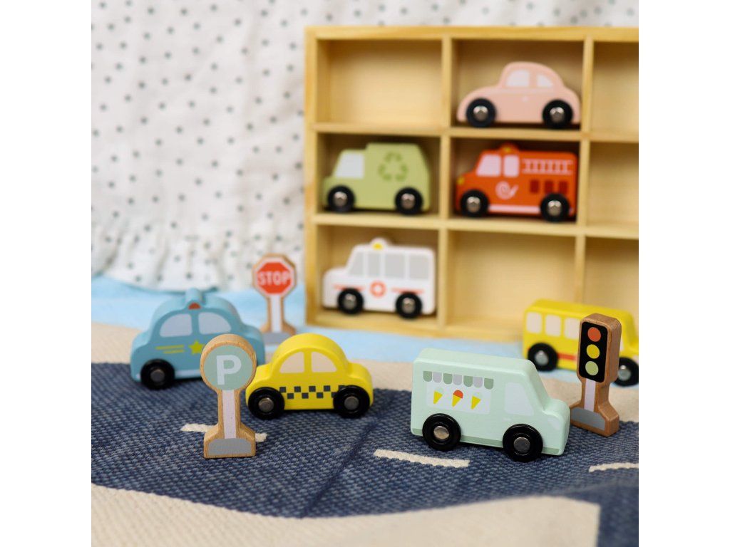 Dopravné prostriedky a značky Pastel 12 ks Sada pre milovníkov autíčok Drevená sada na hranie s dopravnými prostriedkami a dopravným značením od Tooky Toy deti zamestná na celé hodiny. Obsahuje 8 vozidiel (auto, taxi, sanitku, hasičské auto, smetiarske auto, školský autobus, zmrzlinárske auto a policajné auto), 3 dopravné značky a 1 vitrínku na hranie a vystavenie autíčok. Vozidlá sú tiež vhodné ako autíčka na vláčikodráhu!Herný set podporuje rozvoj detí Deti si počas hrania s autíčkami rozvíjajú jemnú motoriku, kreativitu, vymýšľajú vlastné príbehy, navrhujú vlastné scény. Pri hraní s viacerými deťmi si tiež rozvíjajú svoje komunikačné a sociálne schopnosti. Celá sada je vyrobená z dreva z udržateľného lesníctva. Farby sú netoxické. Značka Tooky Toy si dáva záležať na bezpečnosti, eco friendly výrobe a didaktickom rozmere svojich hračiek.Dodatočné parametre