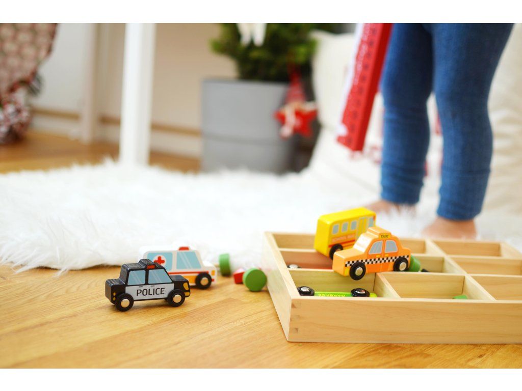 Dopravné prostriedky a značky Hurá na cestu! Táto sada drevených vozidiel a dopravných značiek bude deti baviť a zamestná ich na celé hodiny. Set obsahuje 6 vozidiel (policajné autíčko, sanitku, hasičské auto, smetiarske auto, taxi a školský autobus) a 9 dopravných značiek.Počas hry si deti trénujú jemnú motoriku. Hranie vo dvojici navyše napomáha rozvíjať sociálne a komunikačné schopnosti. Všetky dopravné vozidlá a značky sú vyrobené z dreva a možno ich opäť odložiť do drevenej škatuľky s poličkami. Tú môžete využiť aj ako vitrínu na hračky v detskej izbe.Dodatočné parametre