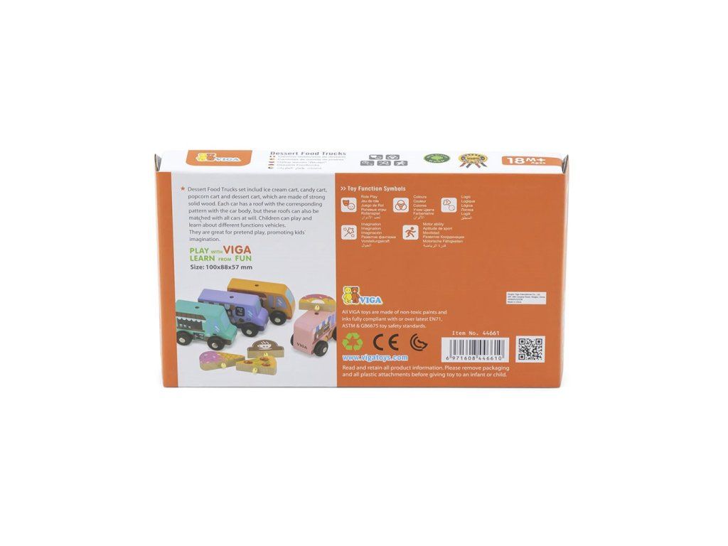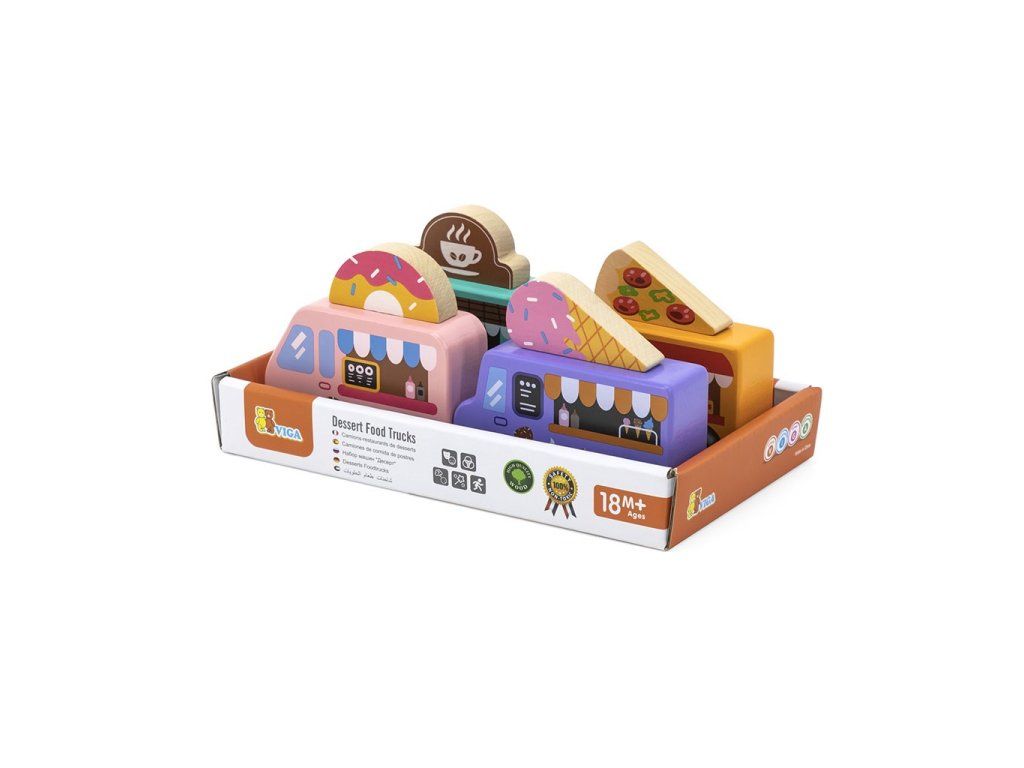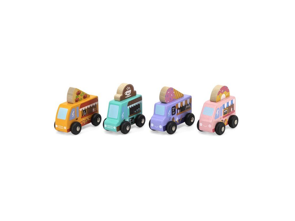 Štyri Food Trucky majú možnosť pripevniť na strechu prvok s obrázkom vhodným pre kaviareň, zmrzlináreň, cukráreň a pizzeriu. Drevené nákladné autá sú ideálne na hranie v interiéri aj exteriéri.