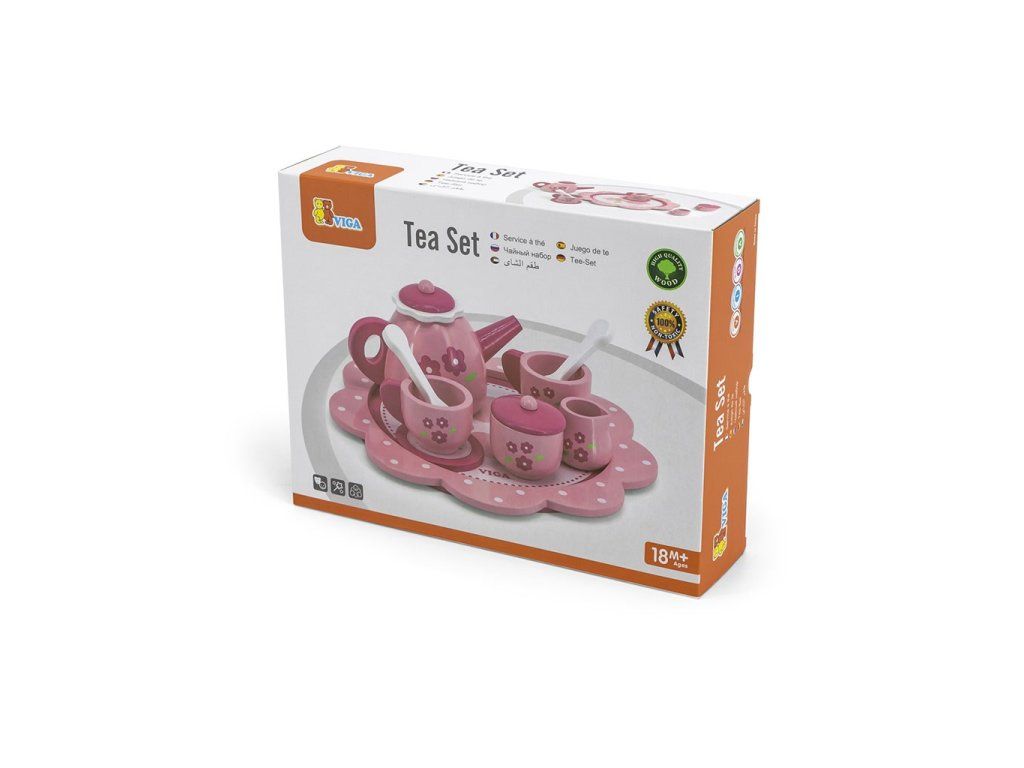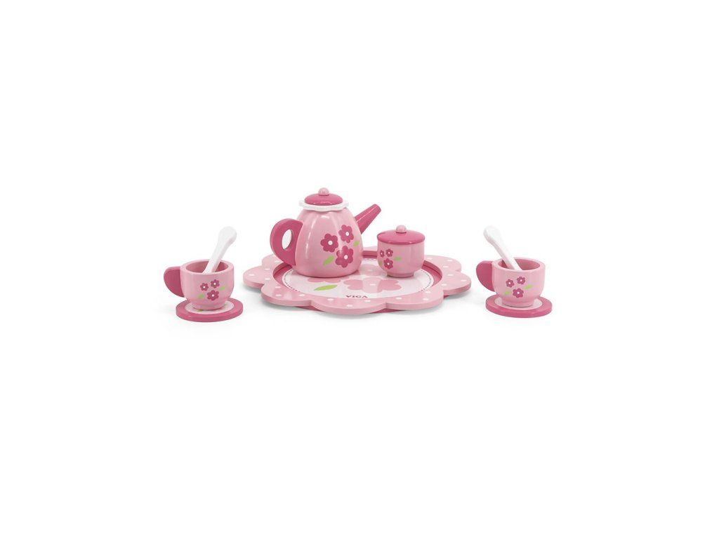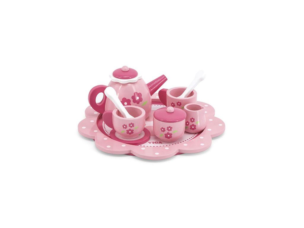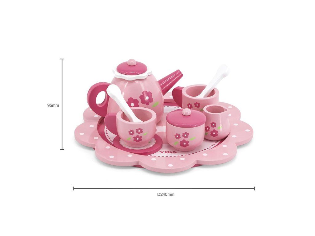Drevená čajová súprava VIGA pozostáva z 12 kusov - čajníka, kanvičky na mlieko, cukorničky, dvoch šálok s podšálkami a lyžičkami a krásneho podnosu.