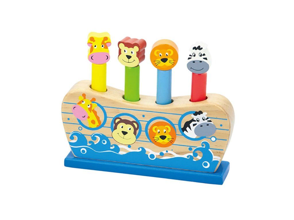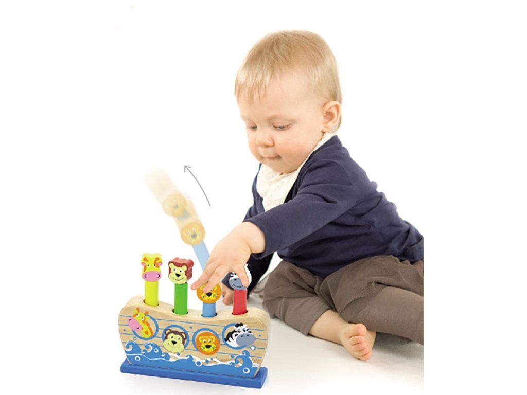 Drevená hra Noemova archa od spoločnosti Viga je hračka, ktorú si zamiluje každé dieťa. Úlohou dieťaťa je "katapultovať" zvieratká stláčaním zvieracích hláv, ktoré sú umiestnené na farebnom drevenom podklade. Figúrky žirafy, opice, leva a zebry sa na batoľa usmievajú, zatiaľ čo sa dieťa môže naučiť identifikovať, ktoré zvieratko bolo umiestnené na drevenej hlave.