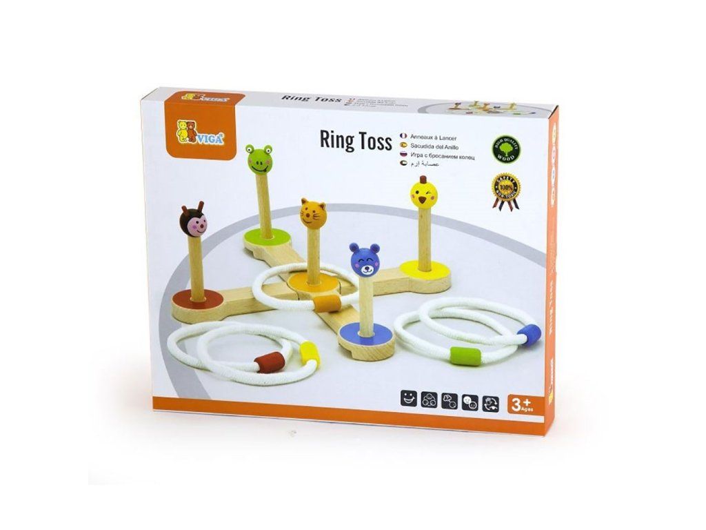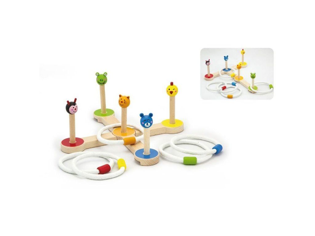 Skladacia hra na hádzanie krúžkov. Dva spôsoby spojenia dvoch základných dosiek pre viac zábavy pri spoločnej hre. Obsahuje 2 základné dosky, 5 kolíkov s rôznymi roztomilými zvieratkami a 5 krúžkov s korálkami v rôznych farbách.