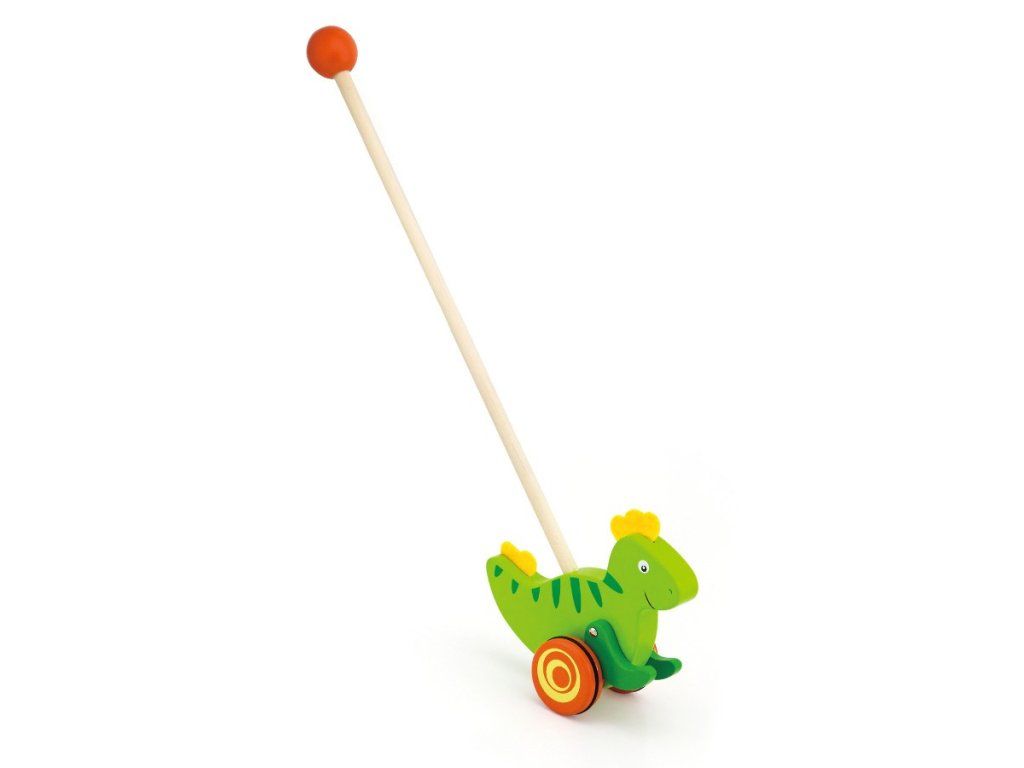 Krásna drevená hračka na tyči Viga Dinosaurus je skvelou alternatívou ťahacích hračiek pre deti. Perfektná edukačná hračka. Ideálna na spoločné prechádzky a hranie doma. Gumové prvky pripojené na kolesá vtipným spôsobom napodobňujú chôdzu zvierat. Hračka pomáha zlepšiť manuálnu zručnosť a obratnosť, učí dieťa rozpoznať tvary a farby, zapája a rozvíja zmysel pre pozorovanie. Hračka je vyrobená z lakovaného dreva. Našou prioritou je bezpečnosť a kvalita našich výrobkov, a preto farby použité na hračkách nie sú toxické a spĺňajú bezpečnostné štandardy (EN71 a ASTM). Rozmery hračky: dxvxš 15x8,3x5,6 cm. Určené pre deti od 2 rokov.Dodatočné parametre