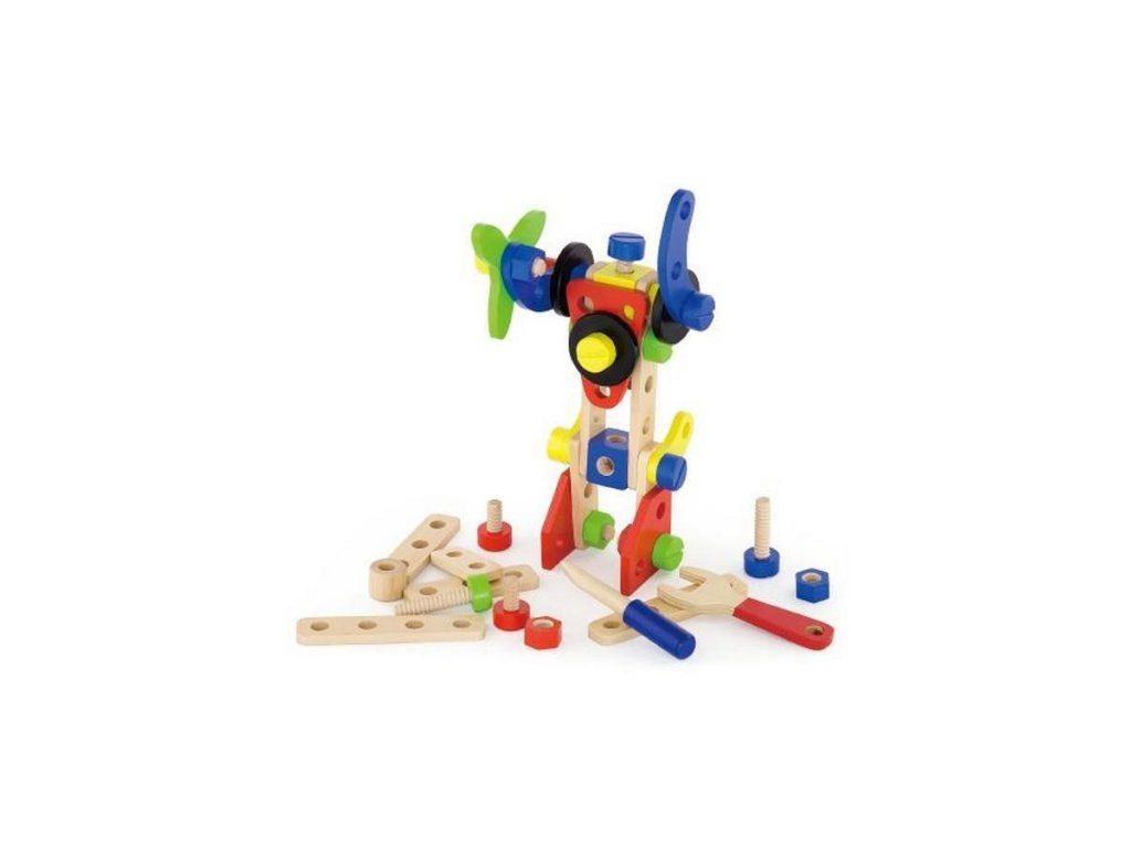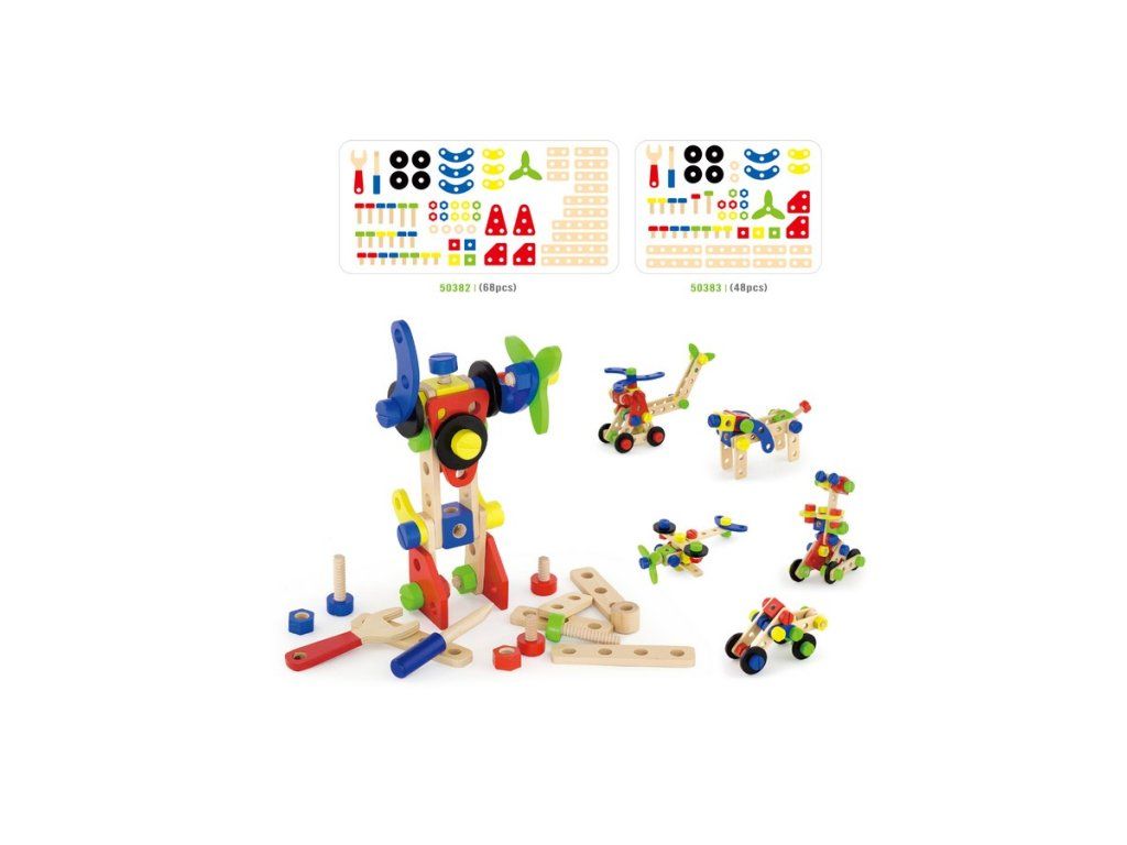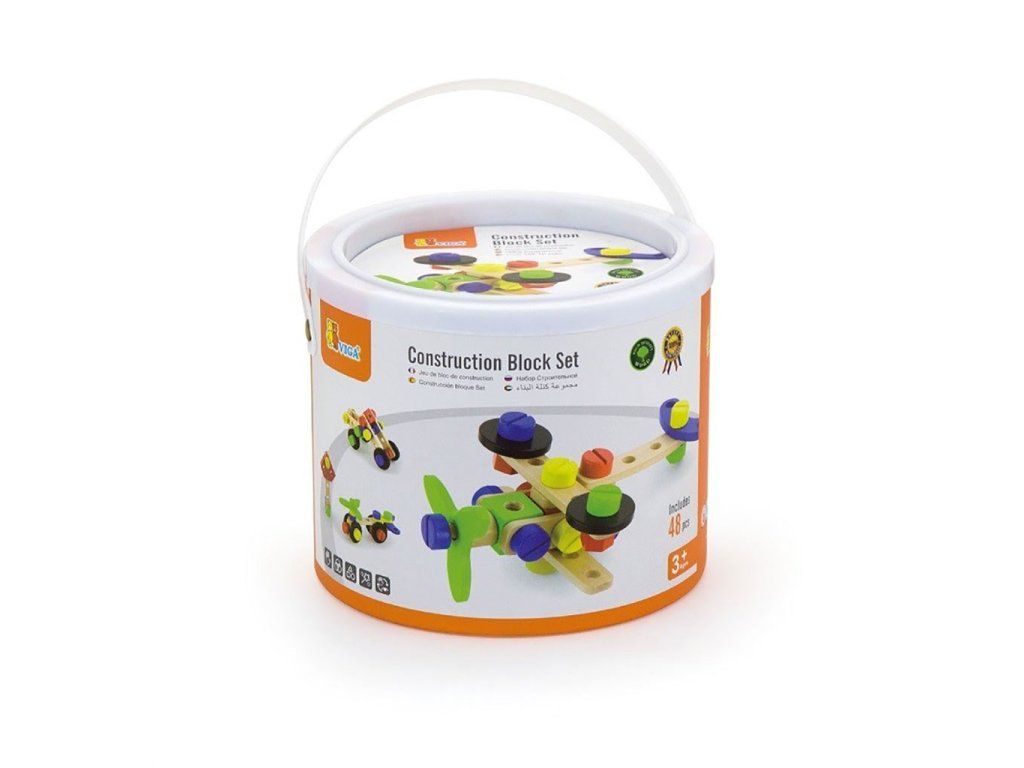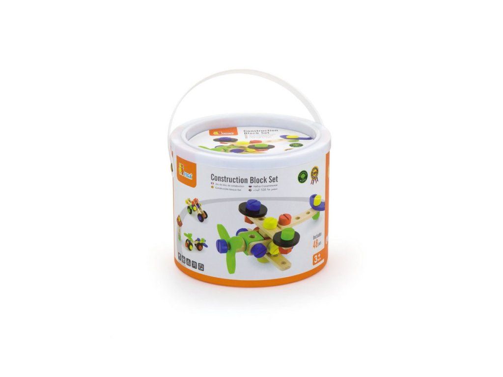 Drevená konštrukčná stavebnica Viga. Sada obsahuje 48 dielikov, z ktorých môžete postaviť lietadlo, robota, auto a mnoho ďalších vecí. Stavebnica je v plastovom vedierku s rukoväťou. Sada obsahuje tiež brožúru, ktorá inšpiruje vaše dieťa k tvorivej zábave. Hračka je vyrobená z lakovaného dreva. Našou prioritou je bezpečnosť a kvalita našich výrobkov, a preto farby použité na hračkách nie sú toxické a spĺňajú bezpečnostné štandardy (EN71 a ASTM). Pre deti od 3 rokov.Dodatočné parametre