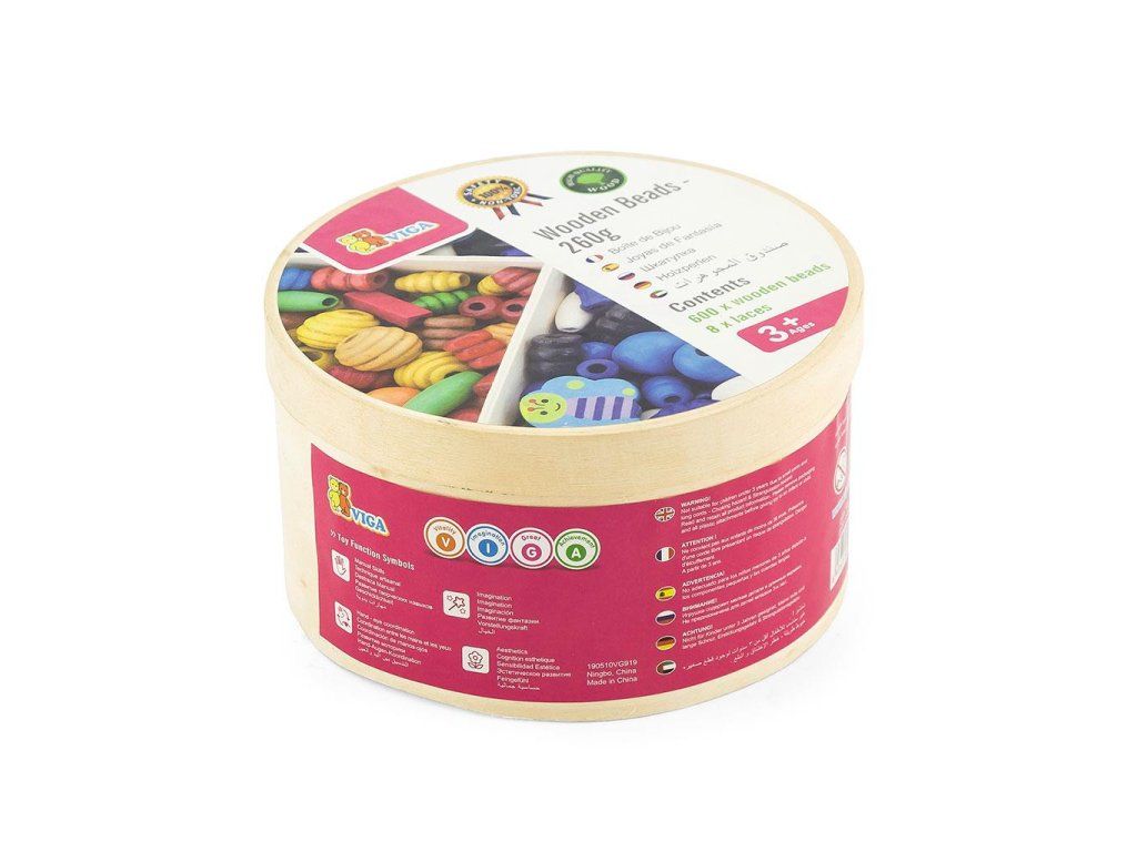 Kreatywny zestaw drewnianych koralików Viga zawiera 600 drewnianych koralików o różnych rozmiarach, kształtach i kolorach. W zestawie znajduje się również 8 sznurków w różnych kolorach. Dzięki zestawowi można stworzyć bransoletki lub naszyjniki.