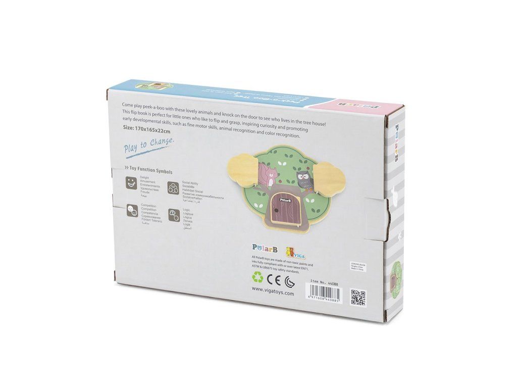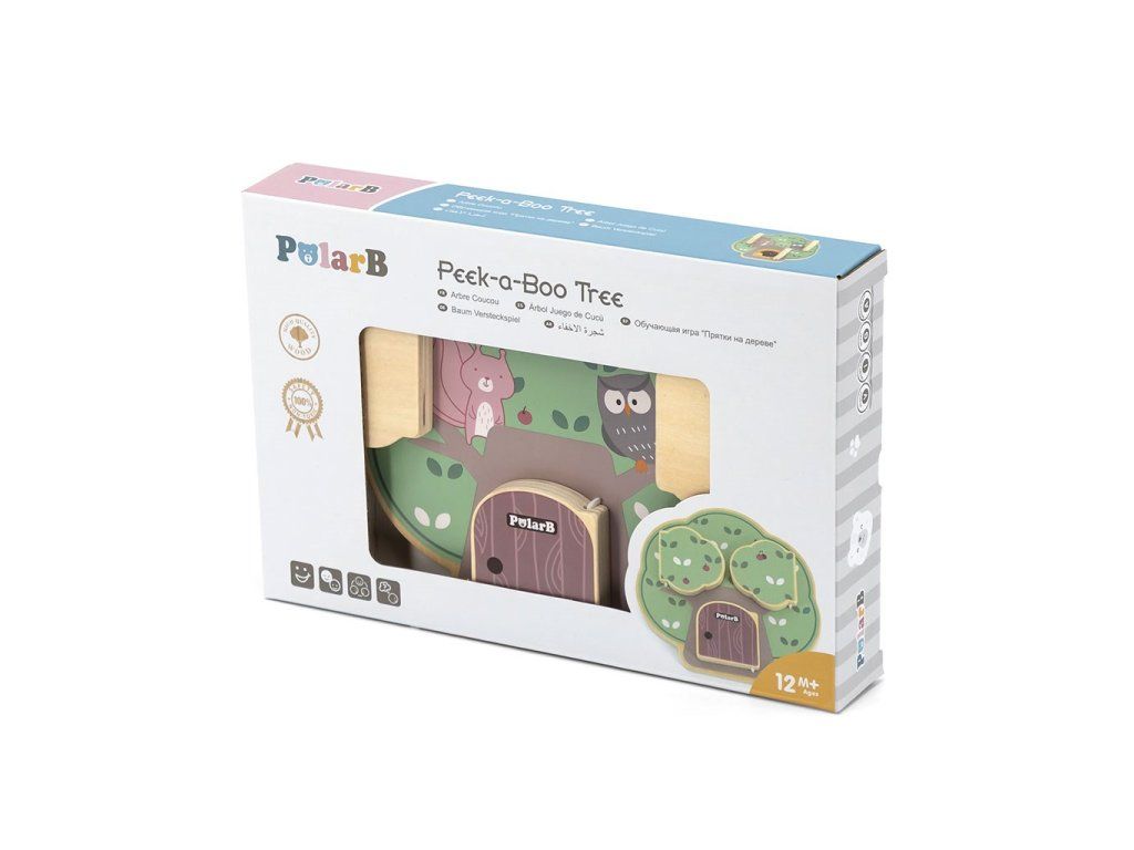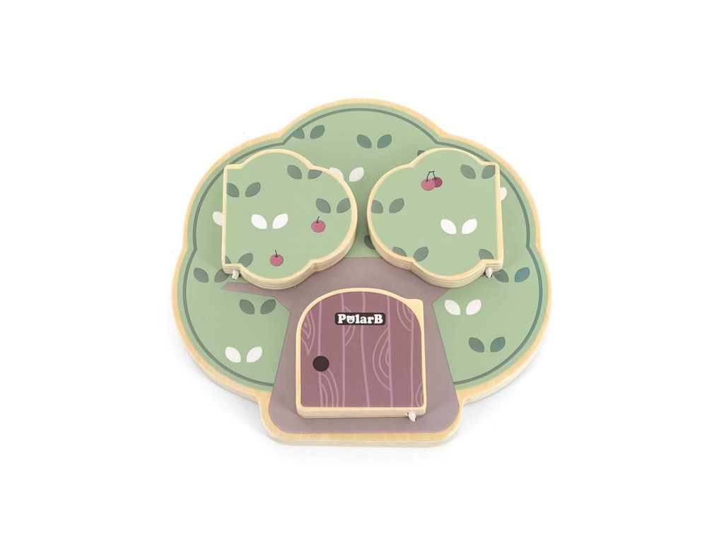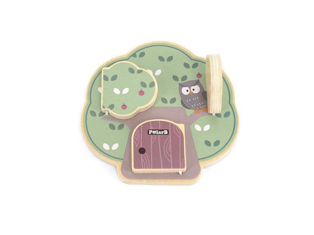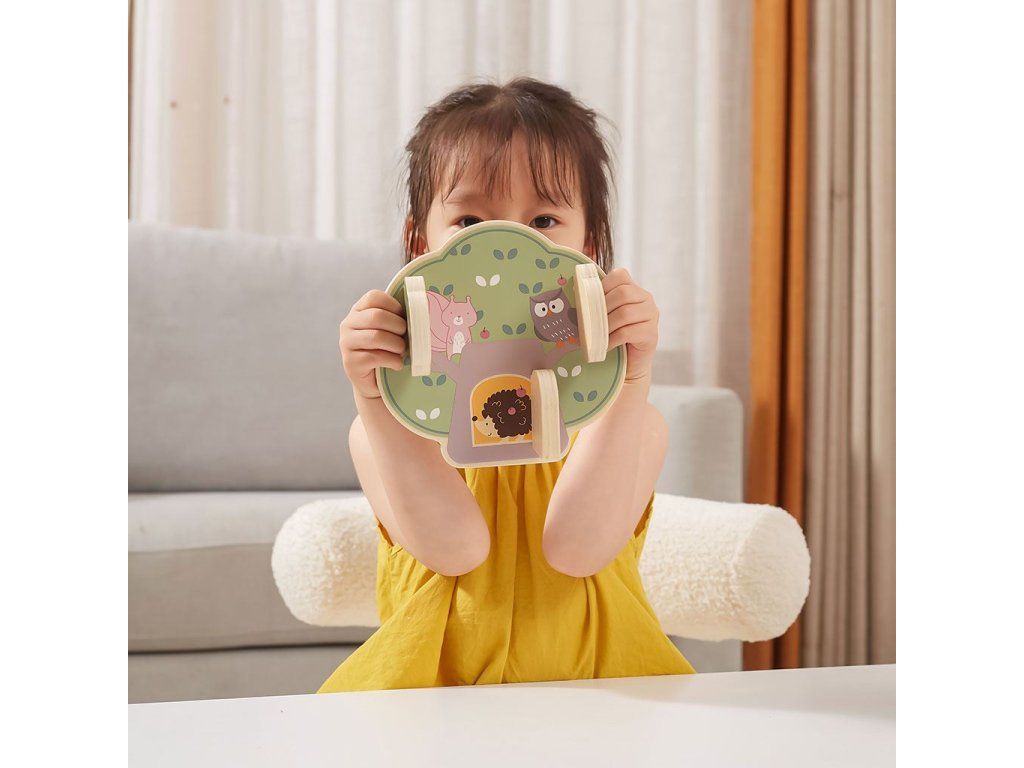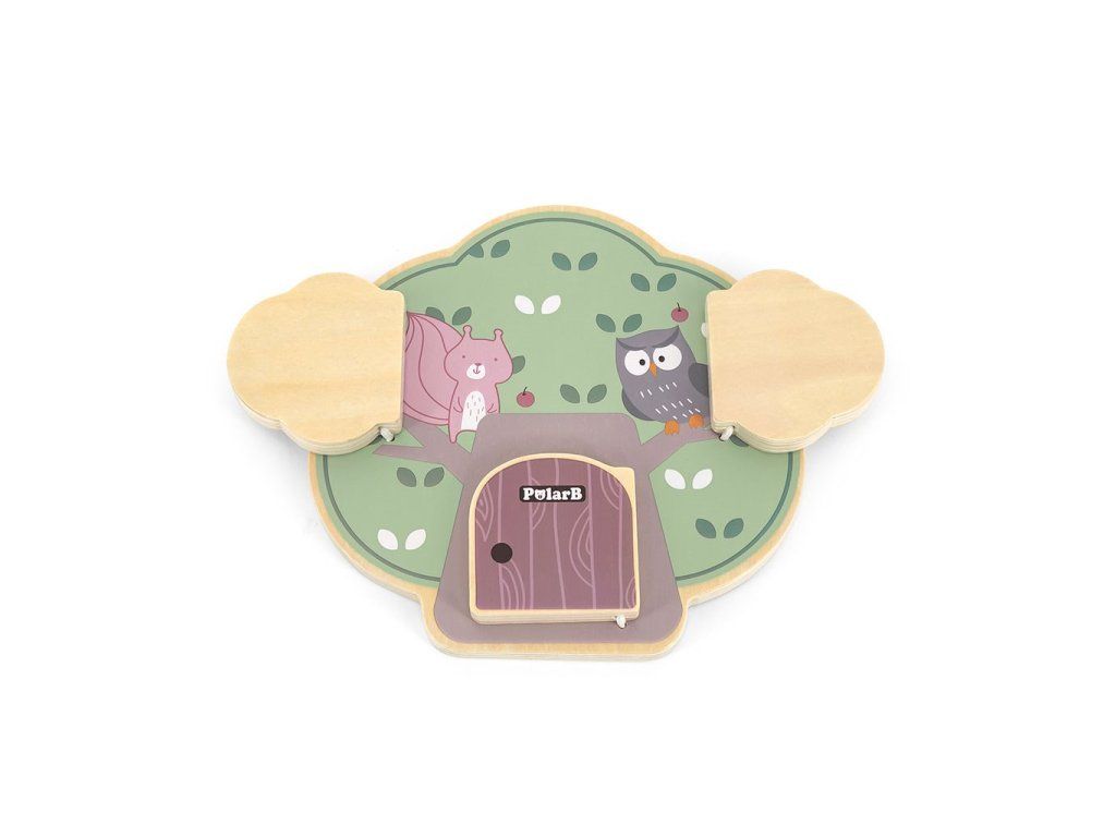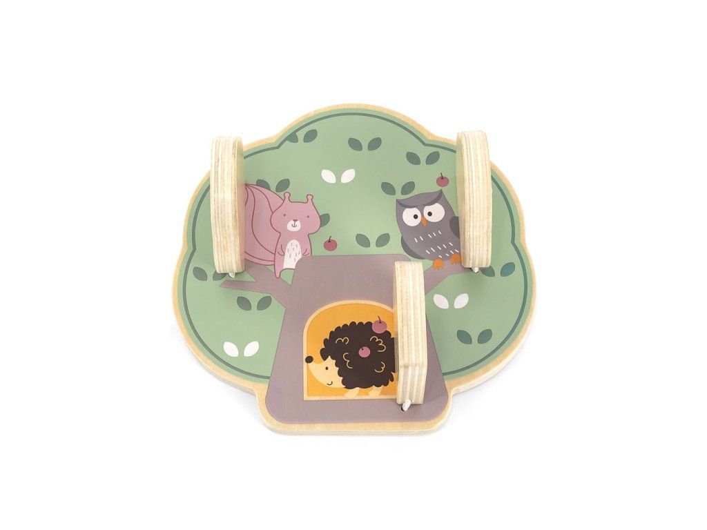 Predstavujeme drevenú manipulačnú tabuľu v tvare stromu, ktorá dokonale rozvíja zmyslové a logické myslenie detí. Na drevenej doske sú 3 dvierka a za každými dvierkami je iné zvieratko: veverička, sova a ježko, ktorý nosí na chrbte jabĺčka.