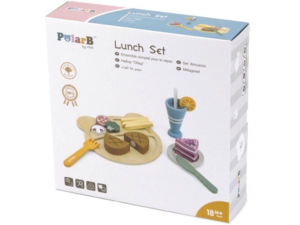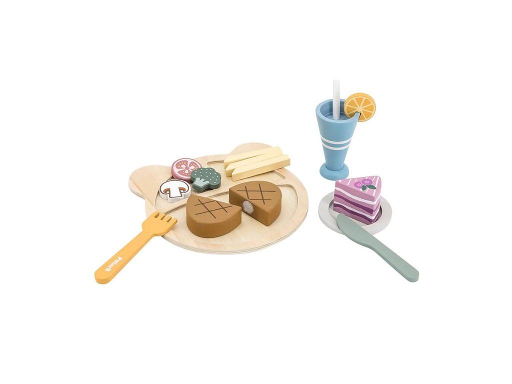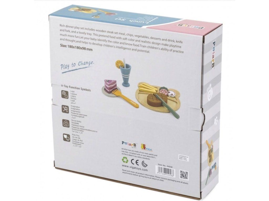 Obedová súprava od spoločnosti Viga je dokonalou hračkou, ktorá podnecuje detskú predstavivosť. Kým rodič pripravuje jedlo pre celú rodinu, náš malý kuchár alebo kuchárka pripravuje obed s obľúbenými prílohami pre svoje bábiky a medvedíky. Vďaka bezpečnému nožu, ktorý je vyrobený z dreva, vaše dieťa ľahko "nakrája" steak. Pri spoločnej hre bude môcť každý rodič naučiť svoje dieťa, ako v budúcnosti používať ostré kuchynské náčinie. Ďalšou, výhodou je, že steak je pripevnený pomocou suchého zipsu, čo poskytuje nekonečnú zábavu. Keď je večera hotová, dá sa opäť poskladať. Táto súprava hračiek na večeru pomáha batoľatám so základným vývojom, zlepšuje motorické zručnosti, kreativitu, predstavivosť a sociálne zručnosti.