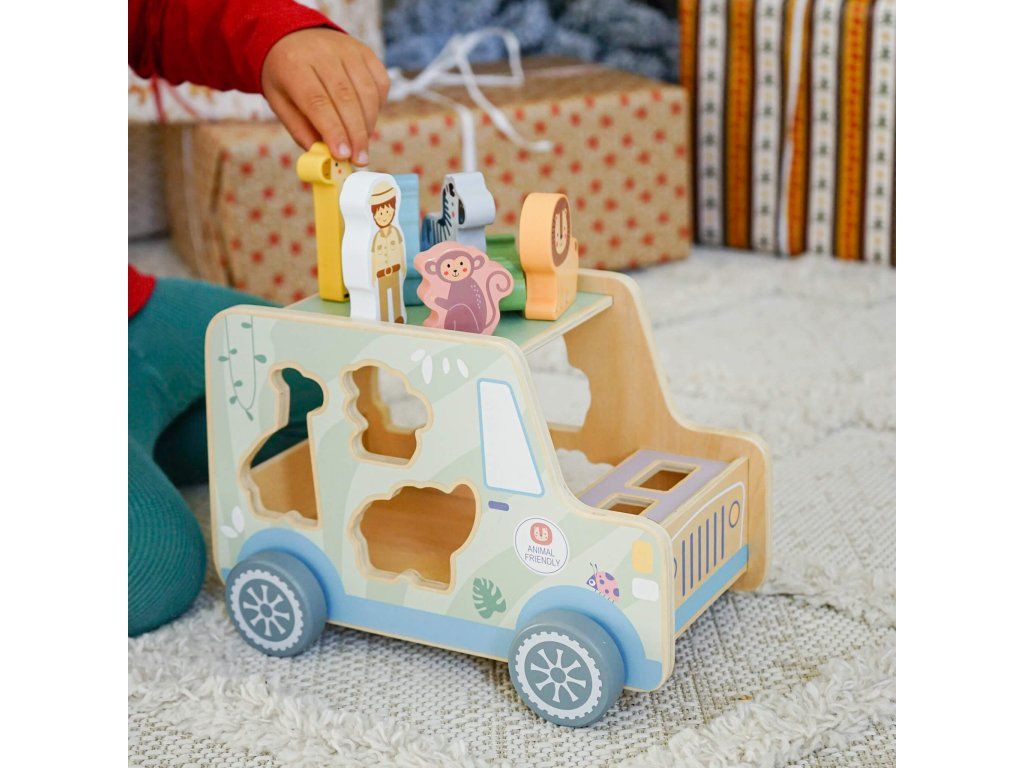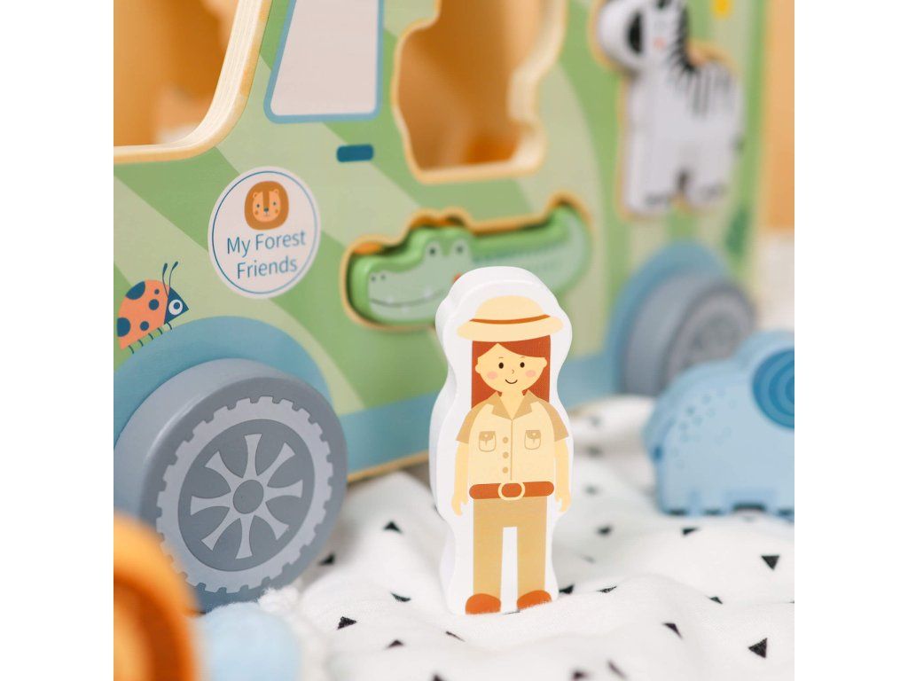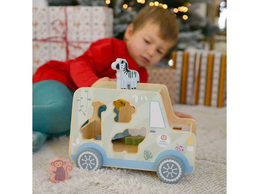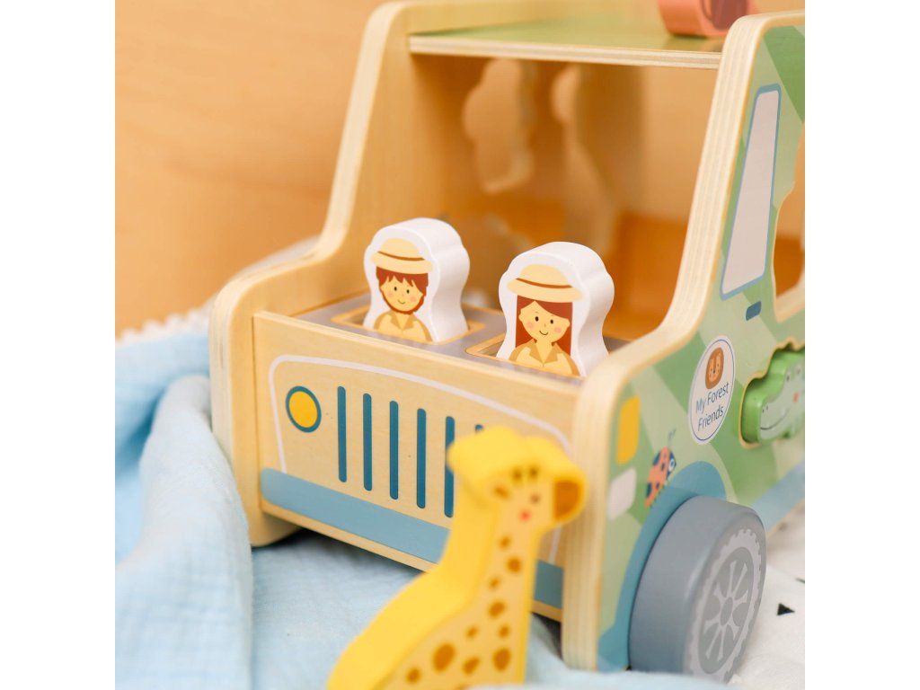 Drevená vkladačka Zvieratká Safari auto 9 ks Ideme na safari! Drevená vkladačka v podobe safari jeepu v pastelových farbách od Tooky Toy zabaví vaše deti na veľmi dlho. Auto je totiž veľké, krásne jazdí, má 6 otvorov na vloženie 6 drevených zvieratiek a taktiež 2 figúrky v podobe bádateľov, ktorí majú svoje miesta v prednej časti auta. Deti sa tak môžu hrať s autíčkom aj s figúrkami na safari a ešte si pritom zlepšovať svoje zručnosti vďaka vkladaniu.Vkladačka zvieratká podporuje rozvoj detí Hračka rozvíja jemnú motoriku, logické myslenie, koncentráciu či koordináciu ruka-oko. Batoľa sa ale tiež naučí rozpoznávať a pomenovávať jednotlivé zvieratká. Drevené hračky pre deti od Tooky Toy sú vyrobené z pevného, dobre opracovaného dreva a netoxických farieb. Pre deti sú tak úplne bezpečné.Dodatočné parametre