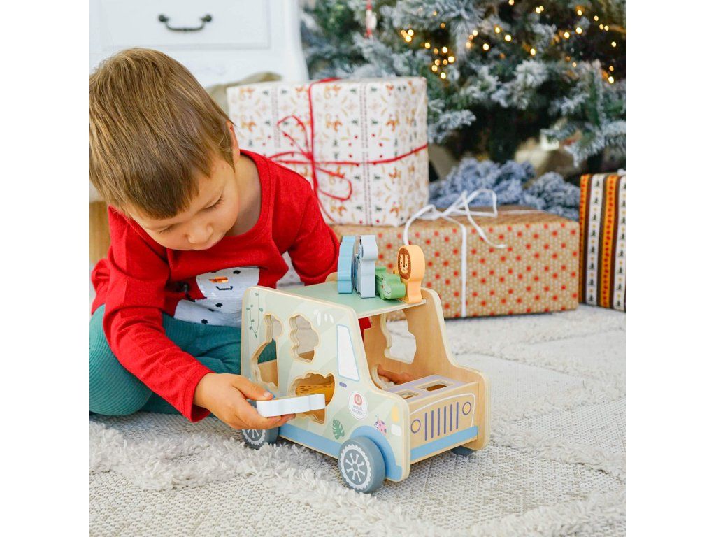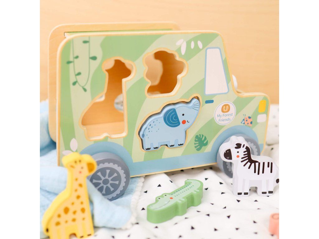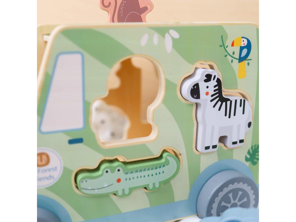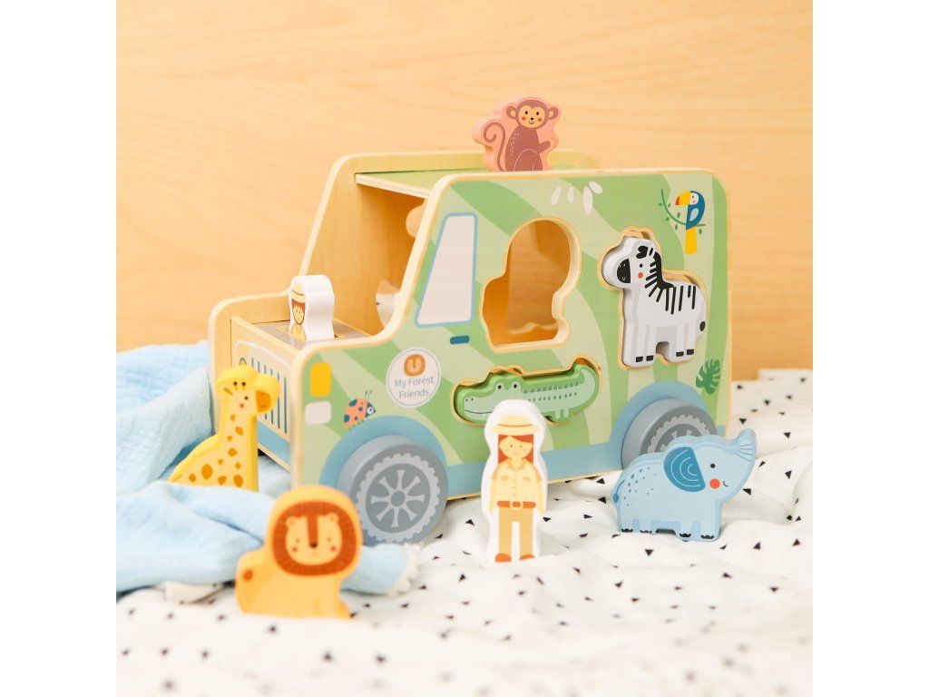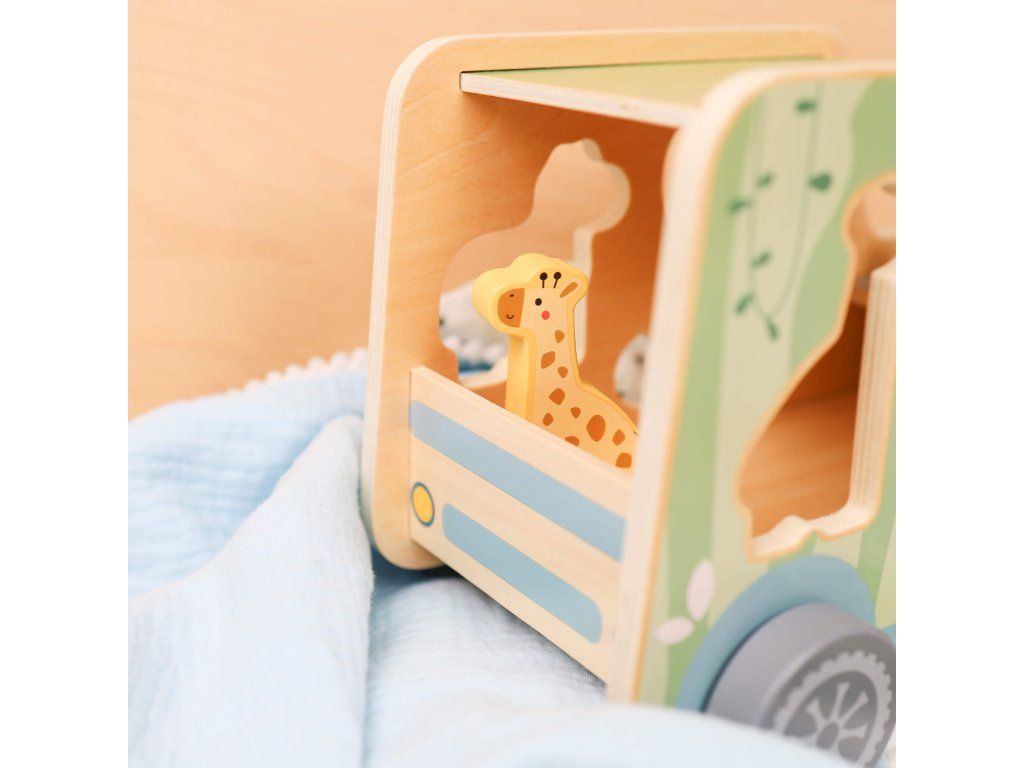 Drevená vkladačka Zvieratká Safari auto 9 ks Ideme na safari! Drevená vkladačka v podobe safari jeepu v pastelových farbách od Tooky Toy zabaví vaše deti na veľmi dlho. Auto je totiž veľké, krásne jazdí, má 6 otvorov na vloženie 6 drevených zvieratiek a taktiež 2 figúrky v podobe bádateľov, ktorí majú svoje miesta v prednej časti auta. Deti sa tak môžu hrať s autíčkom aj s figúrkami na safari a ešte si pritom zlepšovať svoje zručnosti vďaka vkladaniu.Vkladačka zvieratká podporuje rozvoj detí Hračka rozvíja jemnú motoriku, logické myslenie, koncentráciu či koordináciu ruka-oko. Batoľa sa ale tiež naučí rozpoznávať a pomenovávať jednotlivé zvieratká. Drevené hračky pre deti od Tooky Toy sú vyrobené z pevného, dobre opracovaného dreva a netoxických farieb. Pre deti sú tak úplne bezpečné.Dodatočné parametre
