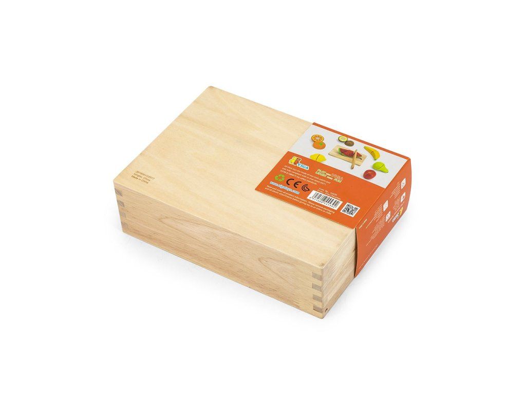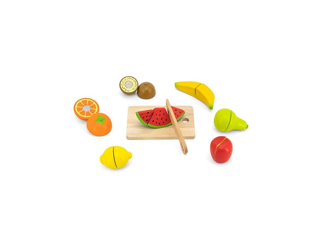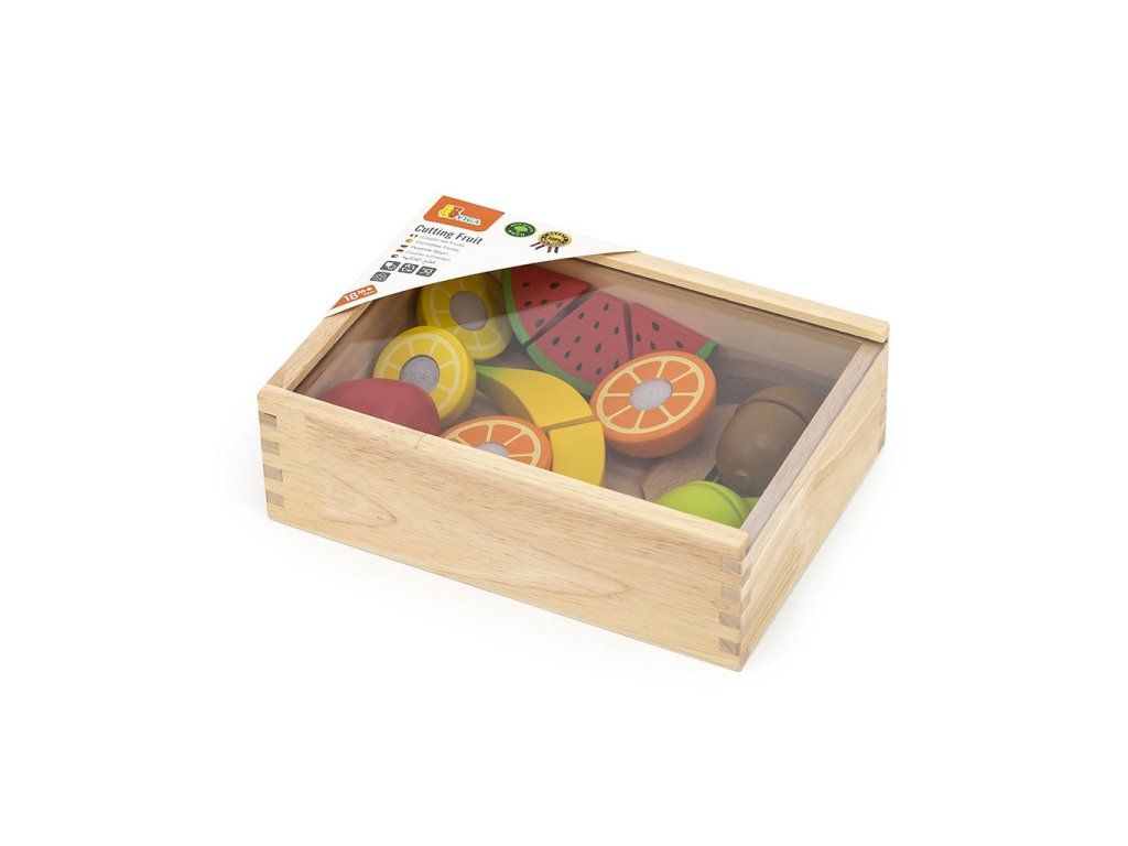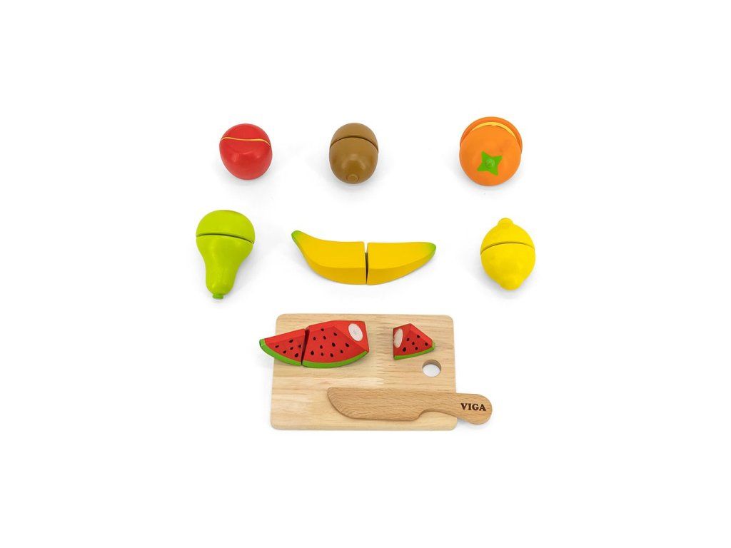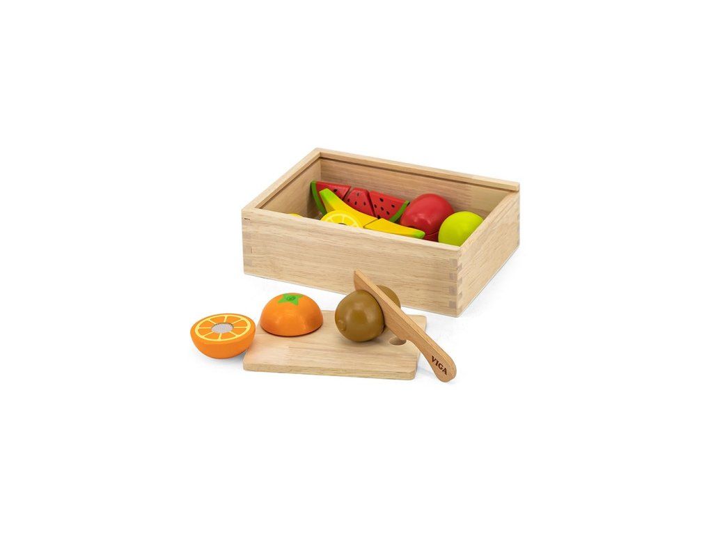 Súprava na krájanie ovocia od spoločnosti Viga je ideálnou hračkou na stimulovanie detskej predstavivosti. Vďaka bezpečnému nožu, ktorý je vyrobený z dreva, môže dieťa ľahko "nakrájať" banán, hrušku alebo pomaranč. Ďalšou výhodou je skutočnosť, že všetky výrobky sú spojené suchým zipsom pre nekonečnú zábavu.