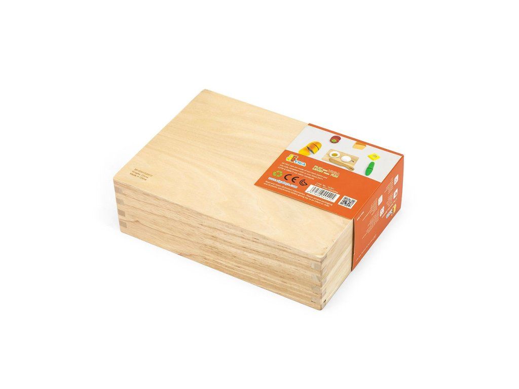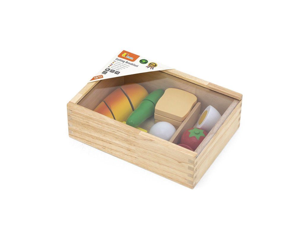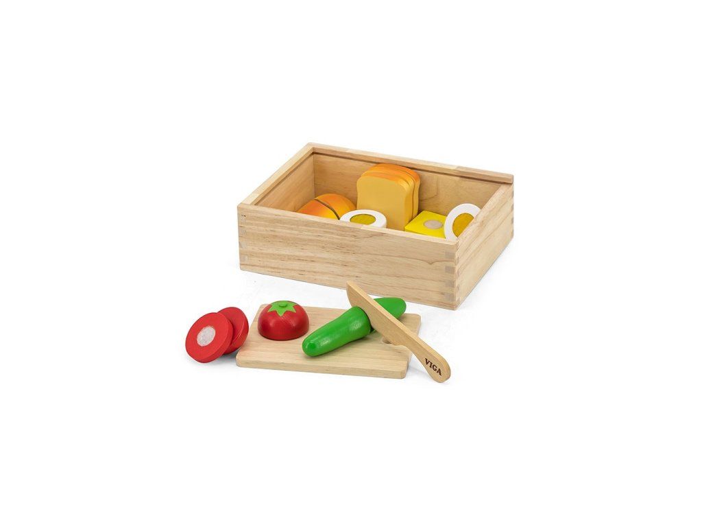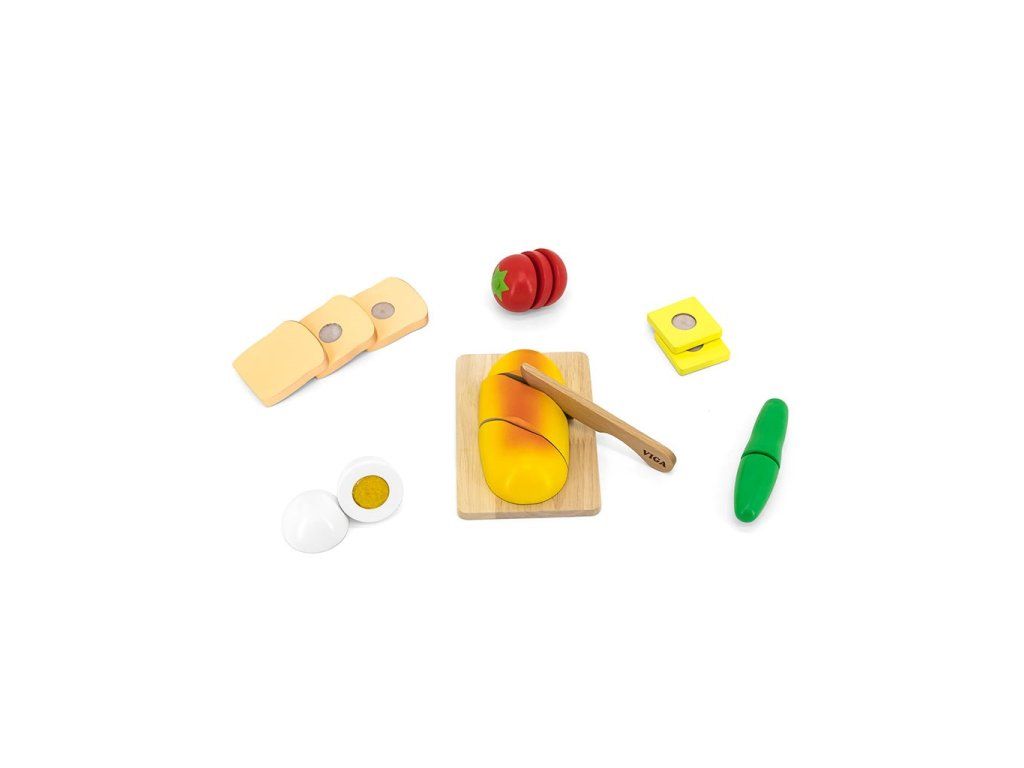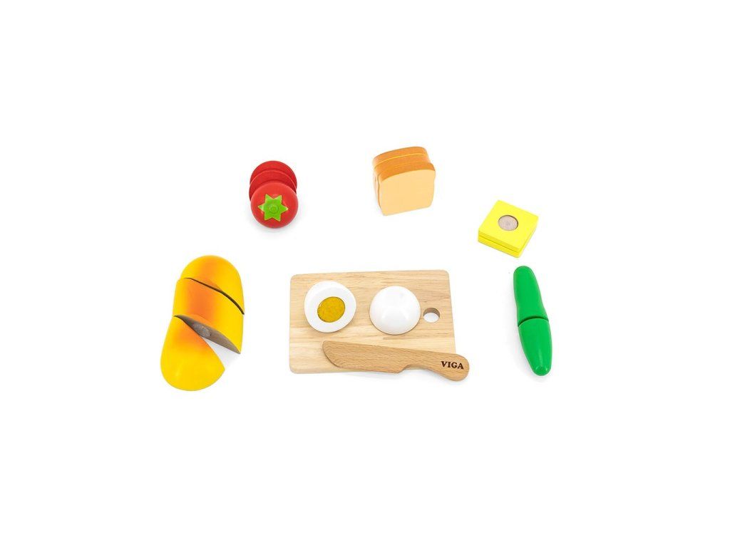 Sada na krájanie raňajok Viga je ideálnou hračkou na stimuláciu detskej predstavivosti. Vďaka bezpečnému nožu, ktorý je vyrobený z dreva, môže dieťa ľahko "krájať" chlieb, vajíčko alebo syr. Ďalšou, výhodou je skutočnosť, že všetky výrobky sú spojené suchým zipsom pre nekonečnú zábavu.