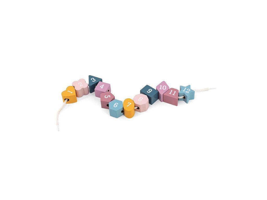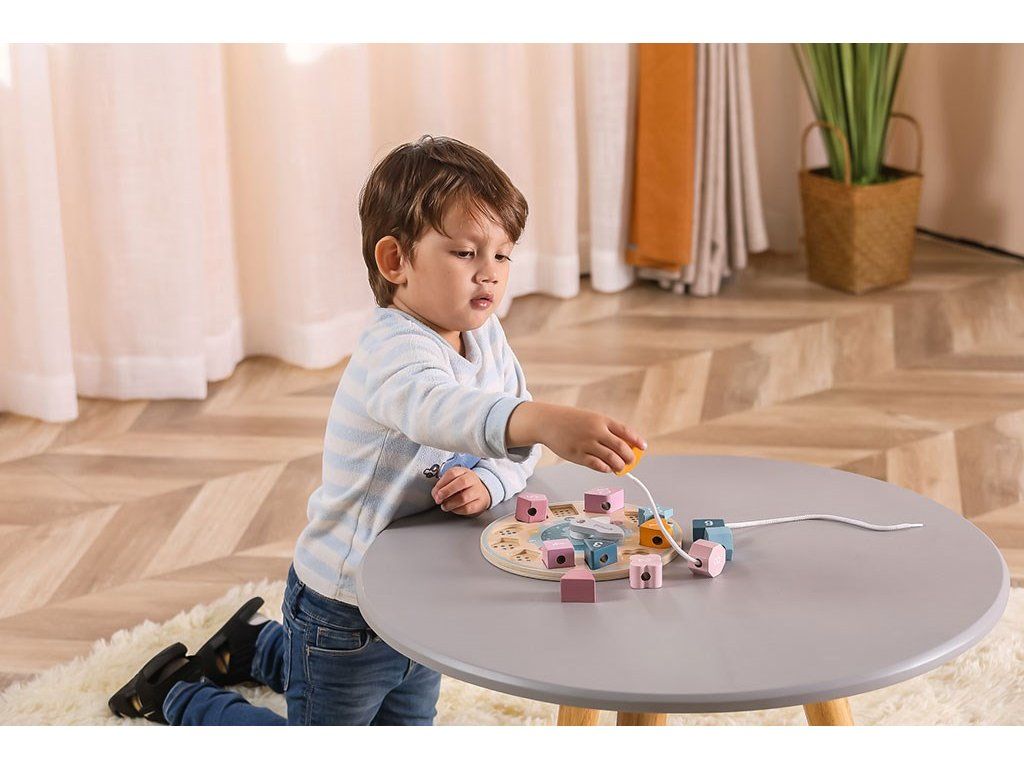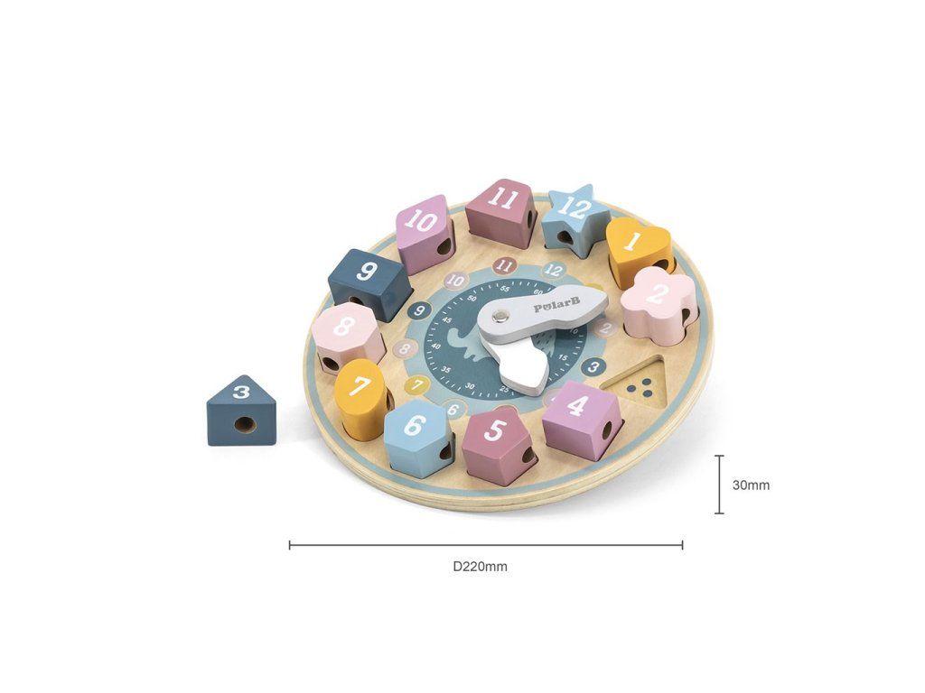 Hračka v tvare hodinového ciferníka má 2 pohyblivé ručičky, 12 geometrických blokov a šnúrku. Všetky bloky majú aj otvor, cez ktorý sa dajú navliecť ako korálky.