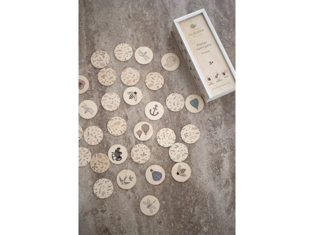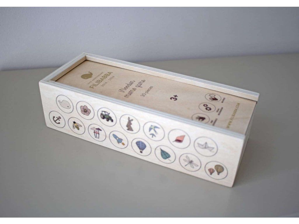 Oslávte 10 rokov FILIBABBA s úžasnými dizajnmi z limitovanej edície. Môžeme hrať ešte jedno kolo? Zlepšite pamäť, rozpoznávanie a sústredenie svojho dieťaťa – to všetko pri zábave. Limitovaná edícia pexesa vyrobená z pevnej preglejky obsahuje 30 dielikov s krásnymi prvkami z najobľúbenejších potlačí FILIBABBA, ktoré určite vzbudia zvedavosť malých aj väčších detí. Prémiová hra, ktorú si zapamätáte, sa dodáva v kvalitnom drevenom boxe na uskladnenie. Táto položka je súčasťou FILIBABBA Anniversary Collection a je dostupná v exkluzívnej limitovanej edícii. Pexeso FILIBABBA je vhodné pre batoľatá od 3 rokov a zamiluje si ho celá rodina. Moje špeciálne vlastnosti:- Zábavná rodinná hra