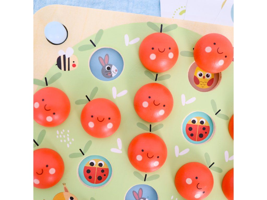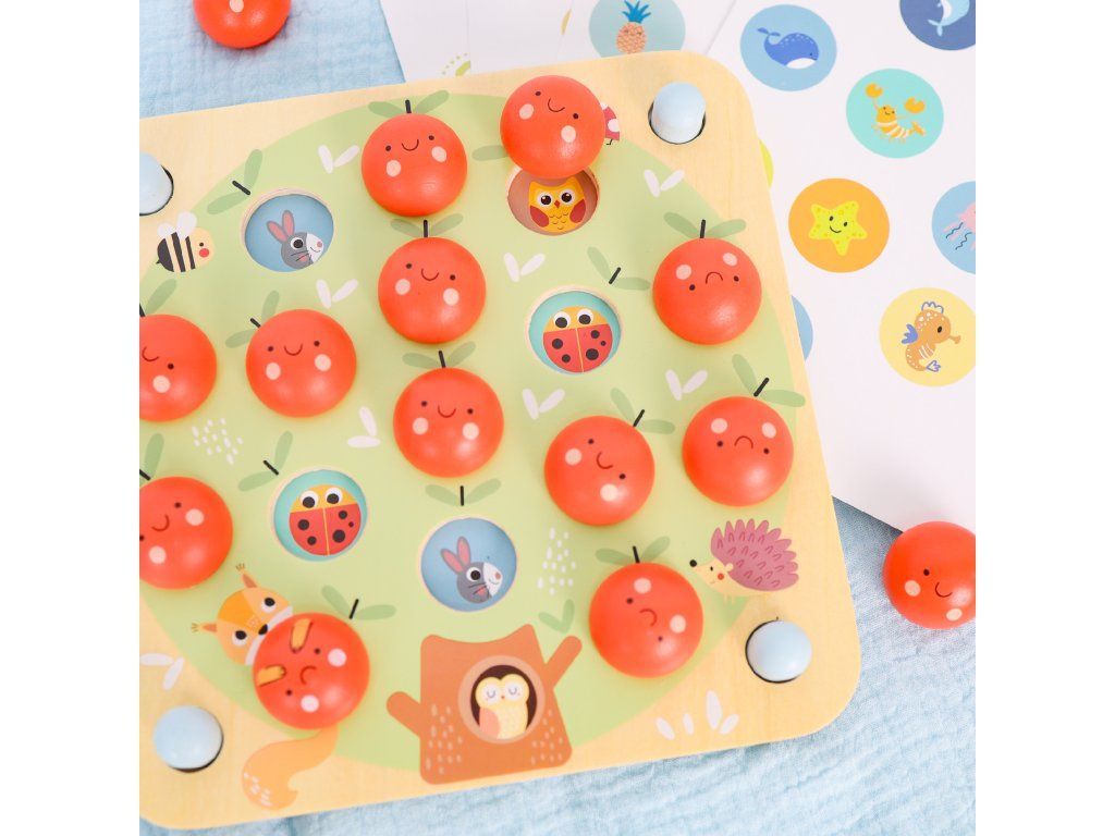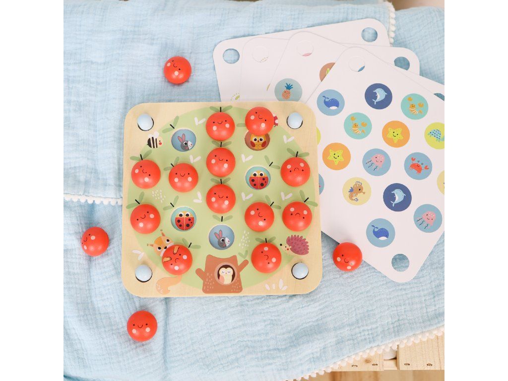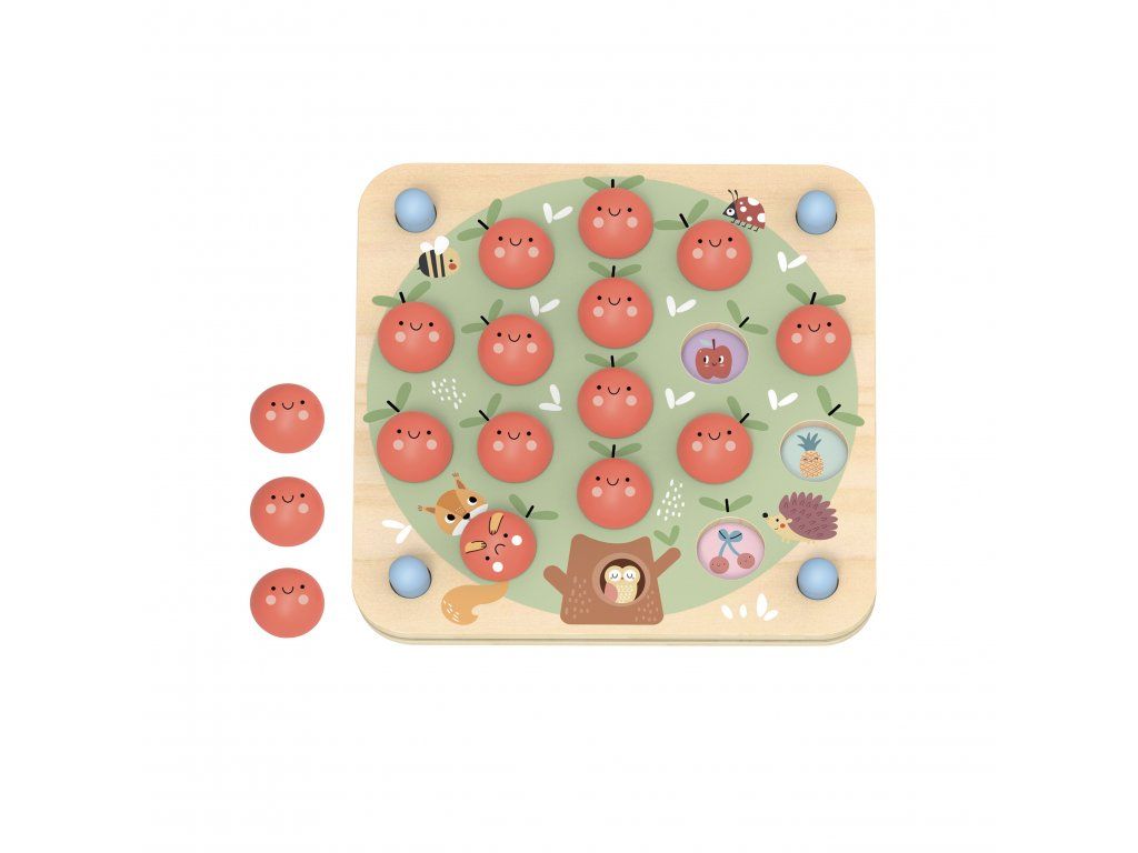 Drevené Pexeso Jablká PastelPamäťová hra s jablkami a stromom – zábava aj učenie v jednomDrevené pexeso Jablká od Tooky Toy v nežných pastelových farbách zaujme deti svojim originálnym prevedením a variabilitou hry. Hra sa totiž mení podľa toho, akú z 10 predlôh práve vložíte do veľkého dreveného stromu. Budú to autá, zvieratká, čísla alebo tvary? Do otvorov na strome potom umiestnite 16 drevených jabĺčok. Následne hráči dávajú preč vždy 2 jabĺčka a zisťujú, či sa pod nimi skrývajú rovnaké obrázky. Čím táto hra nadchne malých hráčov?Trénuje pamäť, pozornosť a sústredenie – ideálna ako prvá spoločenská hraPodporuje jemnú motoriku a koordináciu ruka–oko pri manipulácii s jabĺčkami10 rôznych predlôh prináša stále nové varianty a dlhú hrateľnosťNežné pastelové farby pôsobia upokojujúco a krásne zapadnú do detskej izbyKvalitné drevené spracovanie a netoxické farby zaručujú bezpečné hranieVhodné pre deti od 3 rokov – zábava, učenie a trénovanie mysle v jednomTu nájdete pravidlá hryDodatočné parametre