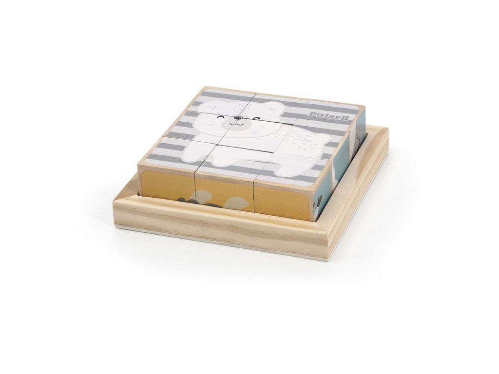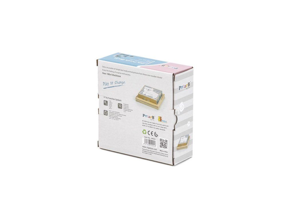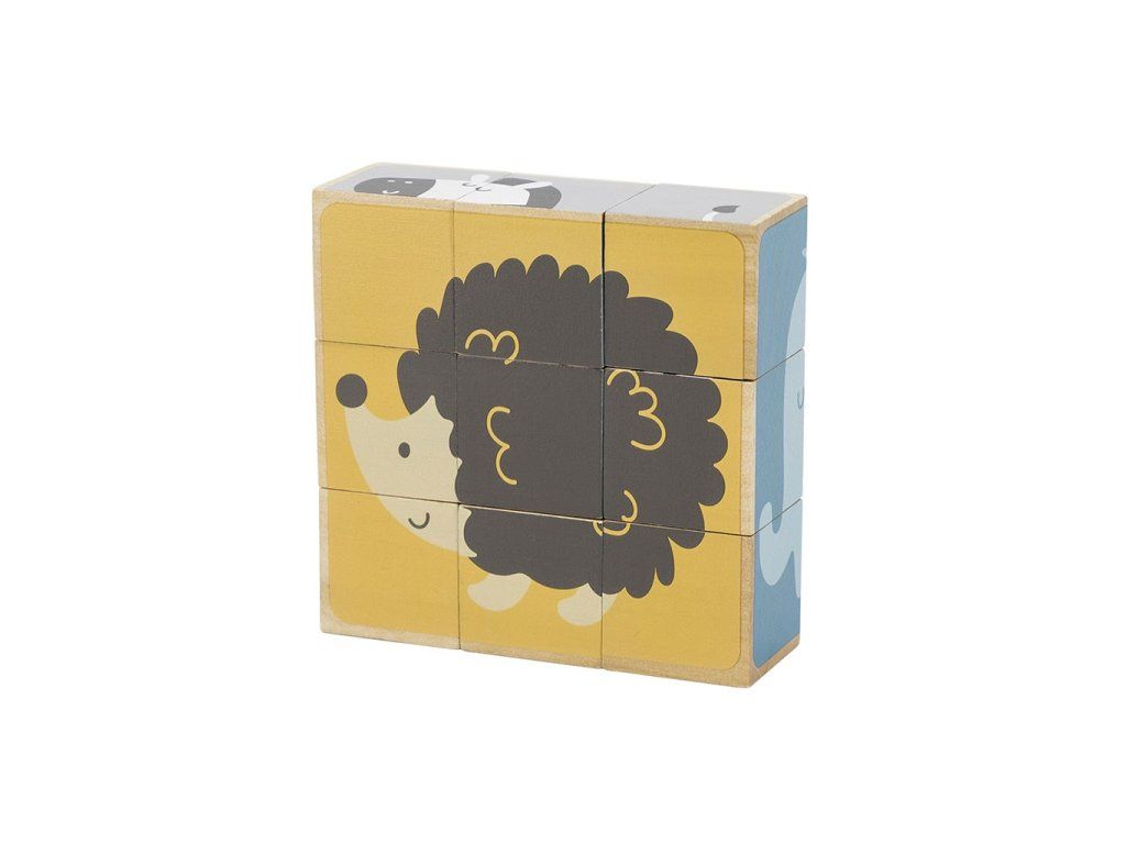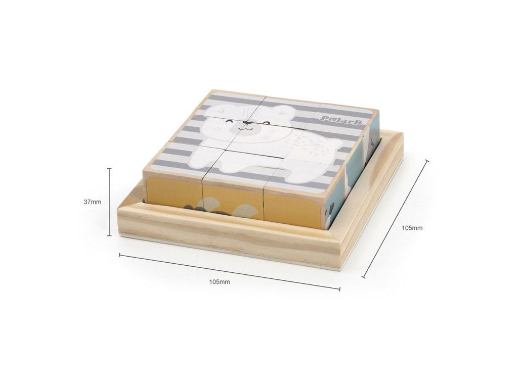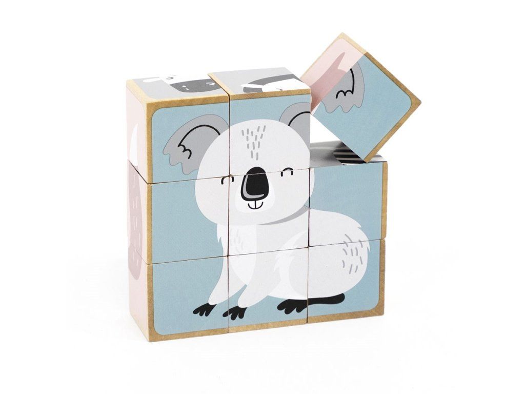Rozvíjajte zručnosti svojho dieťaťa pomocou klasickej hračky z drevených kociek. S 9 kockami vaše dieťa vytvorí 6 obrázkov na drevenom podklade znázorňujúcich tieto zvieratá: zebru, medveďa koalu, medveďa, slona, sliepku a ježka.