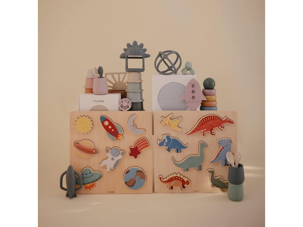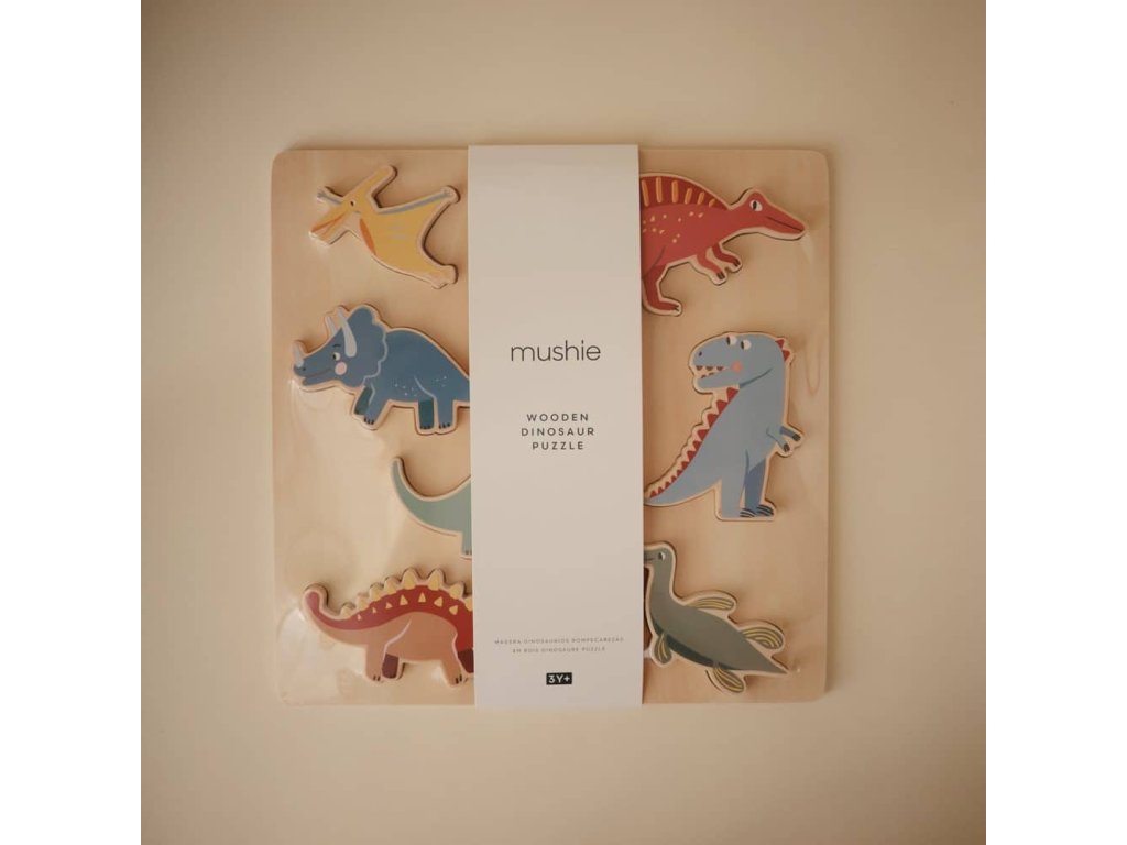 Drevené kolekcie puzzle od Mushie pre malých žiakov! Vyberte si medzi dvoma zábavnými a náučnými témami, všetky sú vyrobené z dreva s certifikátom FSC a netoxickej farby pre bezpečnú a ekologickú hru.- Dino puzzle: Predstavte praveké zázraky pre najmenších pomocou dreveného puzzle Dino. Táto nadčasová hračka zlepšuje schopnosti farebného a priestorového uvažovania. Sedem dielikov s tematikou dino s hladkými hranami je ideálnych pre drobné ručičky, zlepšuje jemnú motoriku a koordináciu.