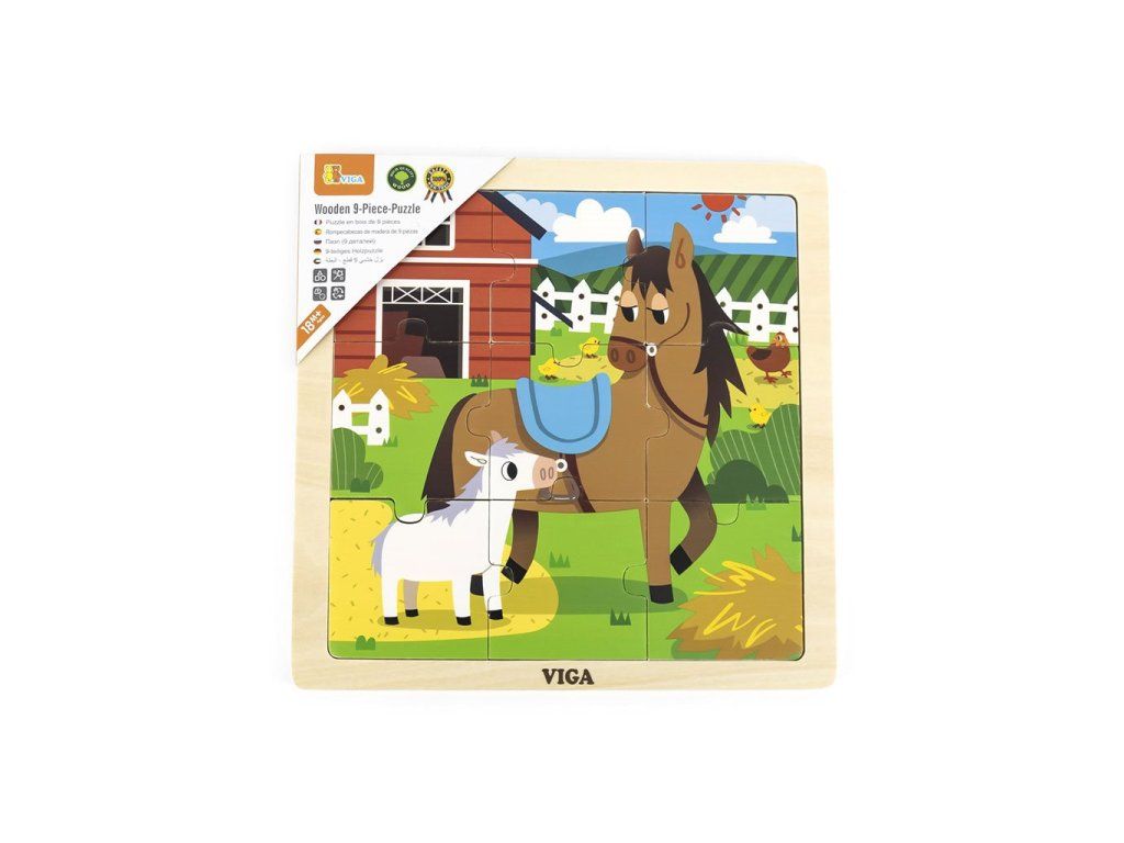 Klasická plochá skladačka ideálna pre dieťa od 18 mesiacov veku. Skladá sa z dosky s obrazom a 9 dielikov. Obraz ukazuje kone s žriebätkom na farme.