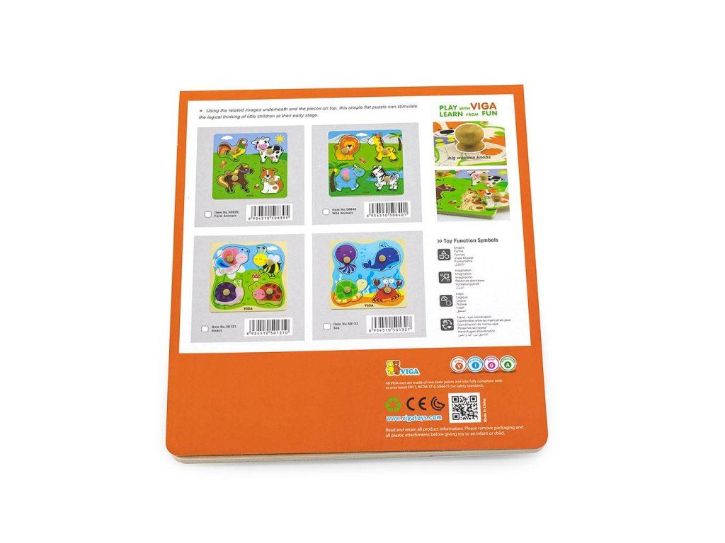 Toto krásne puzzle s obrázkami rôzneho hmyzu je jednoduché ploché puzzle. Dieliky puzzle sú vybavené drevenými kolíčkami, vďaka ktorým môžu batoľatá puzzle ľahko uchopiť do rúk a umiestniť na správne miesto na drevenom podklade.