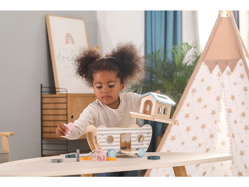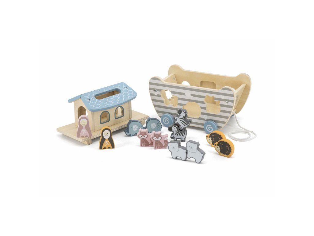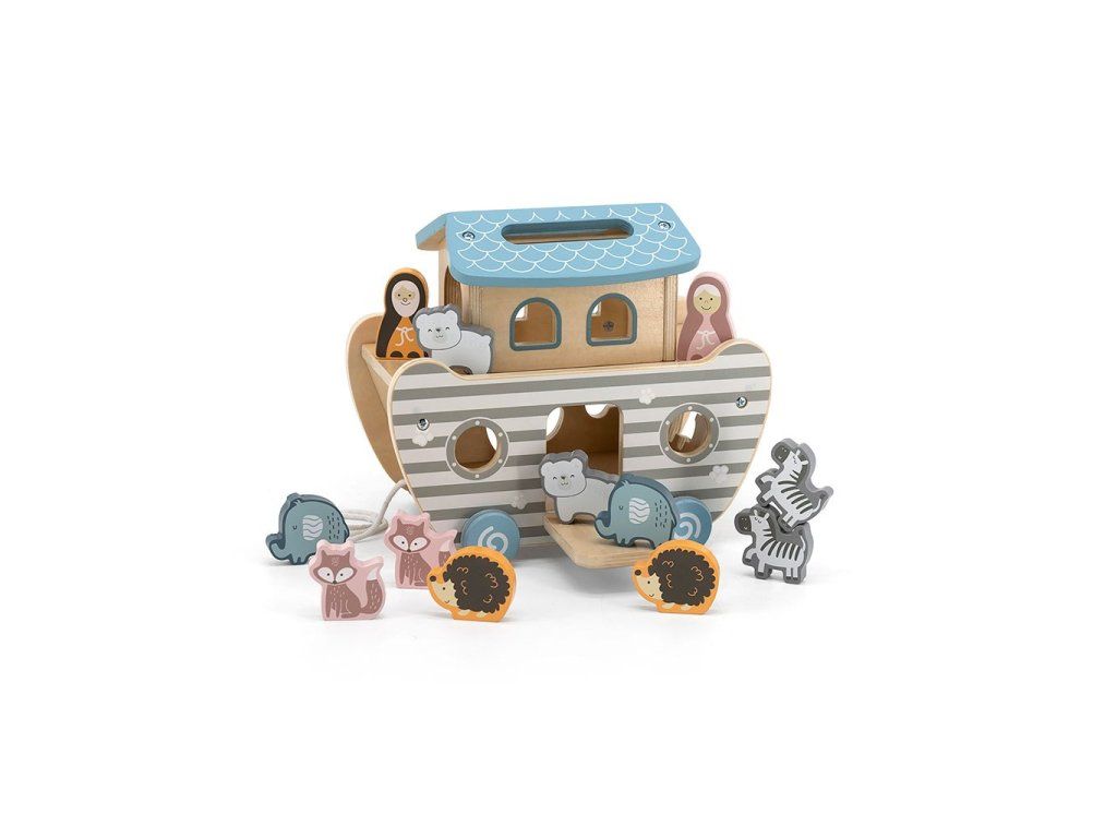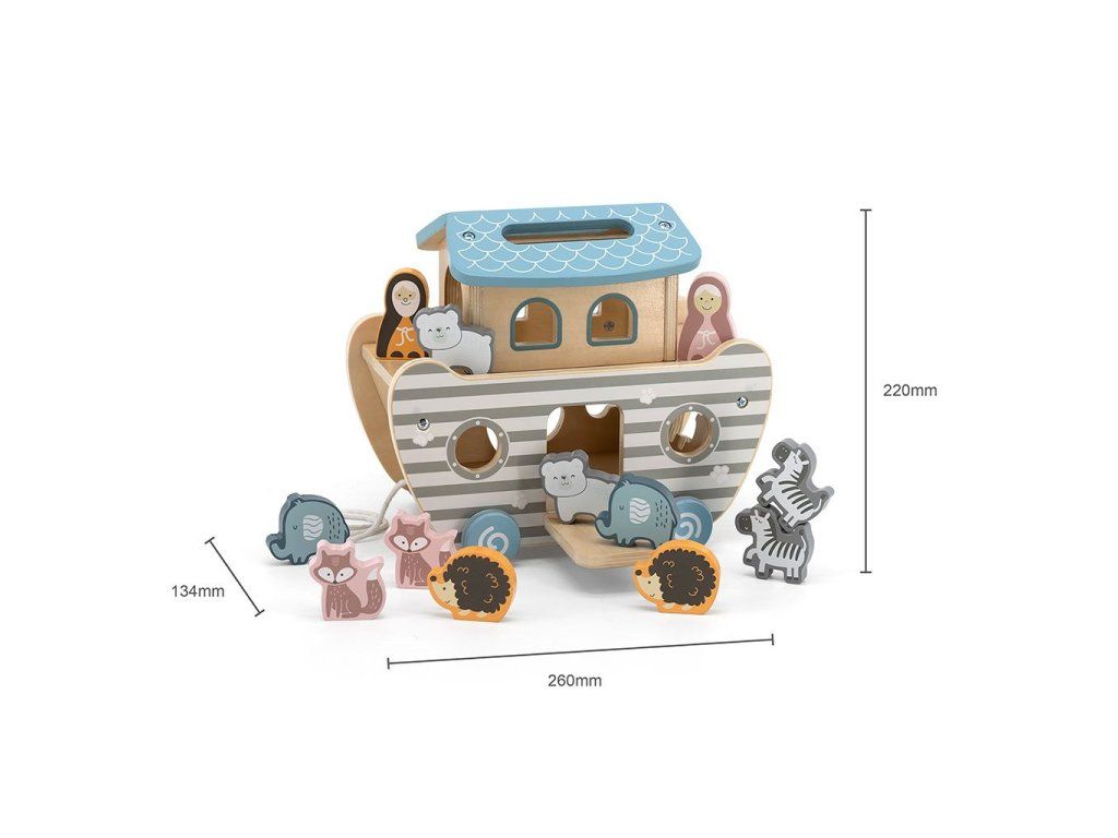 Hračka sa skladá z postavičiek Noeho a jeho manželky, 5 dvojíc zvieratiek (slony, líšky, ježkovia, zebry a ľadové medvede) a loďky na kolieskach s priloženou šnúrkou na ťahanie. V streche archy je vyrezaná rukoväť na zdvíhanie a na boku sú otváracie dvere.