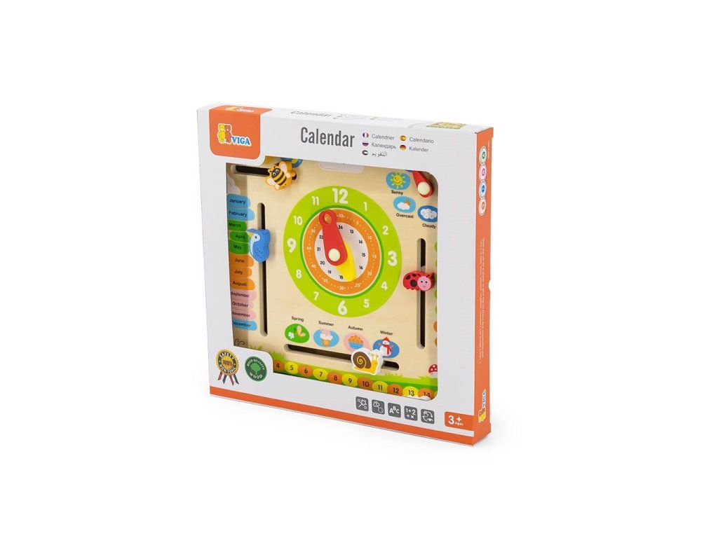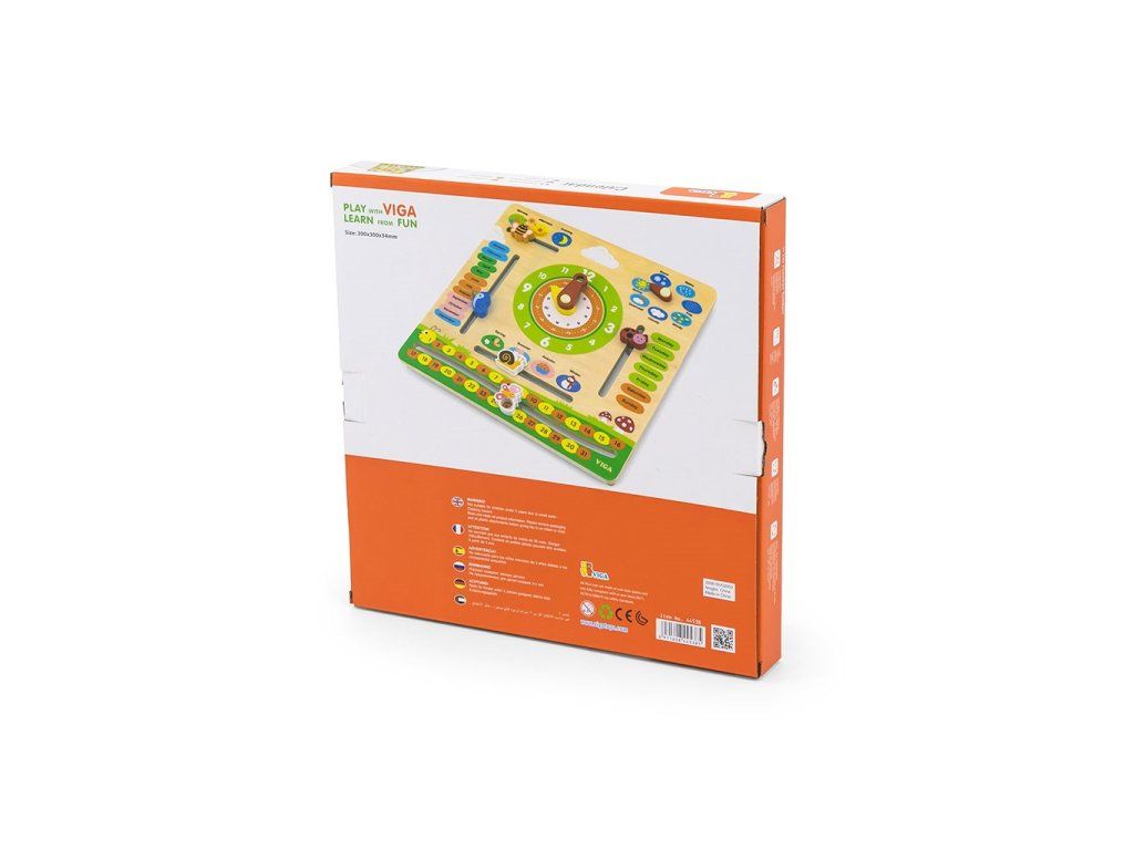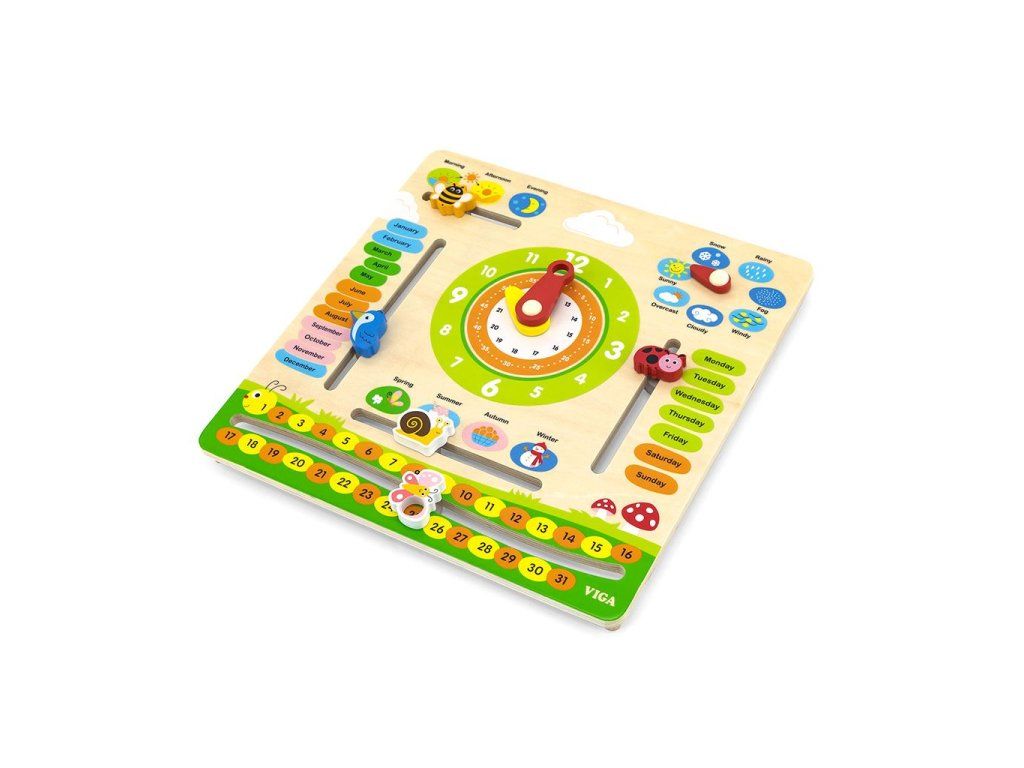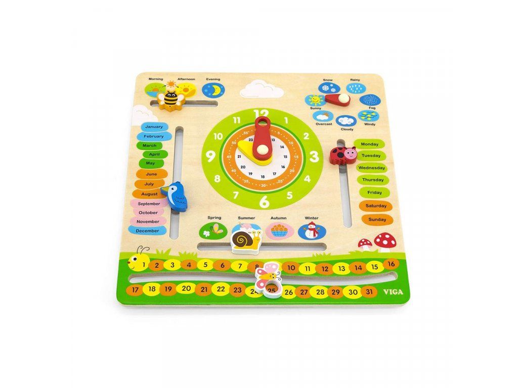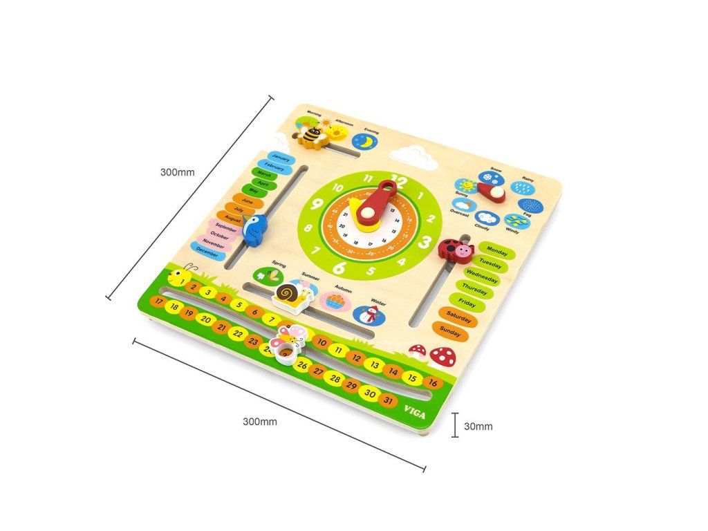 Objavovanie sveta s dreveným kalendárom s hodinami v angličtine od Viga Toys je ideálna "vzdelávacia" a darčeková sada, vhodná na hodiny angličtiny ako názorný materiál. Učenie hodín na analógových hodinách bude s tabuľkou Viga jednoduchšie a hra s kalendárom podporí učenie sa čítať a písať dátum. Dieťa sa naučí názvy mesiacov, dní v týždni, ročných období a dní a pojmy súvisiace s počasím v angličtine. S učebnou tabuľou budú môcť rýchli žiaci objavovať a učiť sa a zároveň sa zabávať. Súprava na učenie času je vhodná aj na rozvoj Montessori. Ideálna hračka na zavesenie doma, v škôlke alebo v škole.