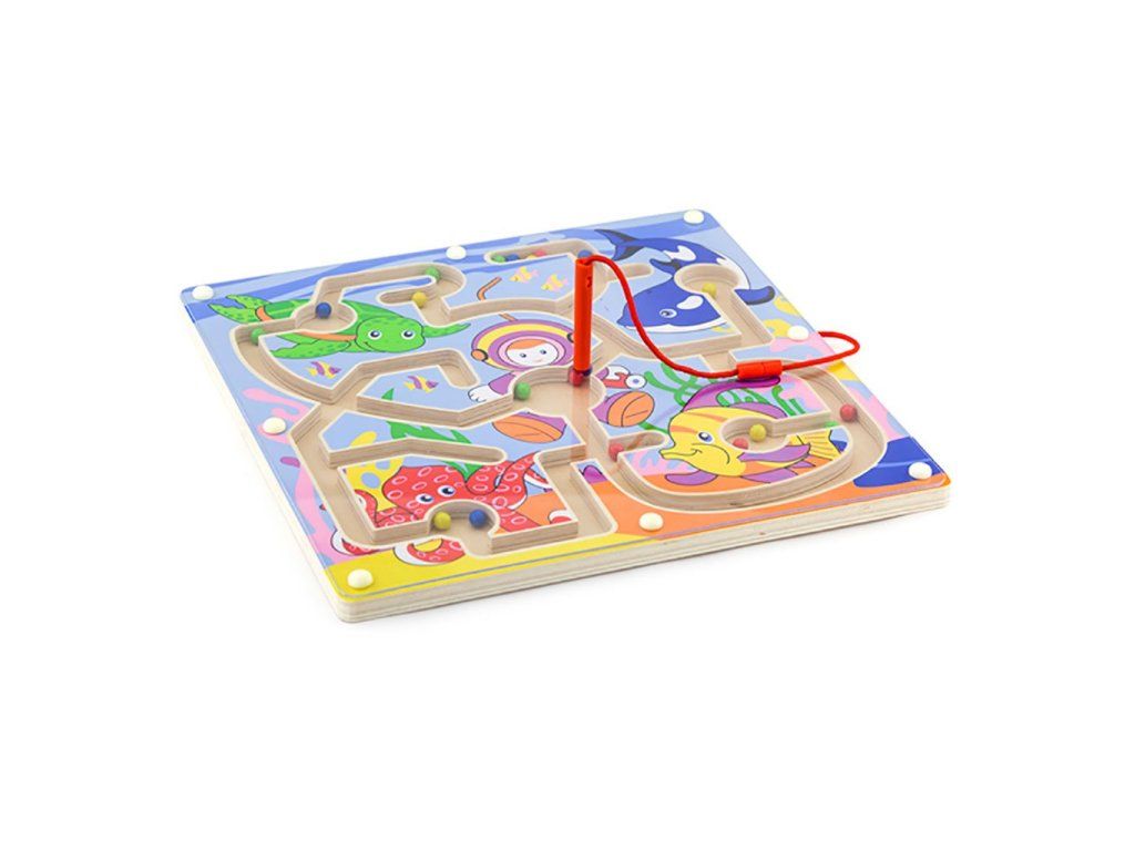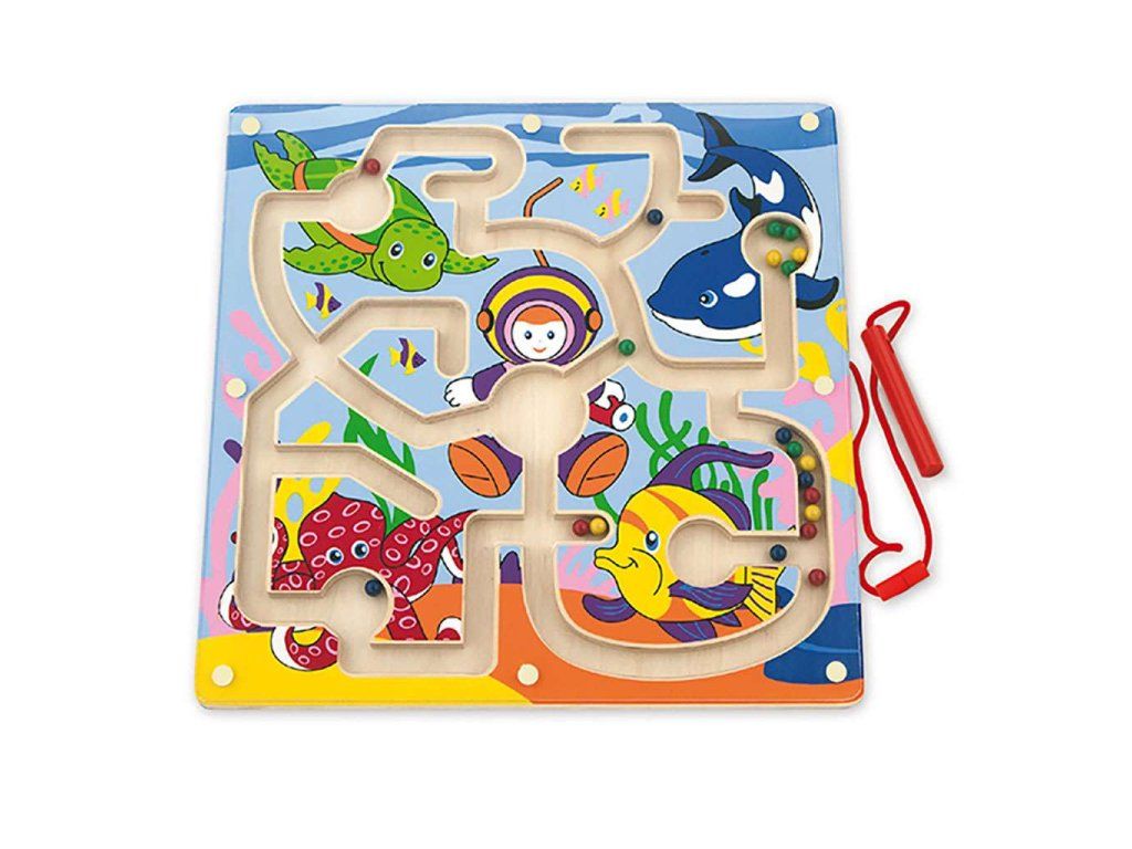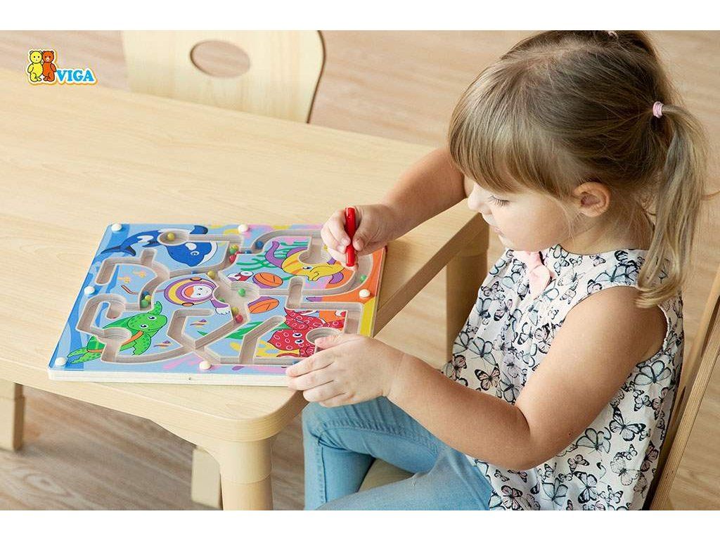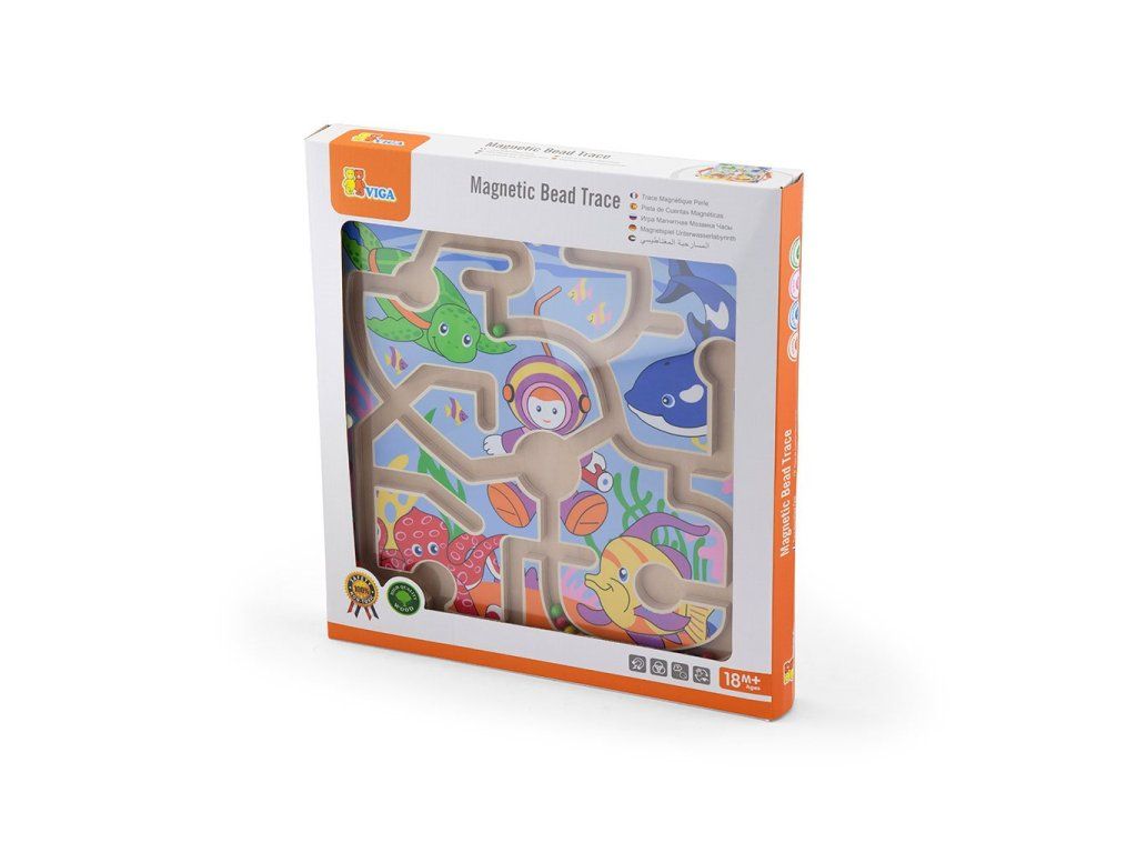 Magnetický podmorský svet od spoločnosti Viga je ideálny darček, ktorý poteší každé dieťa. Drevená tabuľa obsahuje kresbu zobrazujúcu podmorský svet a bludisko s guličkami. Batoľa pomocou magnetickej "ceruzky" vedie príslušný počet guľôčok k rôznym podmorským živočíchom. Nasmerovaním guľôčok, ktoré drží veselý potápač, sa dieťa vydáva na cestu za : delfínom, korytnačkou, chobotnicou a rybou, pričom cestou míňa rôzne prírodné útvary, ako sú morské riasy a koraly, a objavuje tak svet v hlbinách oceánu. Celé je to chránené priehľadným oknom z plexiskla.