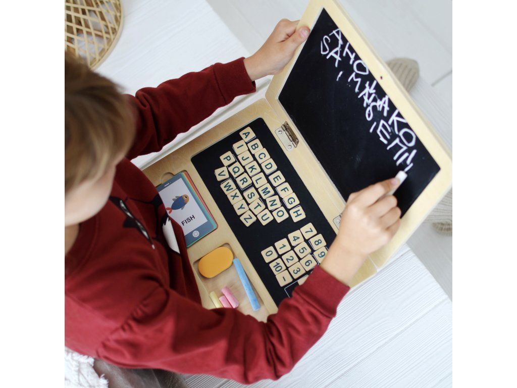 Drevený notebook s tabuľou Učenie slovíčok a kreslenie nikdy nebolo zábavnejšie! Drevený notebook s magnetickou tabuľou, magnetkami všetkých abecedných písmen a čísiel od 0 do 9.Na obrazovku si môže dieťa kresliť pestrými kriedami. Súčasťou balenia je aj guma na zotretie a sada kartičiek s ilustráciami a názvami rôznych zvierat či vecí.Dodatočné parametre