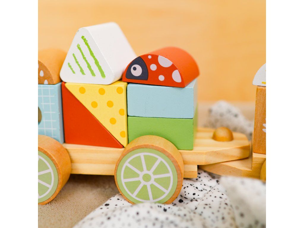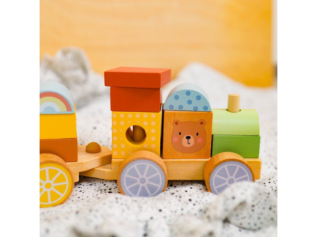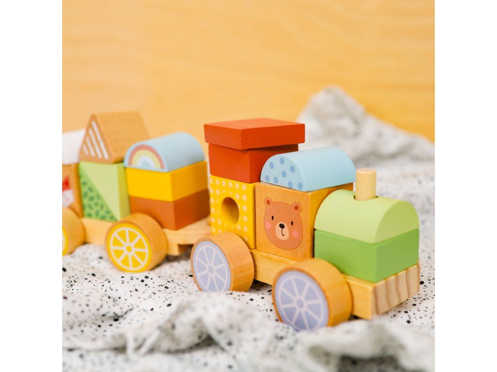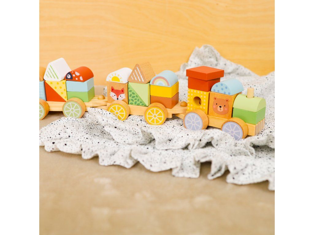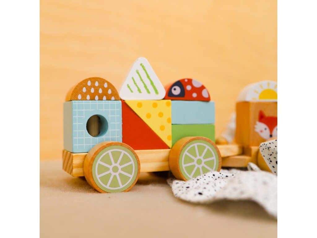 Drevený vláčik Lesné Zvieratká Vláčik, stavebnica aj nasadzovanie v jednom Skladací drevený vláčik značky Tooky Toy zaujme všetkých nadšencov do vlakov, autíčok aj stavebníc. Súprava obsahuje drevenú lokomotívu a dve vozidlá, na ktoré môžu deti podľa ľubovôle nasadzovať rôzne dieliky. Niektoré sú v podobe zvieratiek, iné v podobe rôznych tvarov. Lokomotíva a vagóny sa dajú do seba krásne zapojiť.Vhodný už pre deti od 18 mesiacov Deti si pri hre s vláčikom zlepšujú jemnú motoriku, koordináciu ruka-oko a rozvíjajú predstavivosť. Učia sa aj farby, tvary a rozvíjajú si slovnú zásobu. Stohovací vláčik je vyrobený z dreva z udržateľného lesníctva, natretý netoxickými farbami a pre deti je bezpečný.Dodatočné parametre