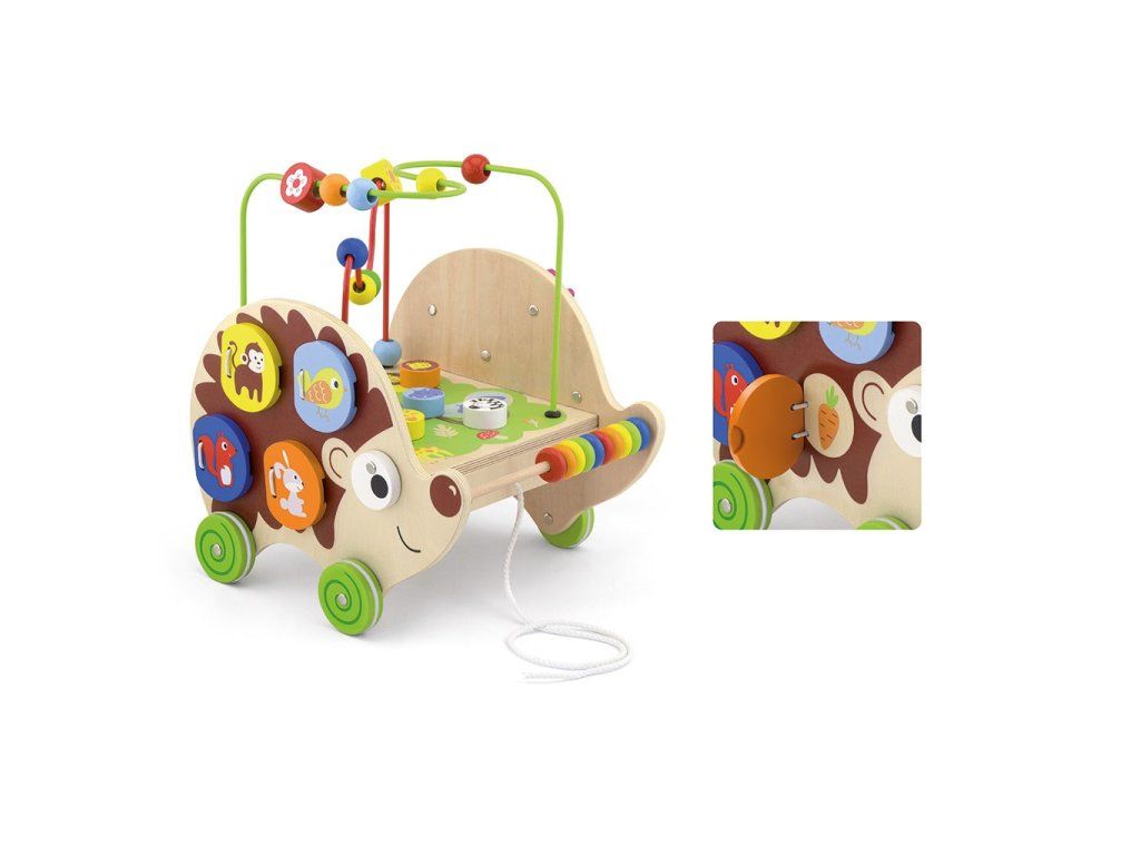 Priestorové bludisko v podobe rozkošného ježka je multifunkčná hračka na ťahanie. Ježko poskytne vášmu dieťaťu hodiny zábavy plnej atrakcií. Prvou sú korálky priamo pri Ježkovom nose, ktoré možno použiť ako počítadlo. Ďalšou atrakciou sú farebné korálky rôznych tvarov a farieb, ktoré sa dajú voľne pohybovať po kovových tyčiach. V spodnej časti priestorového bludiska sa nachádza druhé dráhové bludisko, kde má batoľa za úlohu správne priradiť hlavy zvieratiek k obrázku, ktorý treba nájsť. Na zadnej strane Ježka sa nachádzajú ďalšie atrakcie: na jednej strane sú ozubené kolieska, ktoré prinesú veľa zábavy každému dieťaťu; zatiaľ čo na druhej strane sú Ježkovi kamaráti. Pod ich obrázkami sa nachádzajú pochúťky príslušného zvieratka. Ježko sa rád vydá na cestu s vaším dieťaťom - má šnúrku a kolieska s protišmykovým uzáverom.