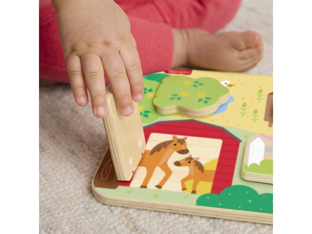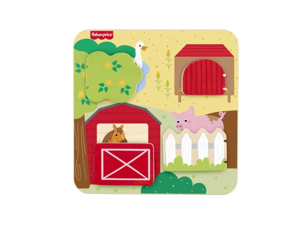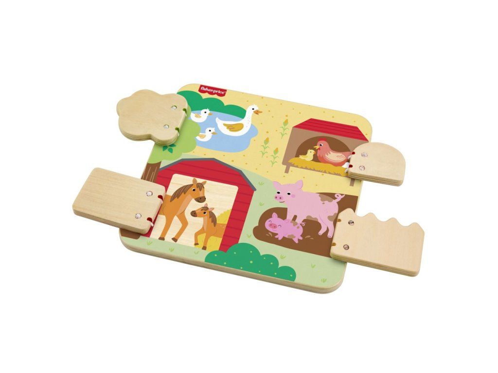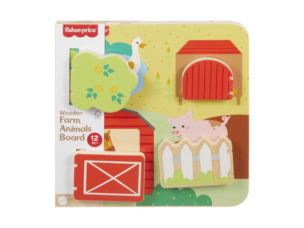 Drevená doska so zvieratkami z farmy od Fisher-Price® je plná zábavných prekvapení! Táto hracia doska, ktorá je vyrobená z dreva z dobre obhospodarovaných zdrojov s certifikátom Forest Stewardship Council (FSC C004225), obsahuje 4 dvierka, ktoré sa otvárajú a odhaľujú rôzne priateľské zvieratká z farmy a ich mláďatká.Dodatočné parametre