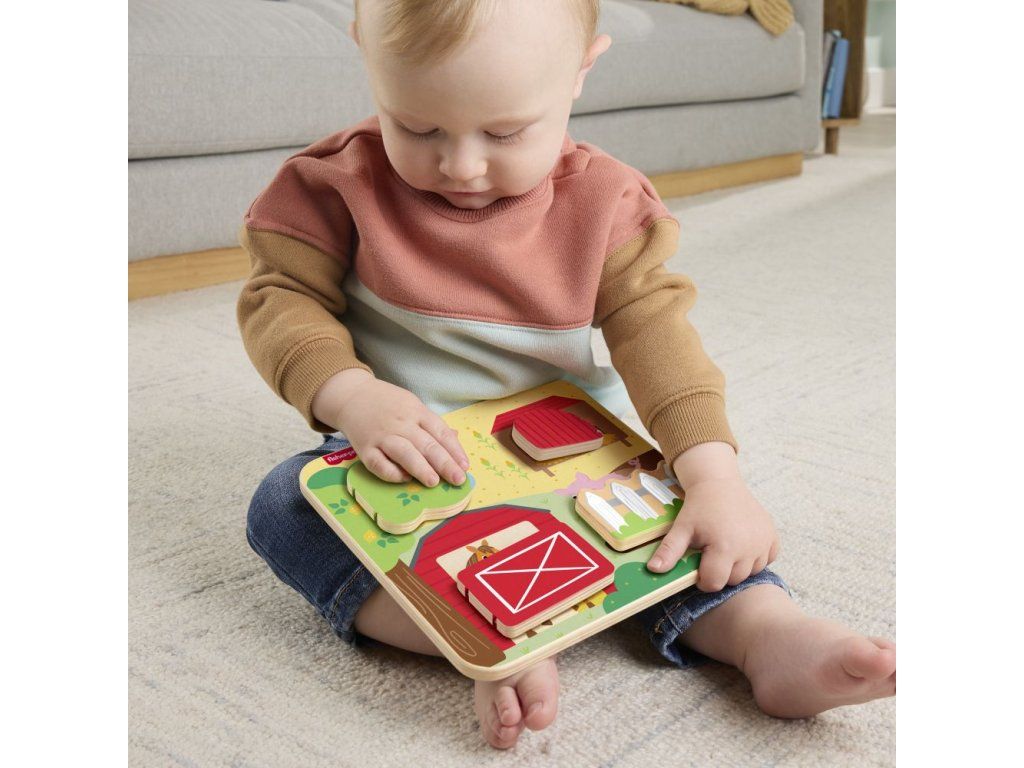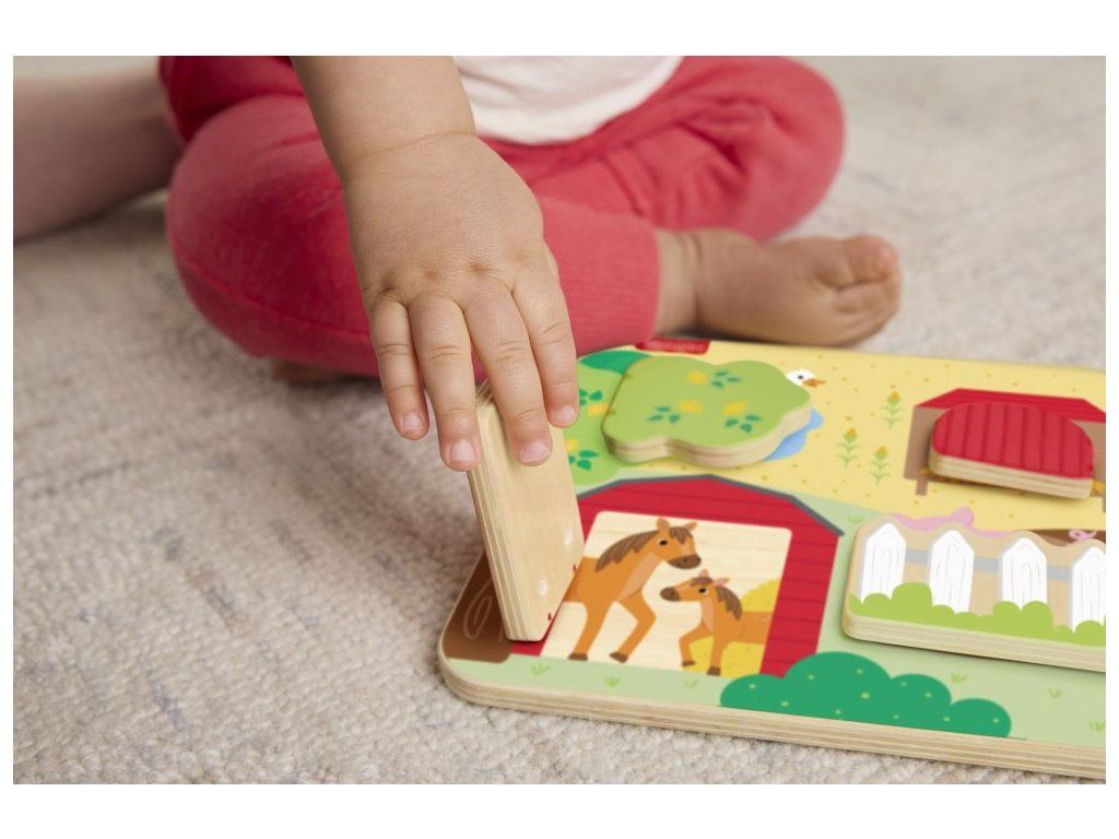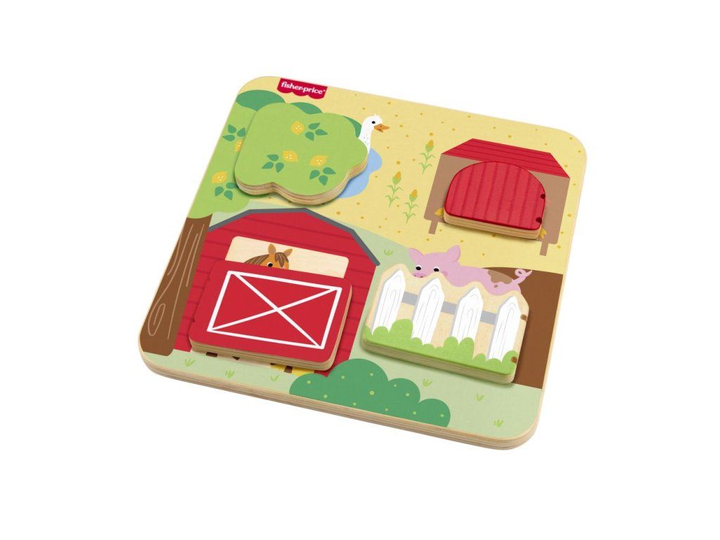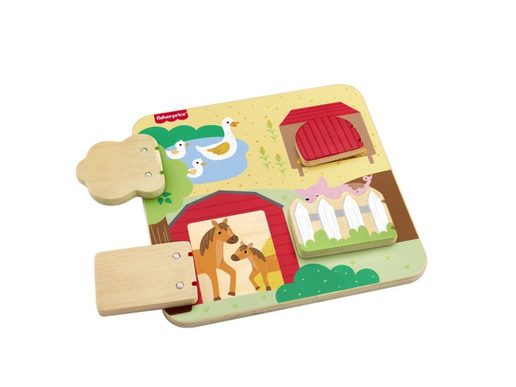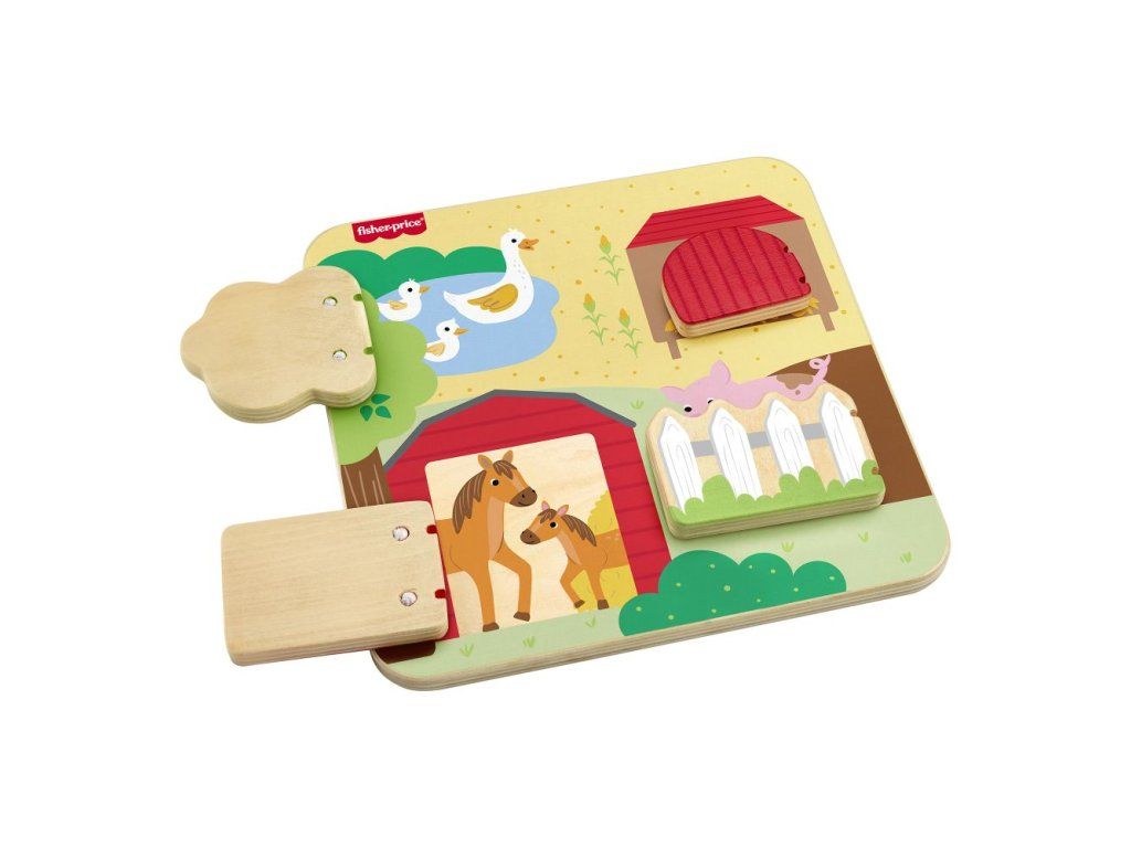Drevená doska so zvieratkami z farmy od Fisher-Price® je plná zábavných prekvapení! Táto hracia doska, ktorá je vyrobená z dreva z dobre obhospodarovaných zdrojov s certifikátom Forest Stewardship Council (FSC C004225), obsahuje 4 dvierka, ktoré sa otvárajú a odhaľujú rôzne priateľské zvieratká z farmy a ich mláďatká.Dodatočné parametre