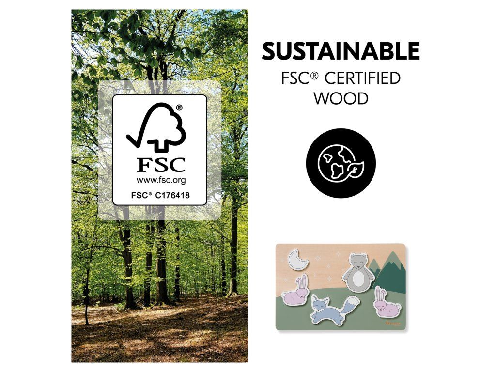 UDRŽATEĽNÁ HRAČKA VYROBENÁ Z DREVA S CERTIFIKÁTOM FSC® // Táto hračka je vyrobená z dreva, ktoré pochádza z lesov s certifikátom FSC®, a poskytuje zábavu na dlhý čas. Tým sa zabezpečuje udržateľné a ekologické obhospodarovanie lesov, ktoré chráni rastliny a zvieratá.