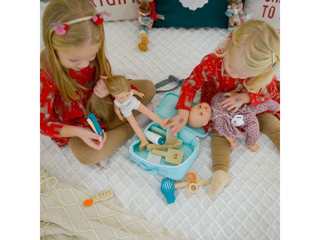Kadernícka sada v kufríku 11 ks Poďme sa hrať na kadernícky salón! Drevený kadernícky set pre deti v textilnom kufríku značky Tooky Toy umožní deťom otvoriť si vlastné kaderníctvo či holičstvo. Vďaka bohatej drevenej výbave, ako sú nožnice, holiaci strojček, fén, hrebeň, zrkadlo, žehlička na vlasy a ďalšie, sa deti budú cítiť ako skutoční profesionáli. Všetky vybavené po práci zase upratajú do látkového kufríka a vezmú k ďalšiemu zákazníkovi.Kadernícky kufrík s vybavením podporí rozvoj detí Hra na kaderníctvo či barber shop, rovnako ako ostatné rolové hry, pomáha deťom v rozvoji ich zručností, ako je jemná motorika, sociálne zručnosti, komunikácia, rozprávanie a ďalšie. Pomôže im aj pri zvládaní strachu z návštevy kaderníctva. Kadernícky set pre deti je skladný, takže ho ľahko vezmete so sebou k starým rodičom či na dovolenku. Drevené hračky pre deti značky Tooky Toy sú vyrobené z kvalitných materiálov s ohľadom na životné prostredie. Celý set je tak veľmi bezpečný a netoxický.Dodatočné parametre